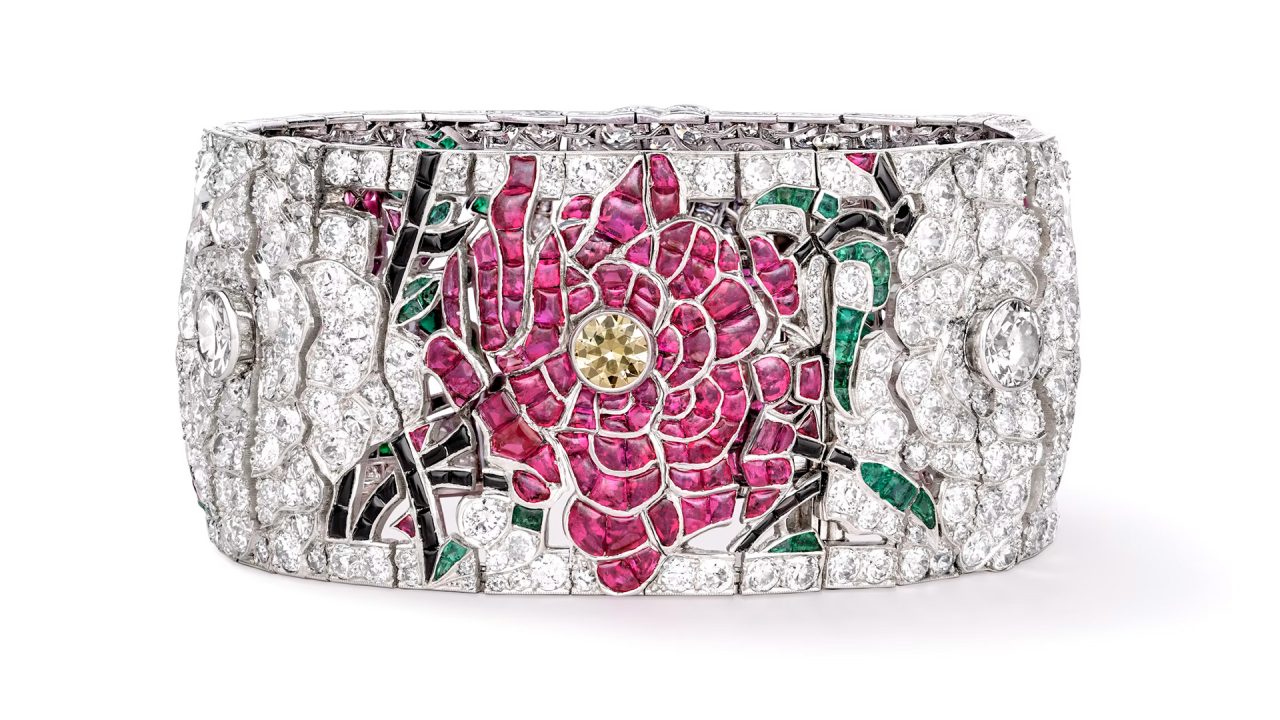 絡み合う花々、赤と白のローズ ブレスレット 1924年 プラチナ、エメラルド、ルビー、オニキス、イエローダイヤモンド、ダイヤモンド ヴァン クリーフ&アーペル コレクション © Van Cleef & Arpels
