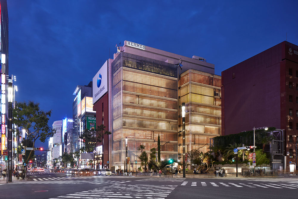 数寄屋橋交差点に建つ、銀座メゾン エルメスは2001年に誕生した日本旗艦店。Renzo Piano (レンゾ・ピアノ) が手がけたガラスブロックの建物は、銀座を代表する名建築の一つだ。夜になると、1万3000個のガラスブロックからランタンのような優しいあかりが漏れ、銀座の街をドラマティックに照らす。8階にはエルメス財団が運営するアート・ギャラリー〈フォーラム〉があり、国籍問わず、気鋭の活動を行うアーティストの作品展示をするほか、エルメスらしい技術の伝承にまつわる展示や環境問題、教育などに関わる企画を行っている。また、1階のウィンドウ・ディスプレイは “街に開かれたエルメス劇場” と位置づけ、エルメスの年間テーマに紐付いて、アーティストやデザイナーが自由な表現を行う場として活用。10階には予約制のミニシアター、ル・ステュディオがあり、年間テーマに基づいた名作を上映。ブランドが提案する世界観を映像で堪能できる。