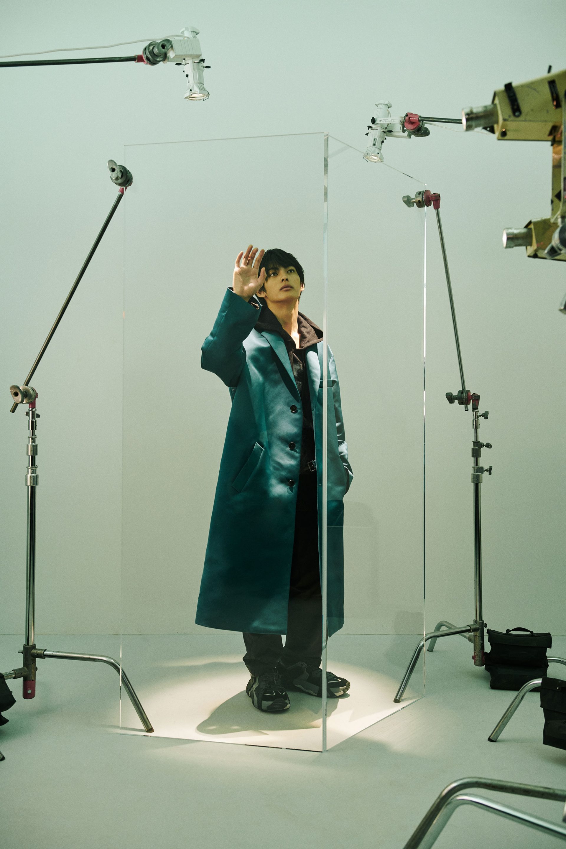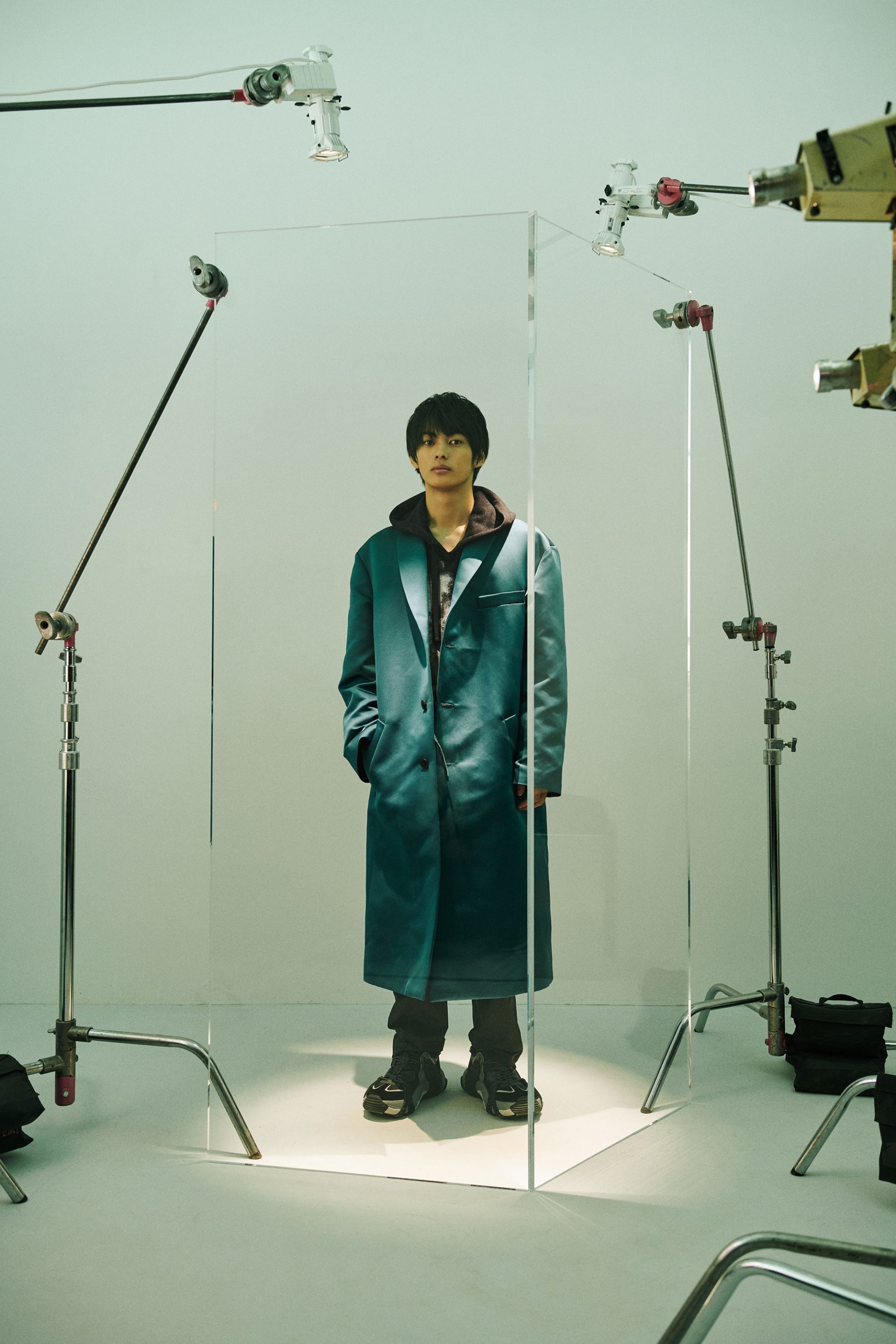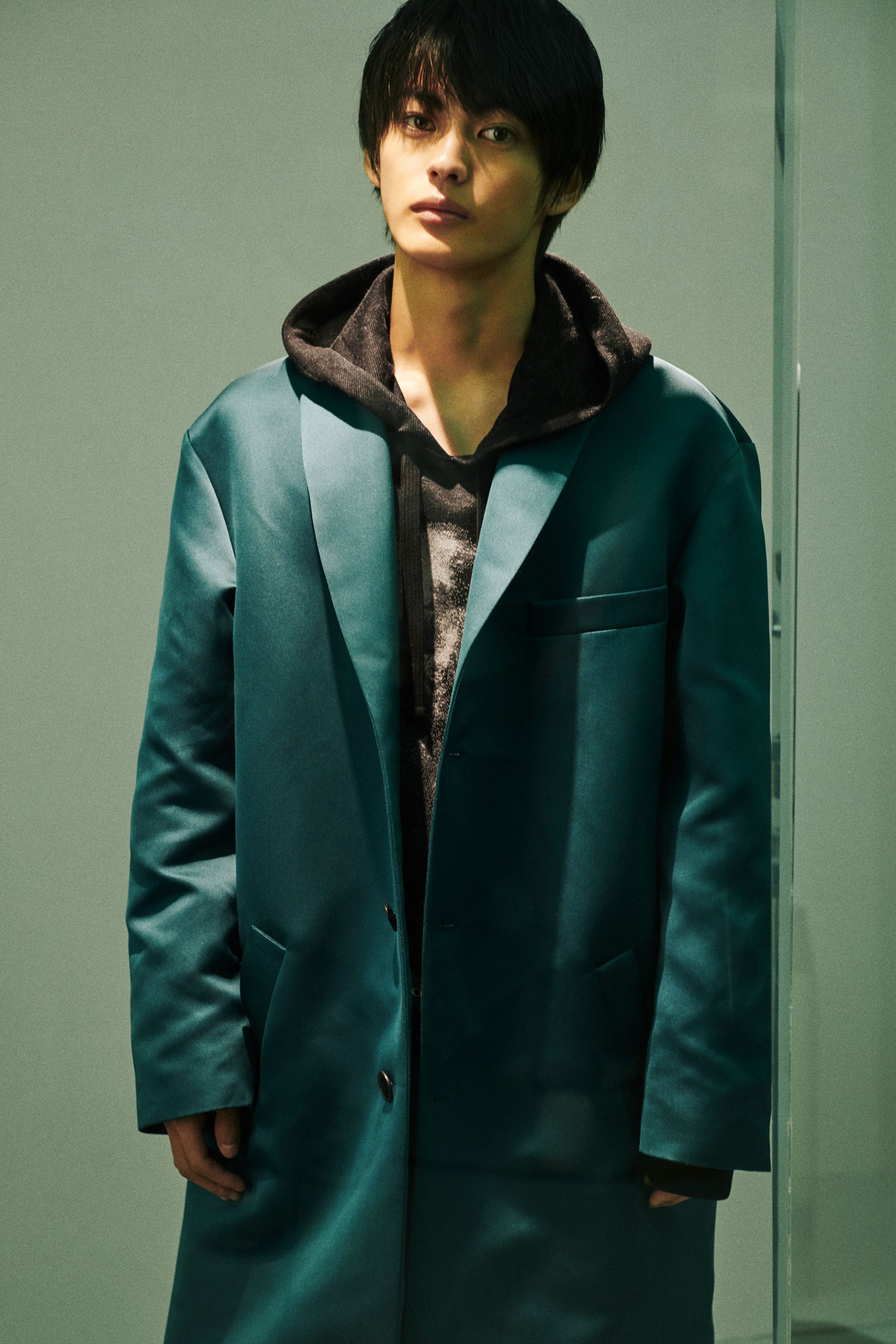 ラストのルックは、“COLOR COUTURE (カラークチュール)” と呼ばれるシリーズから、美しいフォレストグリーンのコートをセレクト。上質のダッチェスシルクサテンをダブルでたっぷりと使ったロング丈は、あえてオーバーサイズで羽織り、中にはカジュアルなフーディーを差し込んで、クラシックとストリートのバランスをとる。ちらりと覗く “MOONDUST (ムーンダスト)” のグラフィックは、プリントではなくジャガードで表現されており、さりげなくラグジュアリーの感触を伝える仕上がり。