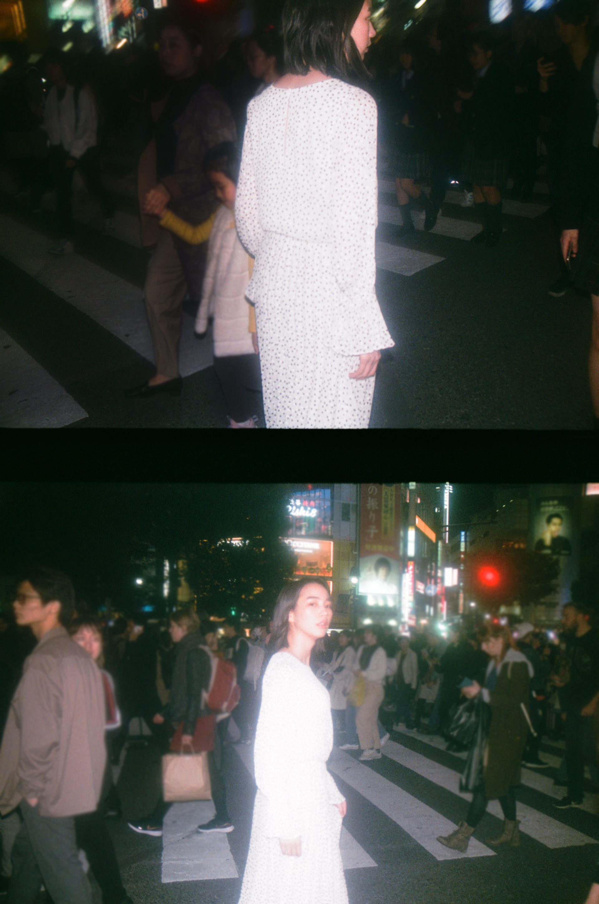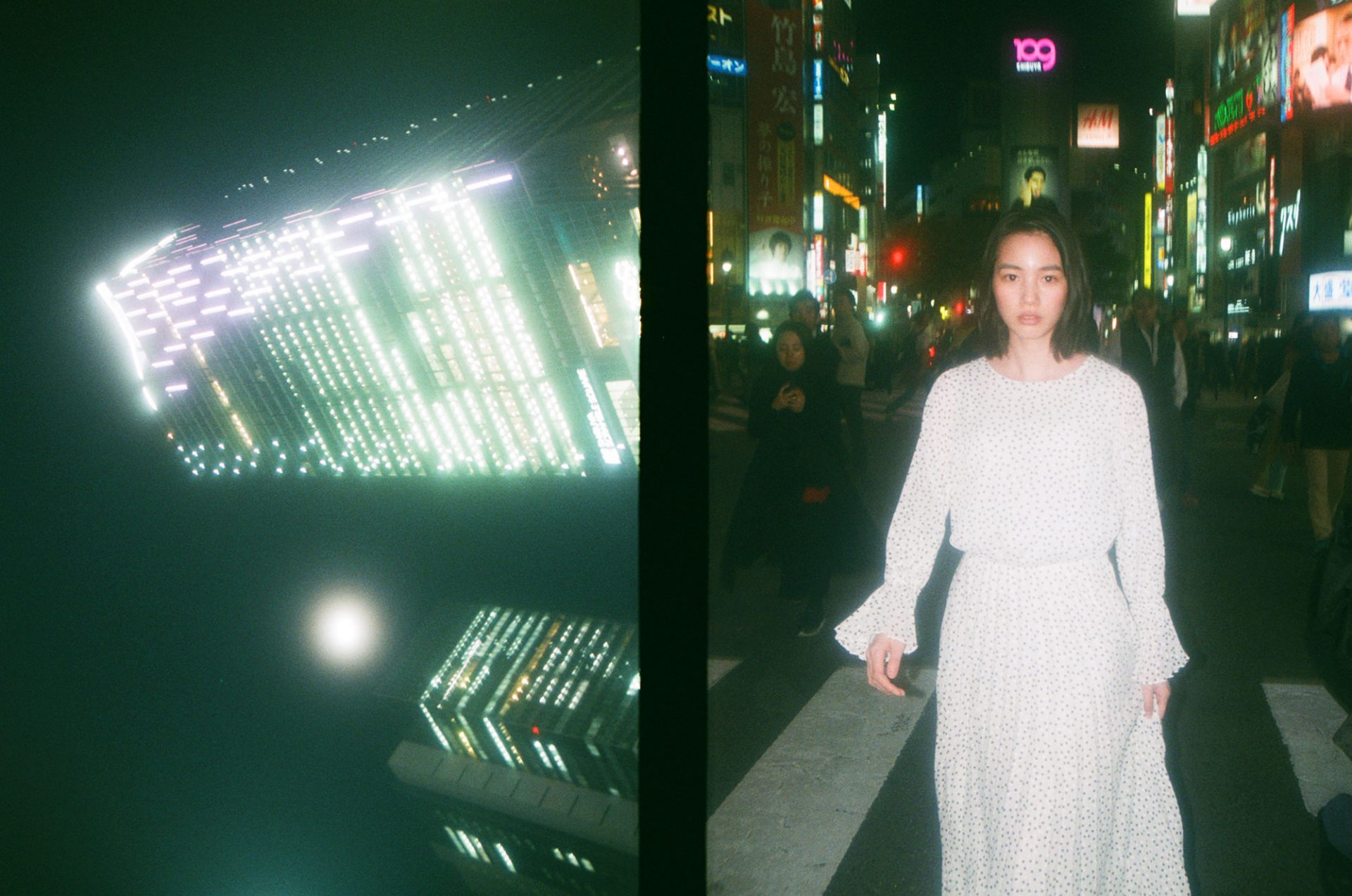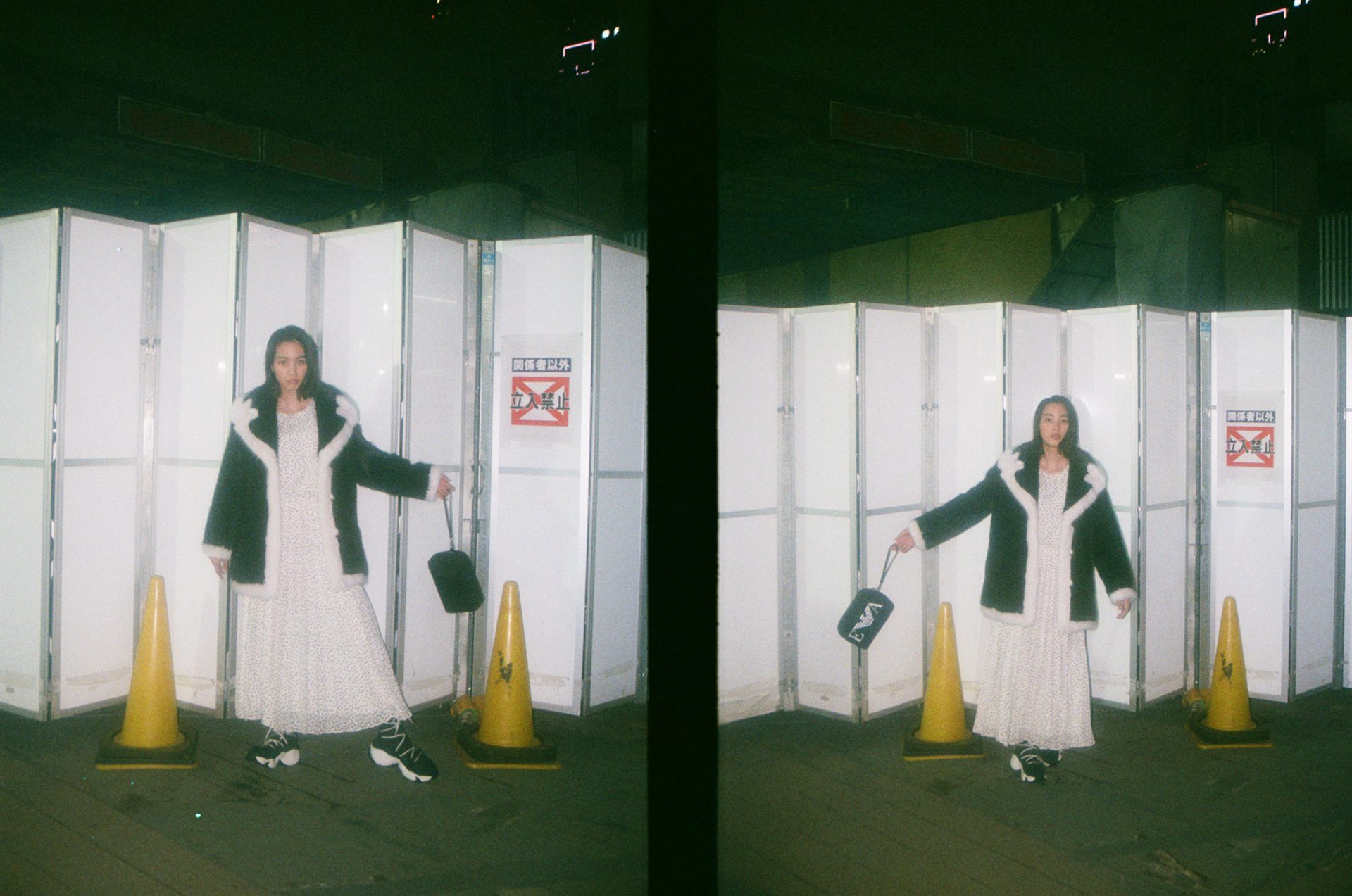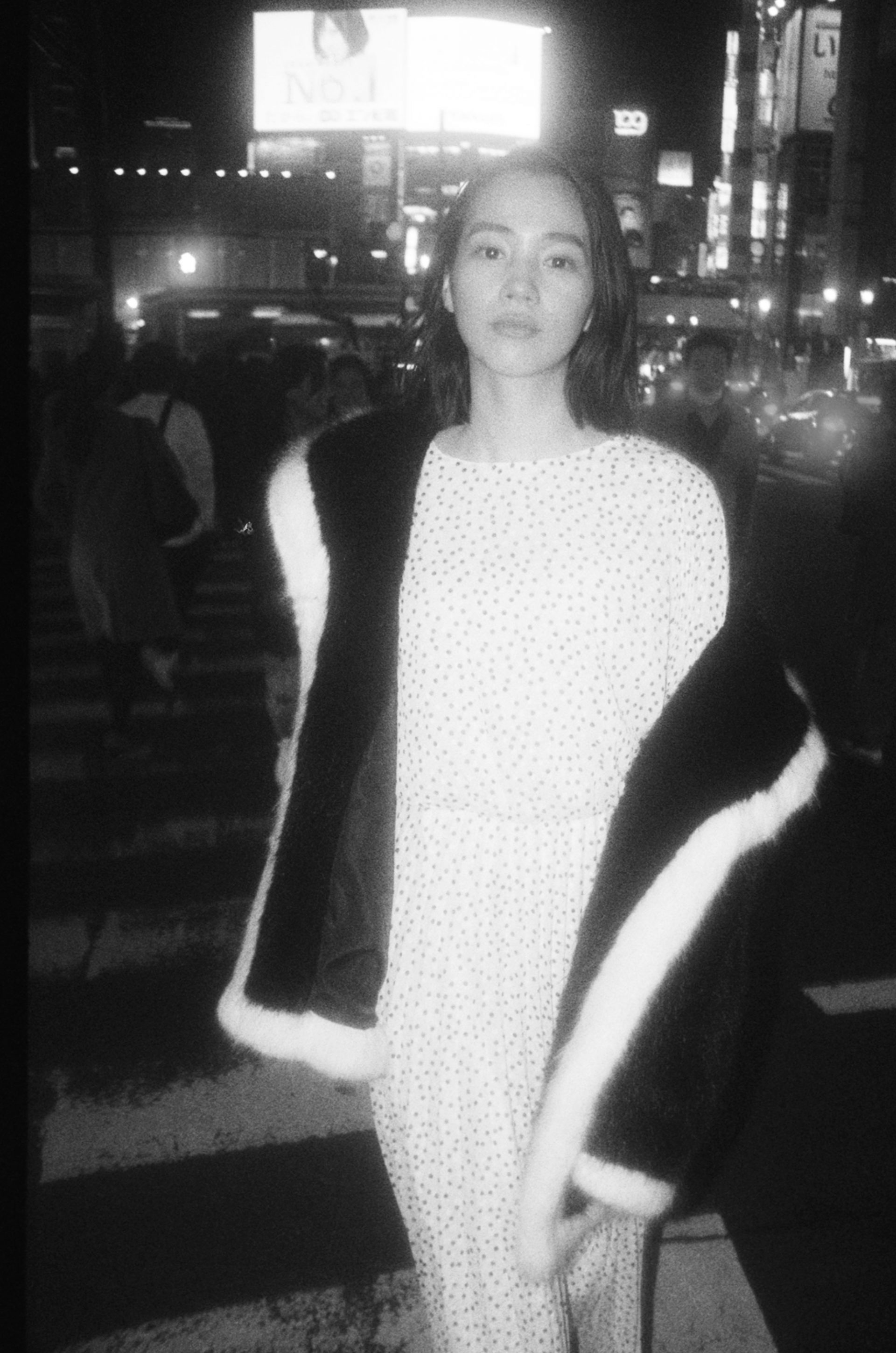 オーバーサイズのアウターをさらりと羽織り、足元はスニーカーを合わせて颯爽と渋谷の街を駆け抜ける。まぶしい街中にあって、ことさら明るく発光するように映える白のワンピースは、EMPORIO ARMANI (エンポリオ アルマーニ) の2019-20年秋冬コレクションのものだ。ルールにしばられることなく、好きなものを感情がおもむくままに取り入れて、個性を表現する。今シーズンのコレクションを説明するフレーズは、そのまま女優・のんのアティテュードとも重なって、こちら側にも心地よく響いてくる。着る人が好きなように楽しめる自由の服。その開放的なエネルギーを味方に、いざ再び渋谷の街へ。
