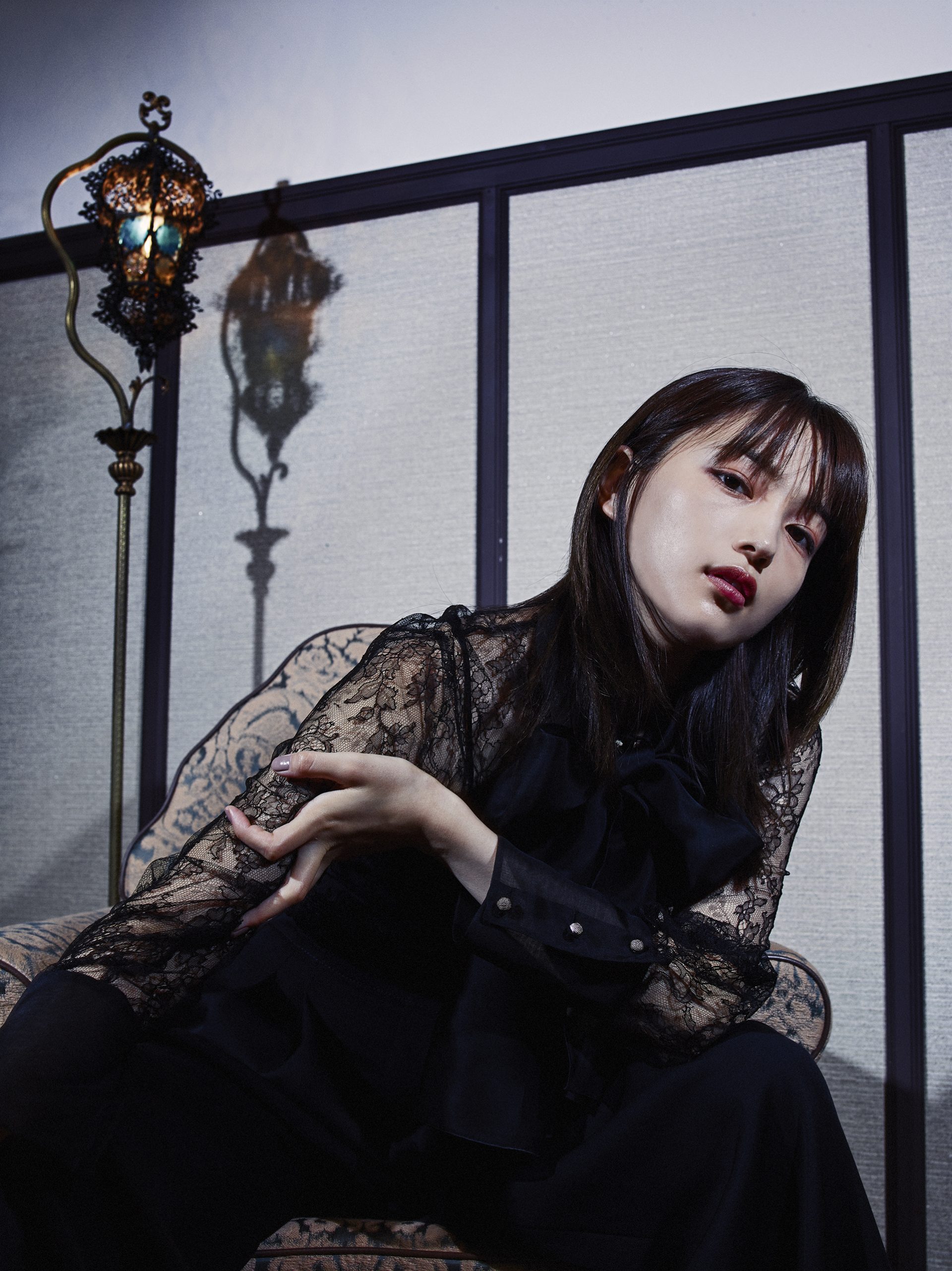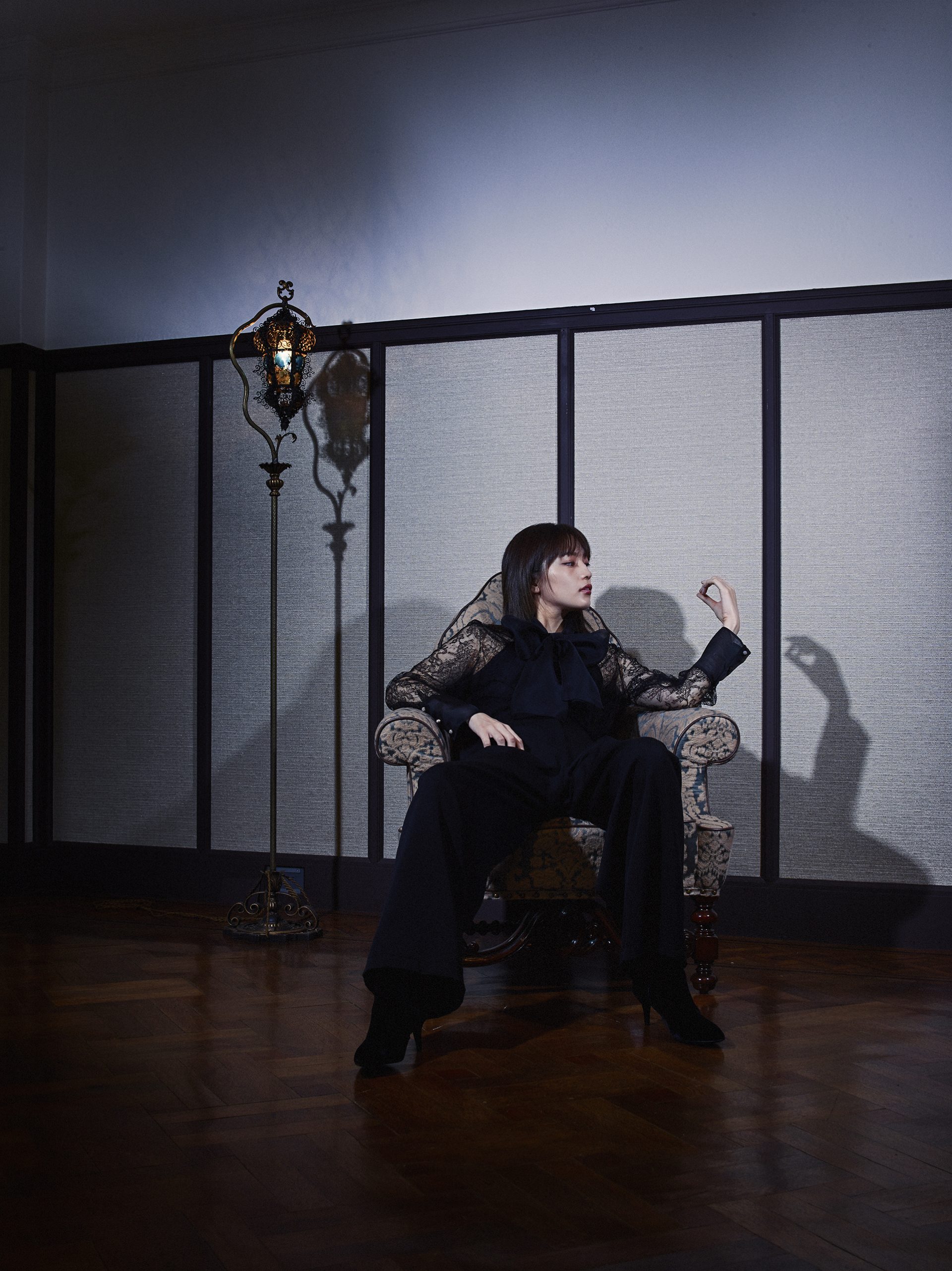 オフの日は 「一歩も外に出ずに本を読んだり、映画を見たりするときもあります」という川口春奈。日常と非日常が交錯する洋館の一室で、優雅にゆっくり過ごす一日をイメージして、EMPORIO ARMANI のエレガントなブラックスタイルを着こなしてもらった。トップスに選んだのは、透け感のある黒いレースに、大きなボウをあしらったドレッシーなブラウス。華やかな場で着るイメージが強い1枚だが、EMPORIO ARMANI の服には不思議と普段から袖を通したくなる着心地の引力が備わっている。