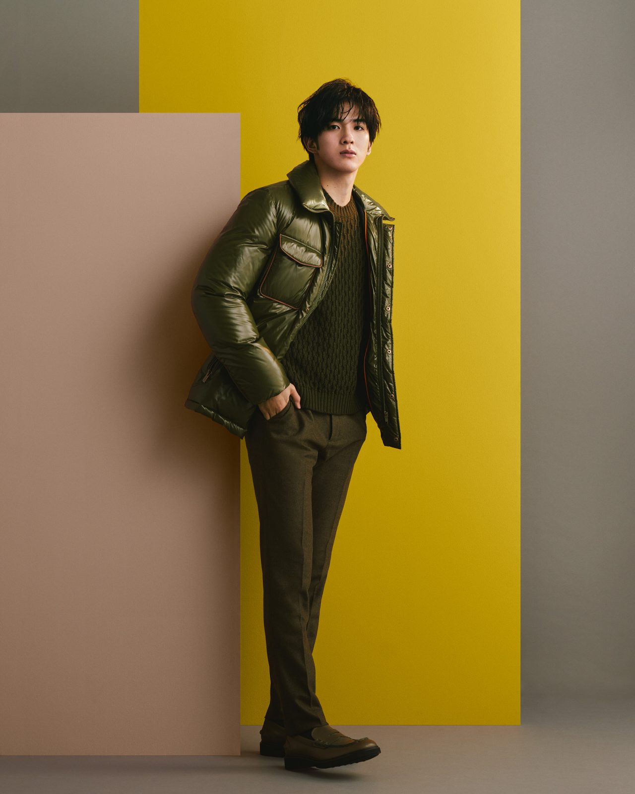 甲斐翔真が着る2ルック目に選んだのは、深いグリーンのレイヤード。艶やかなダウンジャケットに、メリノウールで編んだラウンドネックのニット、フランネルで仕立てたクラシックフィットのボトムス。あとはシューズ次第で、カジュアルにもエレガントにも振ることのできるタイムレスなコーディネート。今回はローファーを合わせて、上品かつ軽快に着地。