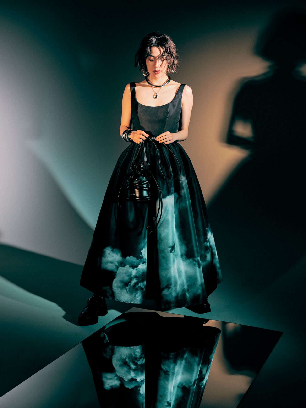 夜明けから日暮れまで、雲の形成や色を捉え、美しいテキスタイルに落とし込んだ今シーズンの Alexander McQueen。今回着用したのは、日没後の黄昏の雲をプリントしたミステリアスなムードを湛えるドレス。デコルテを美しく見せるオープンネックラインに、大胆なバックスタイルが、鮮烈な印象を焼き付ける。注目したいのは、ドレスのプリントに呼応するかのように、妖しく艶めく漆黒の「ソフトカーブ」。ブランド初期に描かれたハーネスを参考に仕上げられたアイコンバッグ「カーブ」が、ラムスキンレザー製のドローストリングのクロージャーで、よりしなやかな印象にアップデート。エレガントな装いにも、カジュアルな着こなしにもフィットするデザインだ。