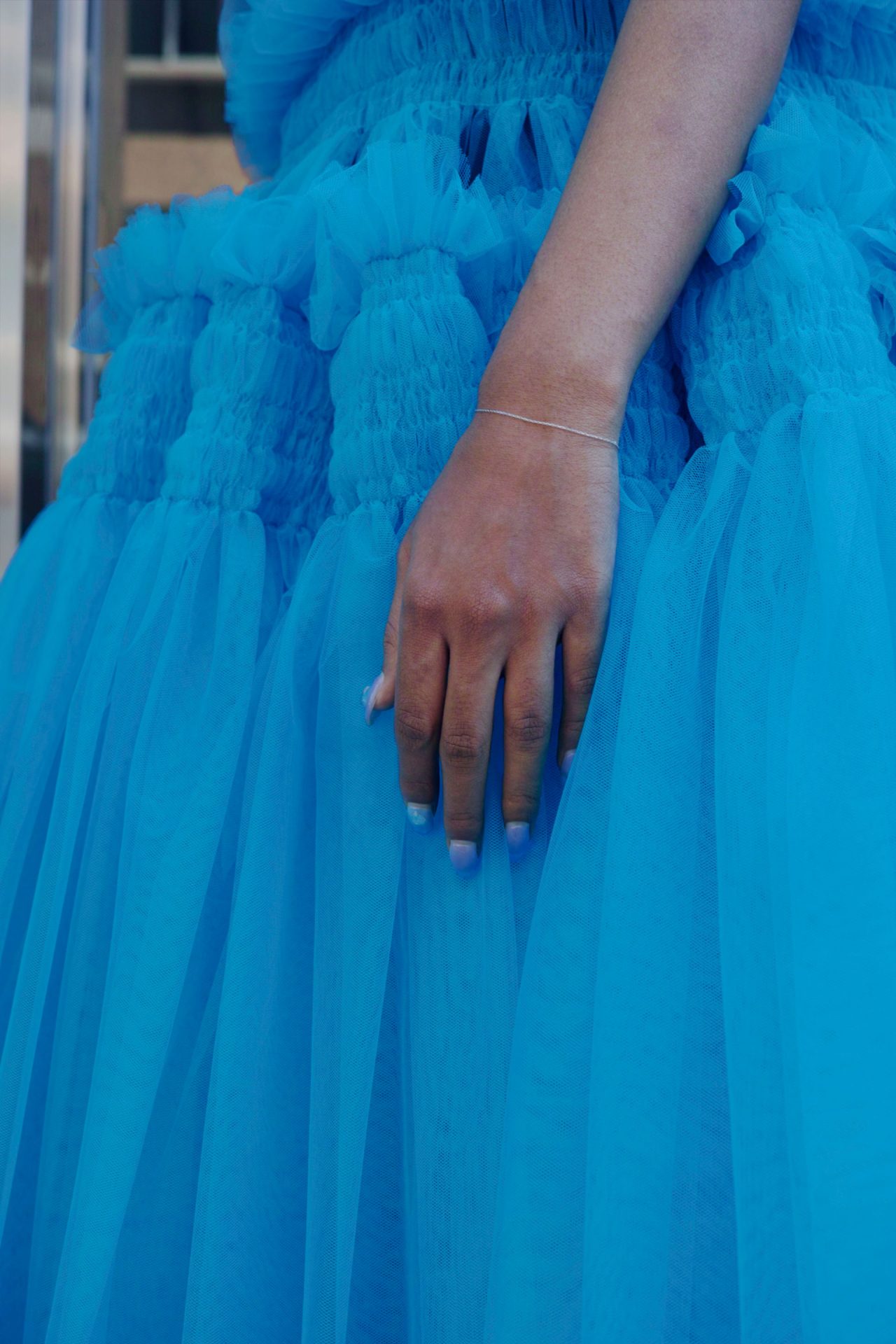 心地よい朝の光が照らす表参道。シャラの青い瞳と褐色の肌色をドレスアップしたのは、露草のように鮮やかなブルーのドレス。Aラインに広がるボリュームたっぷりなシルエットと、バックスタイルに施されたリボンはまるヒロインのように、歩くたびに揺れるチュールが自信を与えてくれる。人生の主役はいつだって自分自身。見慣れた街の景色も特別なドレスで魔法をかければ、映画のワンシーンのように輝いて映るはず。