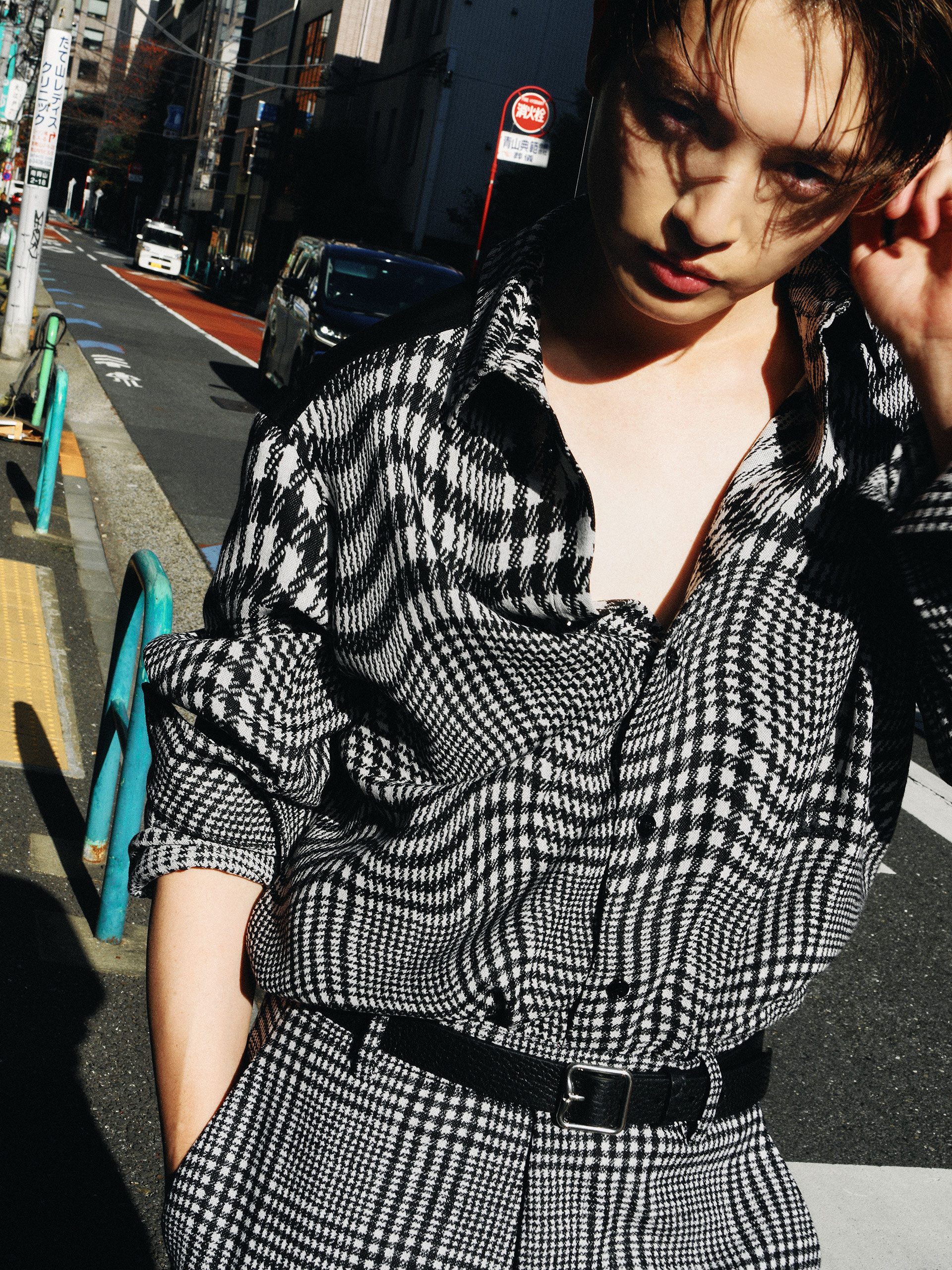 第2回目は、Burberry (バーバリー) の2024年スプリングコレクションを颯爽と着用。チーフ・クリエイティブ・オフィサーの Daniel Lee (ダニエル・リー) による2回目のコレクションとなる今作では、お馴染みのチェック柄や英国トラッドといったメゾンのヘリテージを再解釈したニュールックを提案。玉森が着こなしたセットアップも一見オーセンティックなチェック柄と思いきや、ゆらゆらとした曲線の交差にピッチの変化も加わって、アーティスティックなアレンジが効いたチェック柄となっている。“らしさ”を大切にしながらも、型にとらわれることなく自由に、最旬の姿を披露し続ける老舗のスタンスは、観衆の憧れであり続けるアーティスト・玉森裕太の歩みにも重なるものがある。(第2回/全5回)