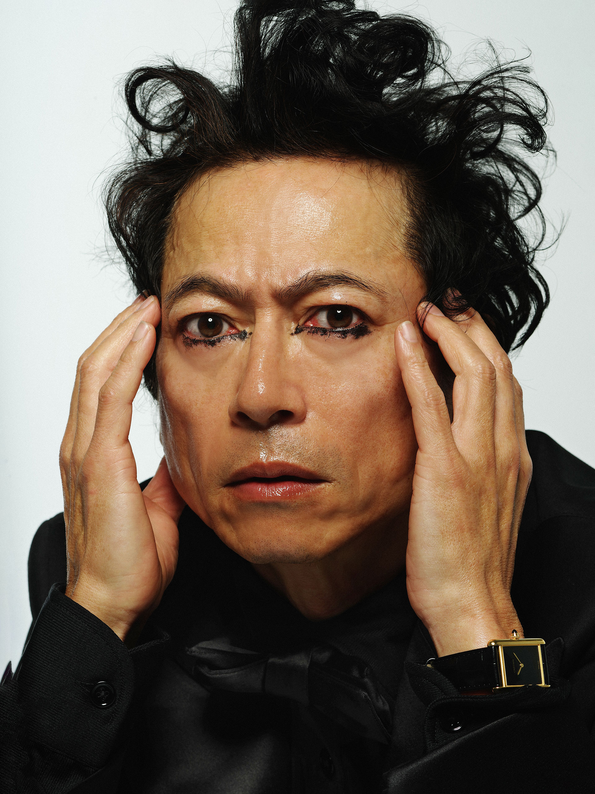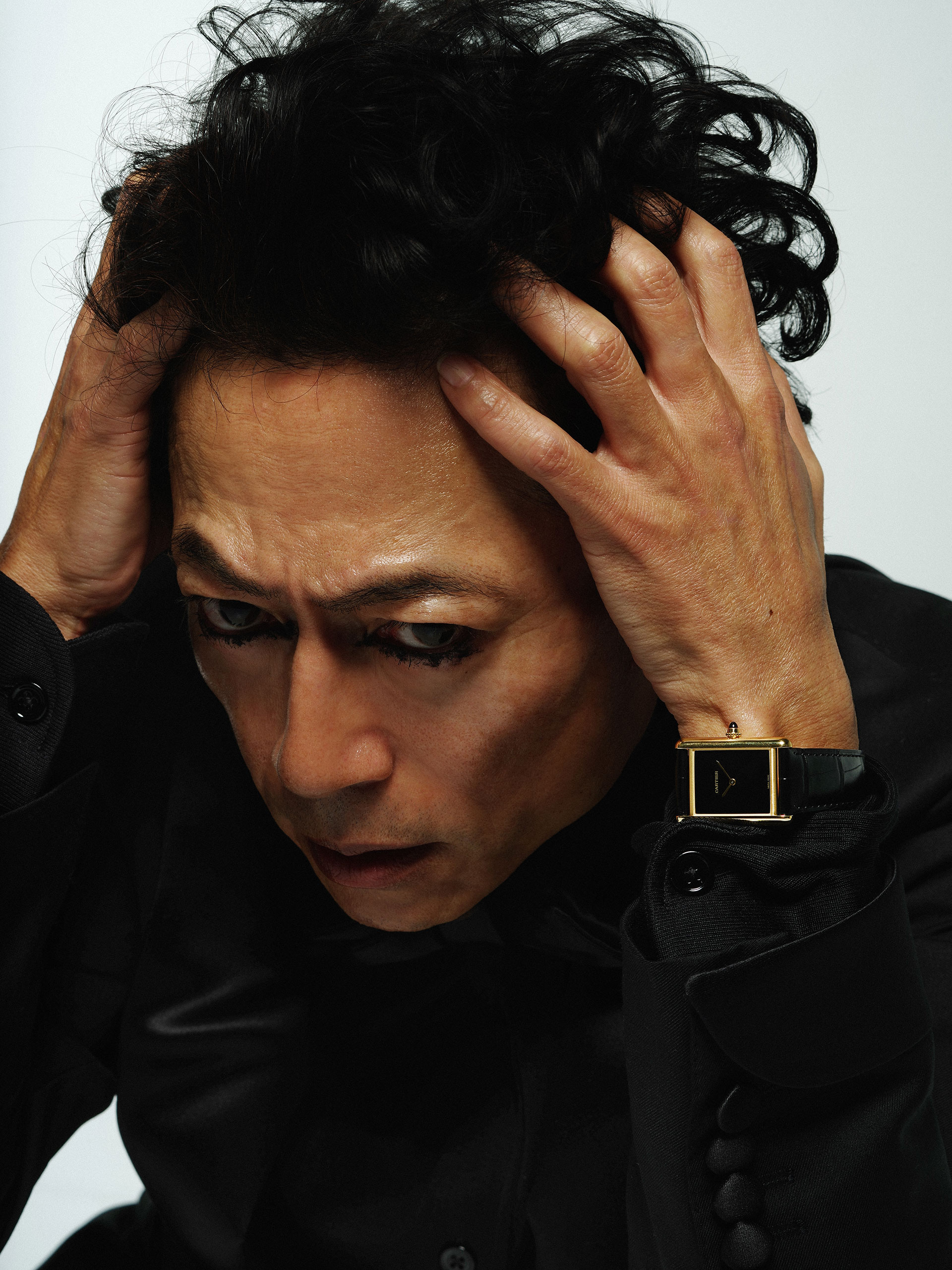 包み込むように美しく身体にフィットする TOM FORD のオールブラックなタキシードルックが、グラマラスに官能的に、三上の表情を引き立てる。腕元には、ルイ・カルティエ自ら愛用した「タンク」シリーズの原点、「タンク ルイ カルティエ」がタイムレスな輝きを放つ。写真家・鈴木親とスタイリスト・北村道子が、三上のエレガントでセンシュアルな魅力を捉えて魅せる。