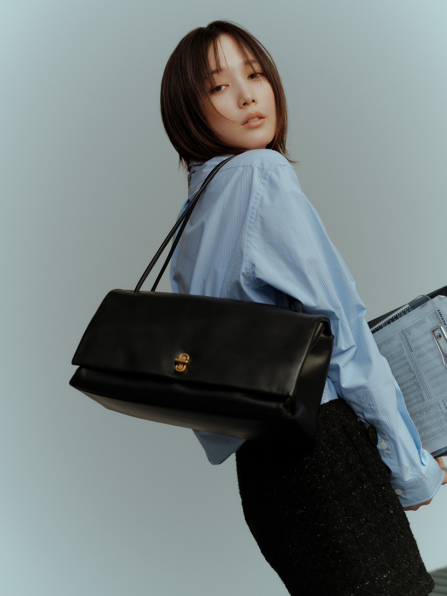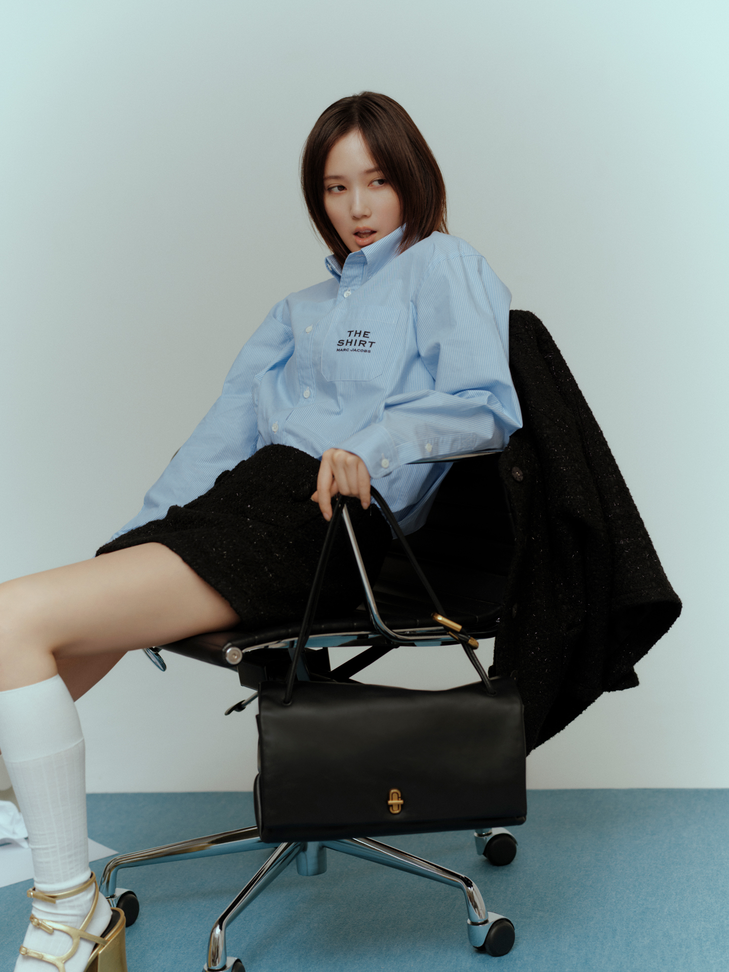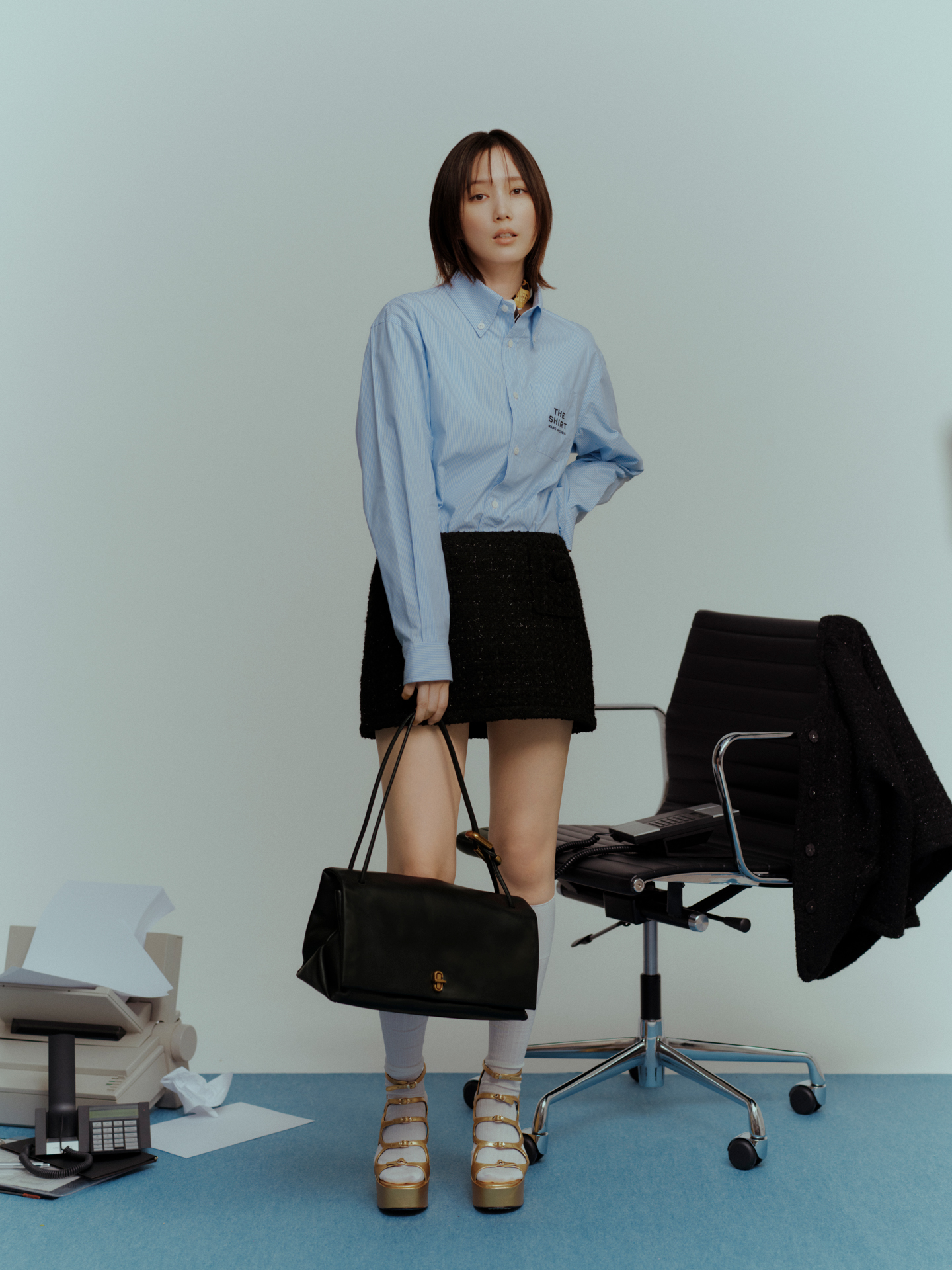 少しだけ個性を光らせるオフィススタイルを意識するだけで気分が高鳴り、日々のタスクもスマートにこなせそうだ。ブルーシャツはボタンダウンでジャケットを羽織れば、フォーマルなシーンにも活躍。胸元にある「THE SHIRT」の刺繍も程よいアクセントに。仕事帰りのお出かけは、ゴールドのプラットフォームシューズに履き替えてファッションモード全開に。ブラックのバッグに合わせてジャケットとスカートも同じカラーにすることで知的な印象を与えながら、シャツやソックスで抜け感を演出する。シック×ガーリーのスタイリングにトライしよう。