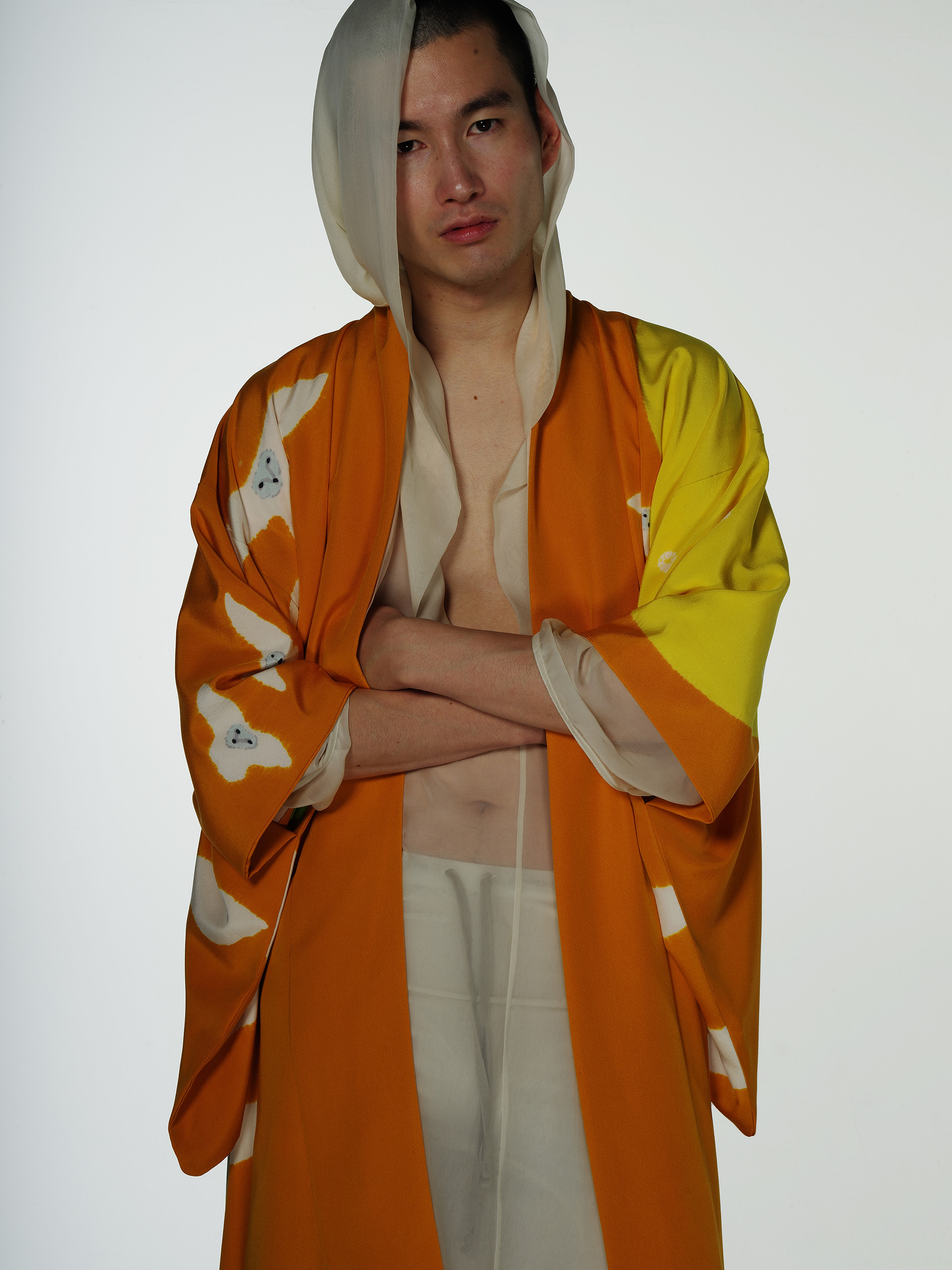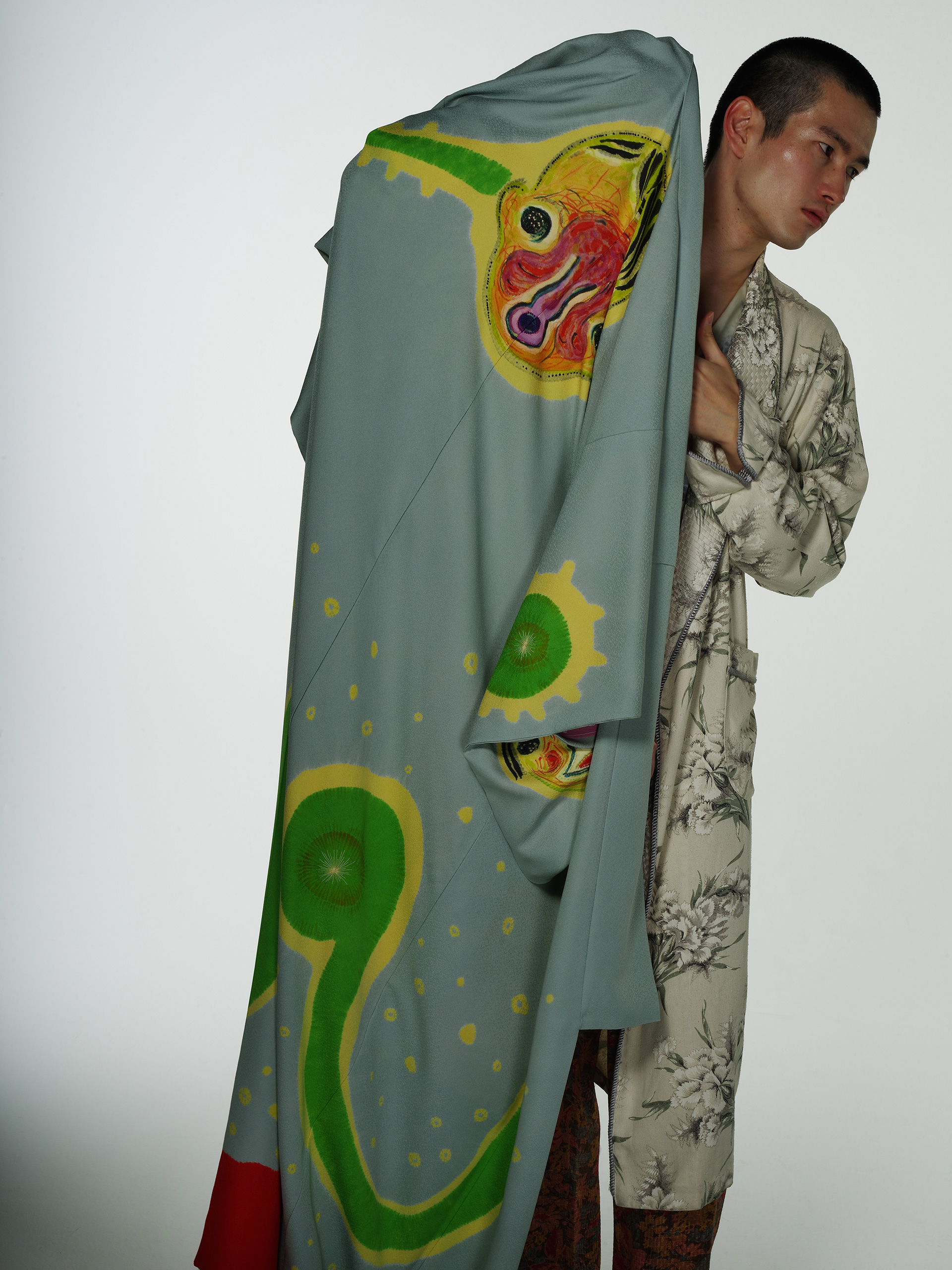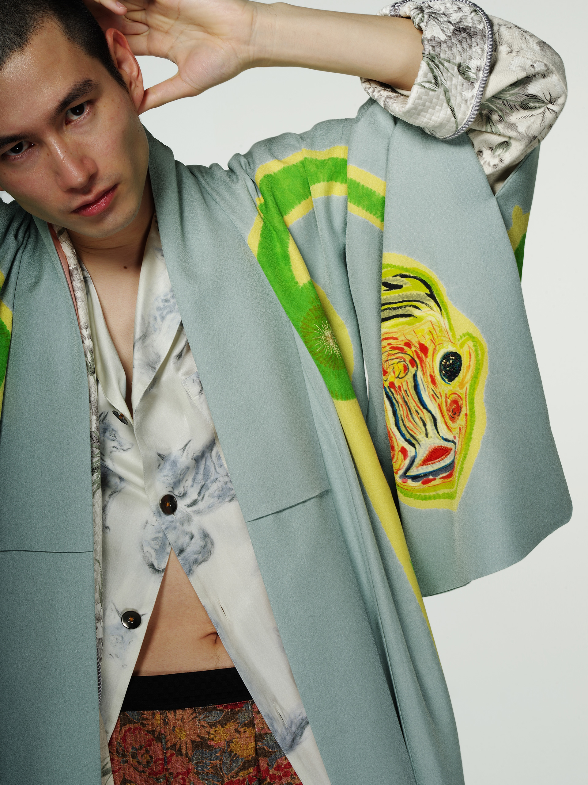 着物はモードか、それともアートか。約40cm×12m–––1枚の細長い布が、無駄なく、美しい物語を纏って仕立てられる。その構造美に、現代美術家・加藤泉が描いた“人型(ひとがた)”の描き友禅が躍動する。対峙するのは、今年創業470周年をセレブレートする京友禅の老舗・千總による伝統技術だ。<ミミズク>と<ゼンマイ>、抽象と具象が交錯するフォルムを、職人たちによる絞り、染め、刺繍の多彩な技法によってより鮮やかに昇華させる。古より日本が紡いできた衣装文化の新たな1ページとして、モード界の寵児・KOHEIが、着物と自由に戯れ、その身体感覚を通じ新たな地平を提示する。撮影したのは写真家・鈴木親。着物は、もっと自由になれる。時代を超えて、未来へ。