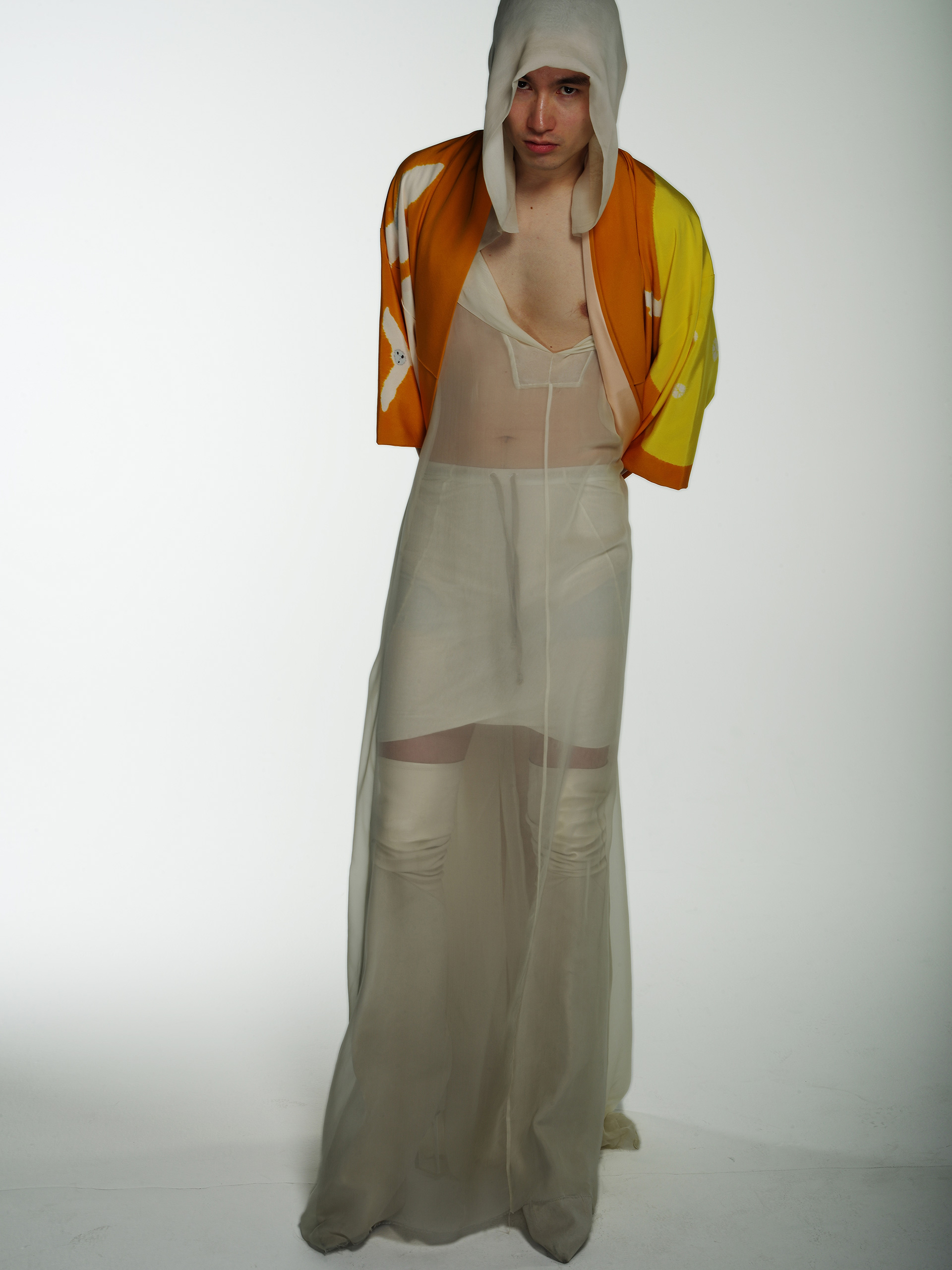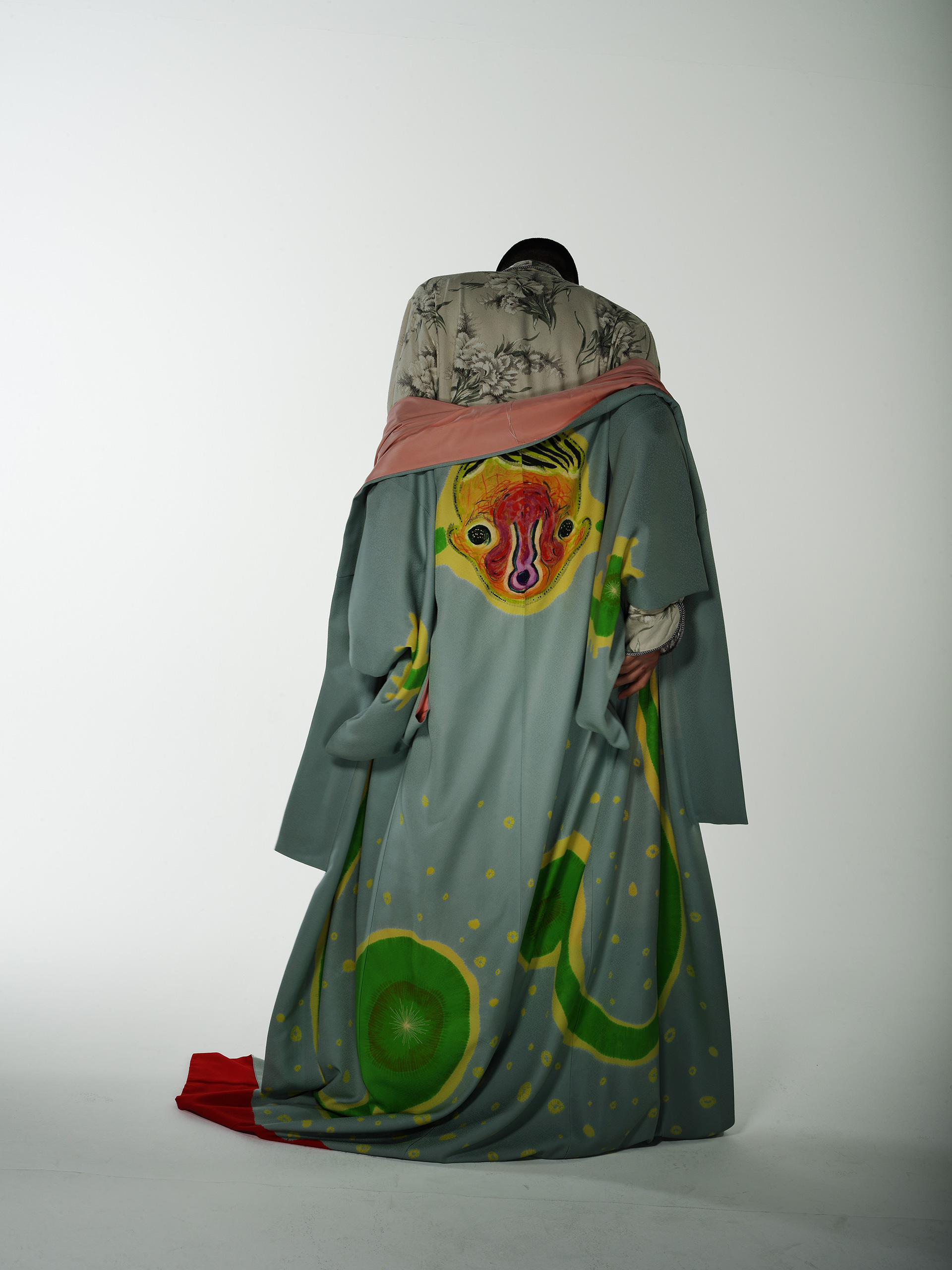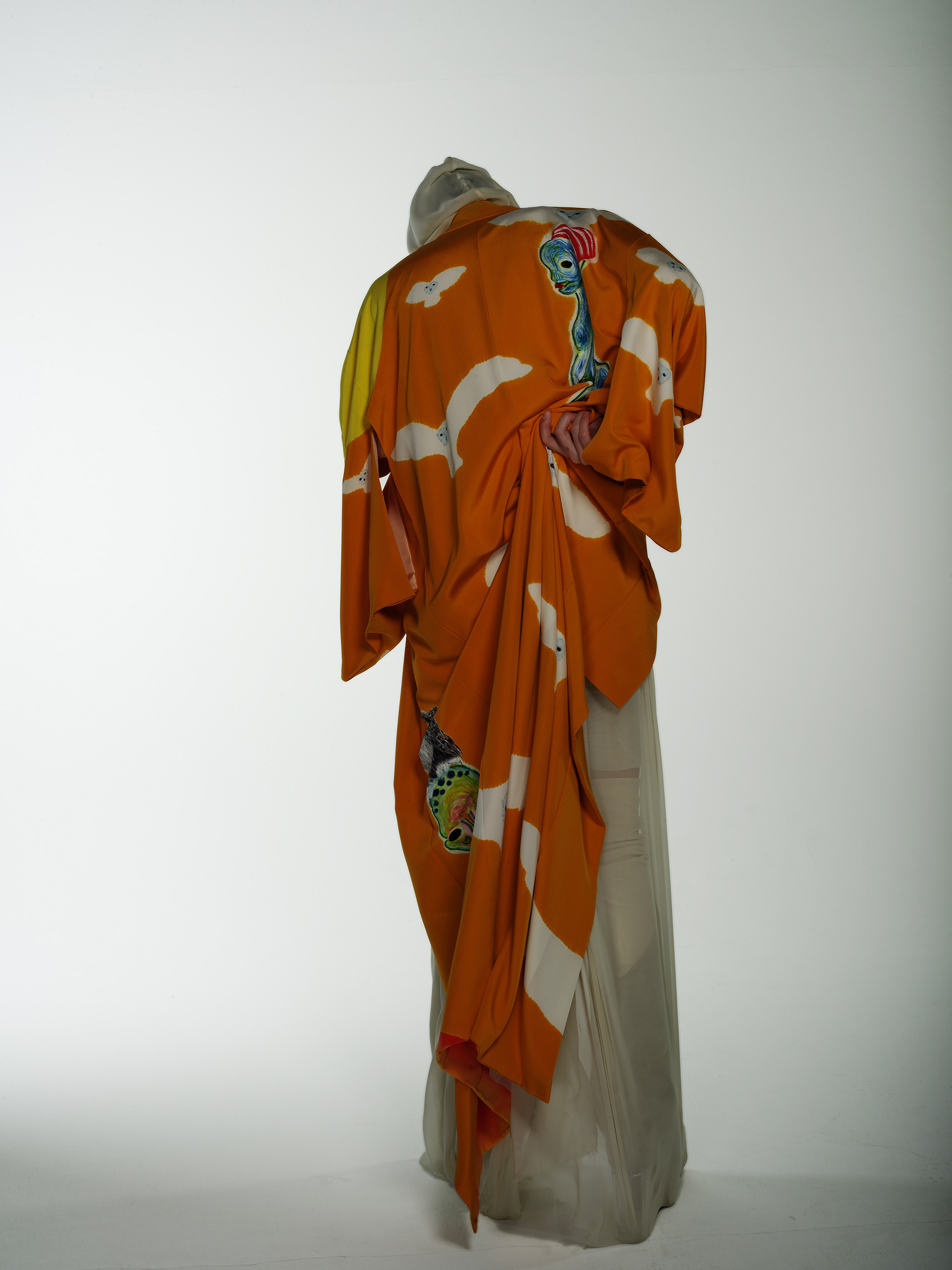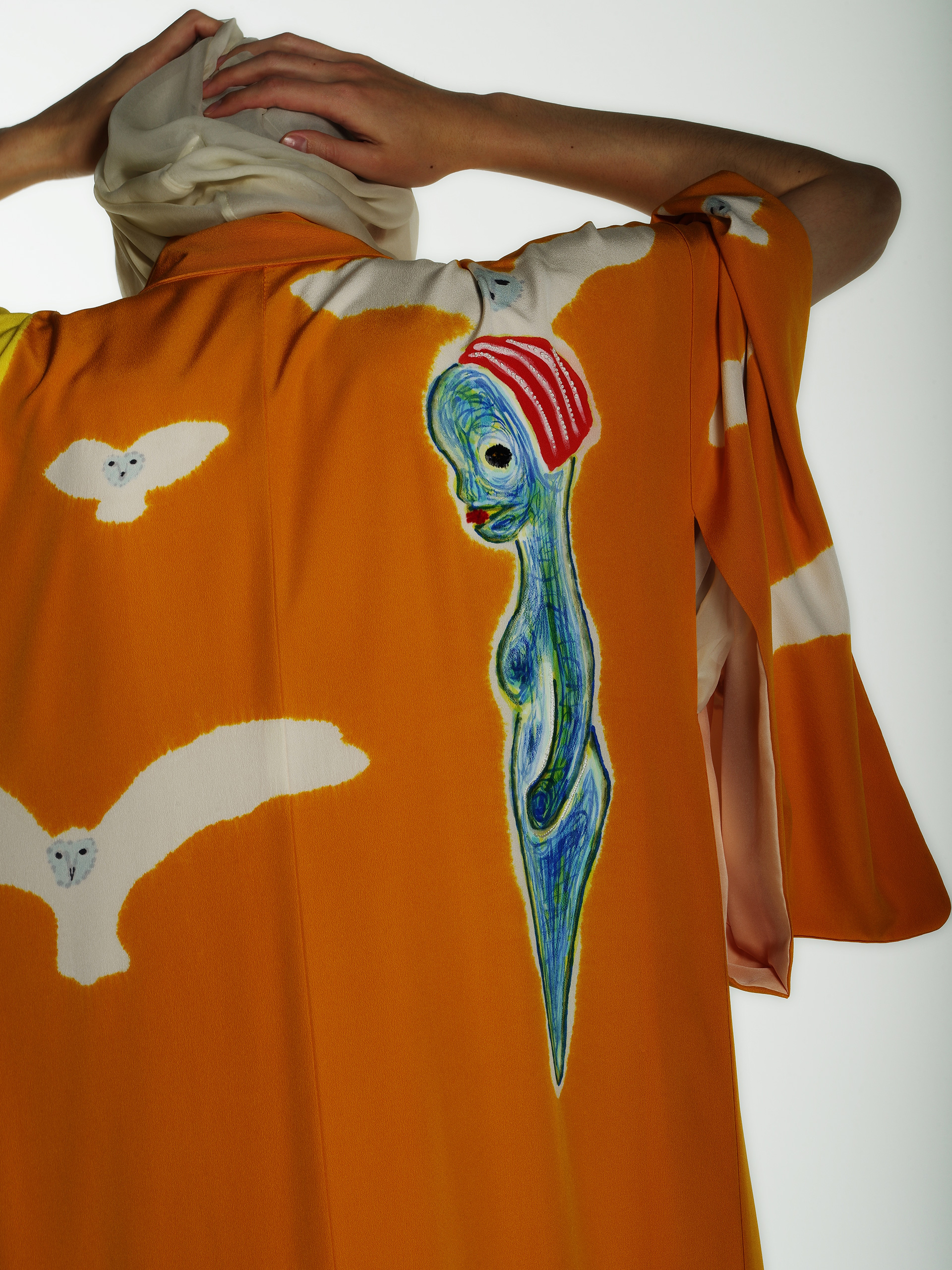 着物はモードか、それともアートか。約40cm×12m–––1枚の細長い布が、無駄なく、美しい物語を纏って仕立てられる。その構造美に、現代美術家・加藤泉が描いた“人型(ひとがた)”の描き友禅が躍動する。対峙するのは、今年創業470周年をセレブレートする京友禅の老舗・千總による伝統技術だ。<ミミズク>と<ゼンマイ>、抽象と具象が交錯するフォルムを、職人たちによる絞り、染め、刺繍の多彩な技法によってより鮮やかに昇華させる。古より日本が紡いできた衣装文化の新たな1ページとして、モード界の寵児・KOHEIが、着物と自由に戯れ、その身体感覚を通じ新たな地平を提示する。撮影したのは写真家・鈴木親。着物は、もっと自由になれる。時代を超えて、未来へ。