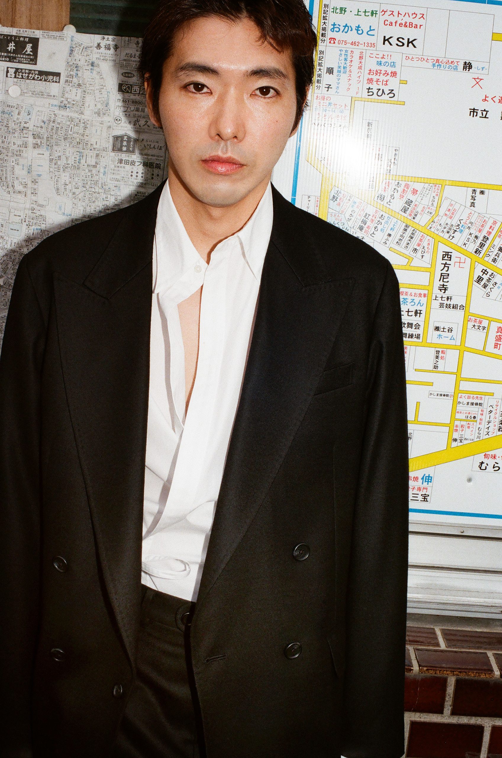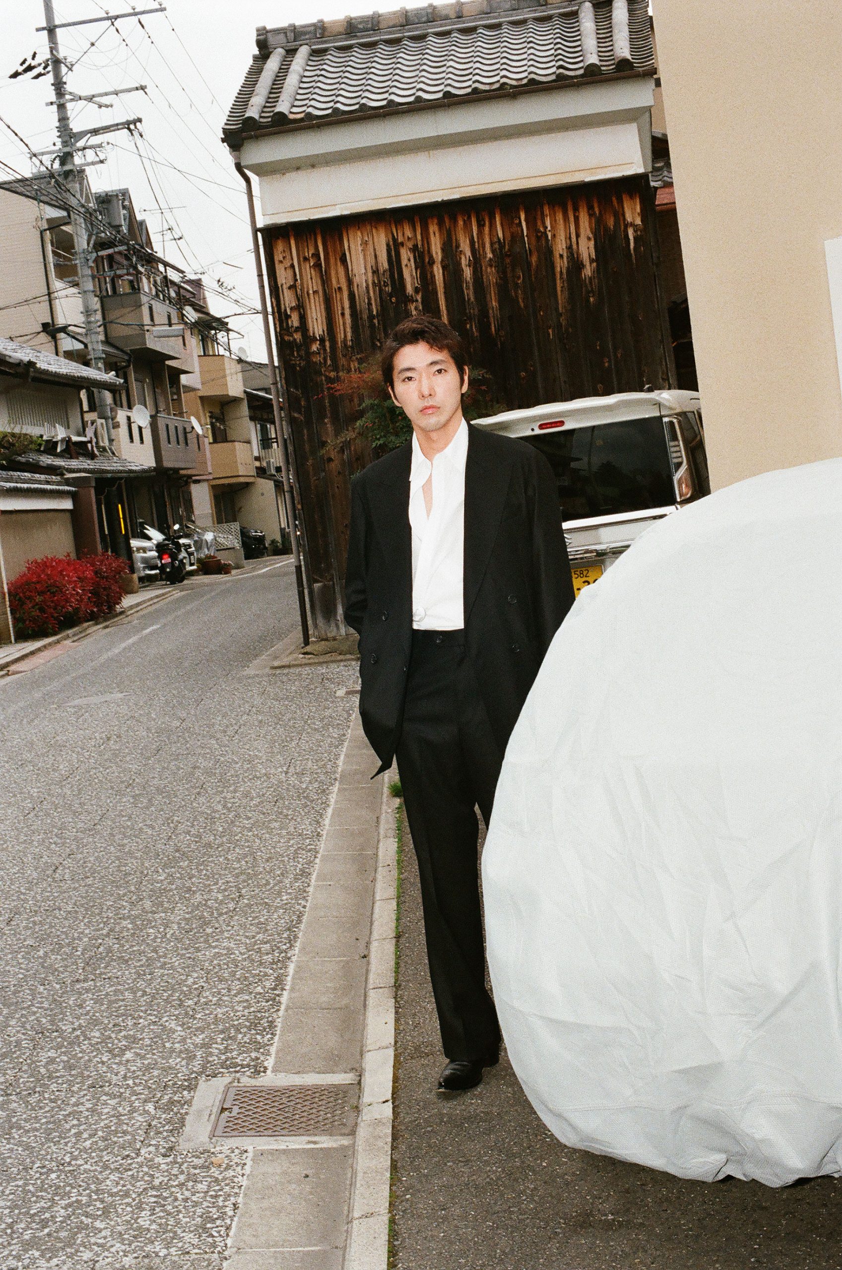 今回、柄本が纏うのは、京都を拠点とする RAINMAKER (レインメーカー) の2025年秋冬コレクション。RAINMAKER は、和の美学を出発点に、現代的なテクノロジーや異文化の要素を独自の視点で掛け合わせ、時代の空気に寄り添う服作りを続けている。今季は、ウェスタンのエッセンスとエレガンスを織り交ぜ、機能性と洗練が共存するスタイルを展開する。撮影を手がけたのは写真家・鈴木親。京都の光と影、その隙間に浮かぶ人物の呼吸をとらえるようにして、柄本佑とレインメーカーの交差点を静かに記録した。装いと空気、時間と記憶が、重なり合う瞬間をとらえた、ひとつの肖像(第2回/全5回)。