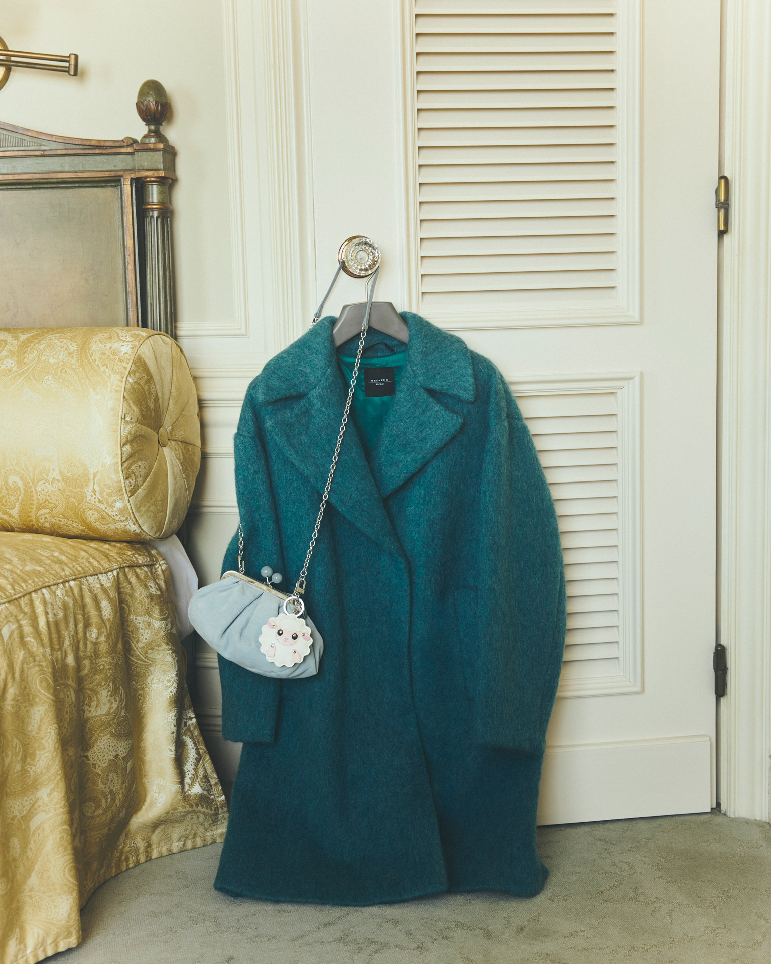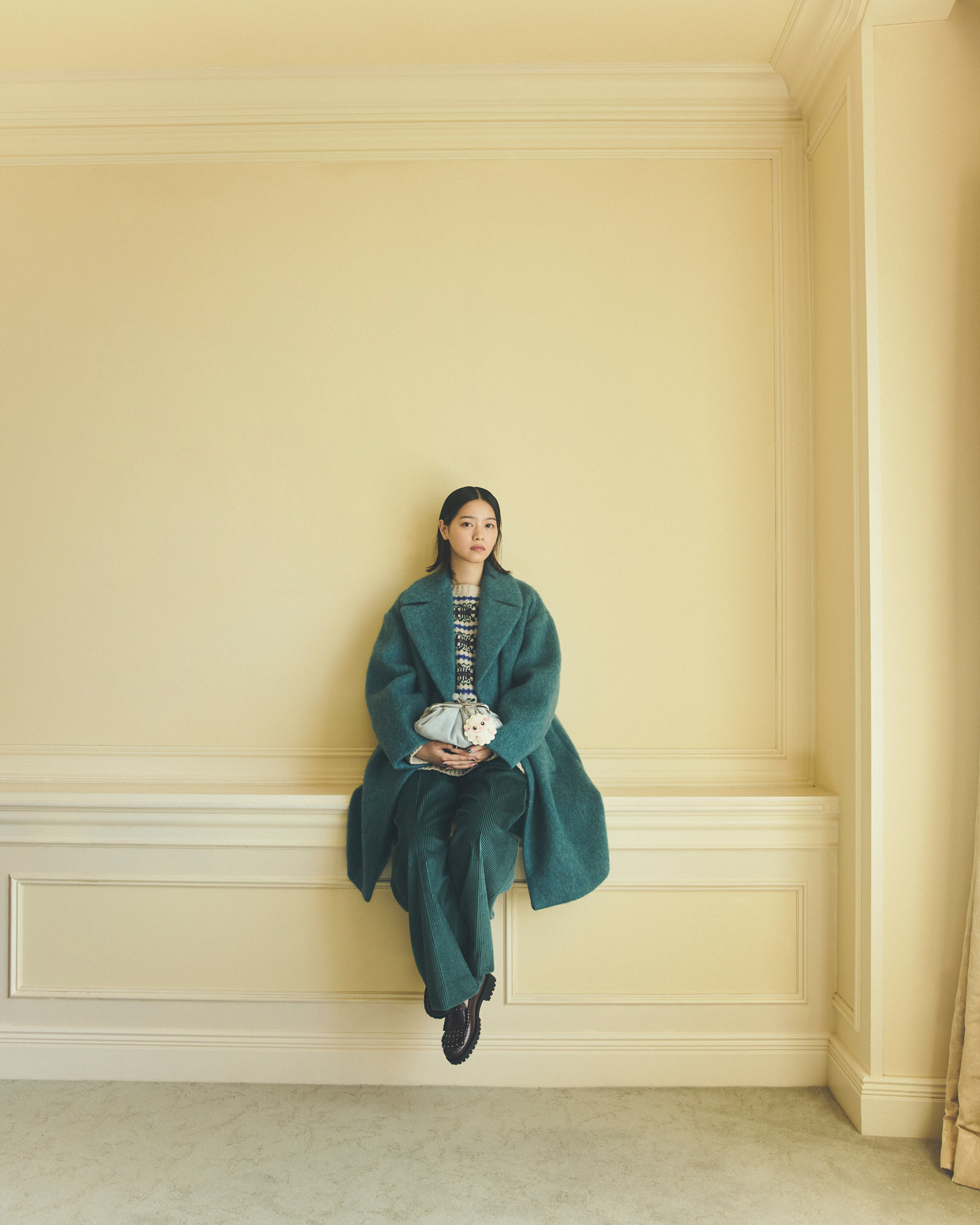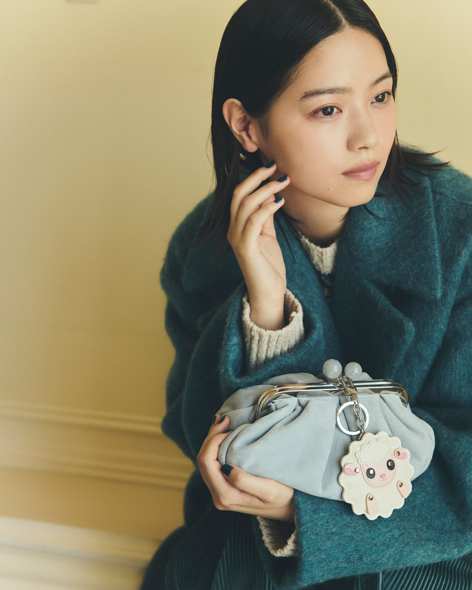毛足のある風合いが目を引くウールアルパカモヘヤのコートは、ボリューム感がありながらも軽やかな着心地が魅力。アルパカ混ならではのソフトな肌触りと、ワイドなラペルを備えたオーバーサイズのシルエットが、リラックスしたムードとモードな存在感を同時に引き出している。合わせたのは、ふんわりとしたバルーンシェイプが特徴的なスエードのスモールパスティチーノバッグ。大理石風の留め具やチェーンストラップのディテールが、可愛らしさと洗練を兼ね備え、装いに遊び心を添えている。そこに動物モチーフのレザーチャームをあしらうことで、チャーミングな表情がプラスされ、バッグをより自分らしく楽しめるスタイルへと仕立てている。