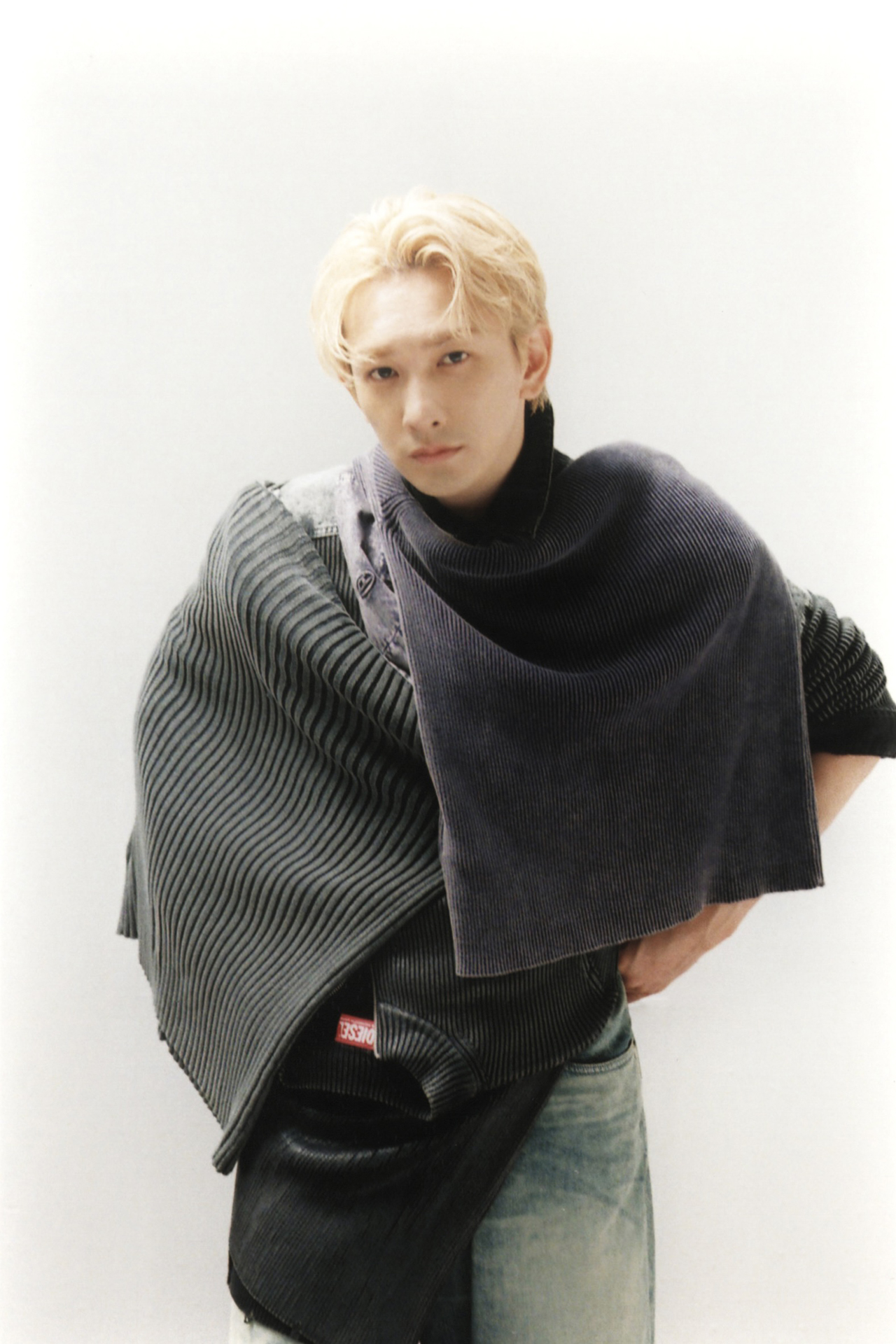 Glenn Martens (グレン・マーティンス) は、ニットをベーシックなものではなく、モードで挑戦的なアイテムとして位置づけている。様々なギミックを効かせたニットは、近年の DIESEL における新たなアイコンとなりつつある。今回、町田が着用したのは、リブベースにデニムのディテールが映える一着。ウォッシュ感のある色味に加え、肩と袖に施されたデニム使いが斬新な印象を与える。合わせた新型のリラックスフィットデニムは、従来のモデルよりもゆとりを持たせたシルエットで、ストリートスタイルを格上げする一本だ。カジュアルな装いにシャツやレザーのクロッグシューズといったトラッドなアイテムを組み合わせることで、ストリートの自由さとクラシックの格式が交錯する唯一無二のルックへと昇華する。