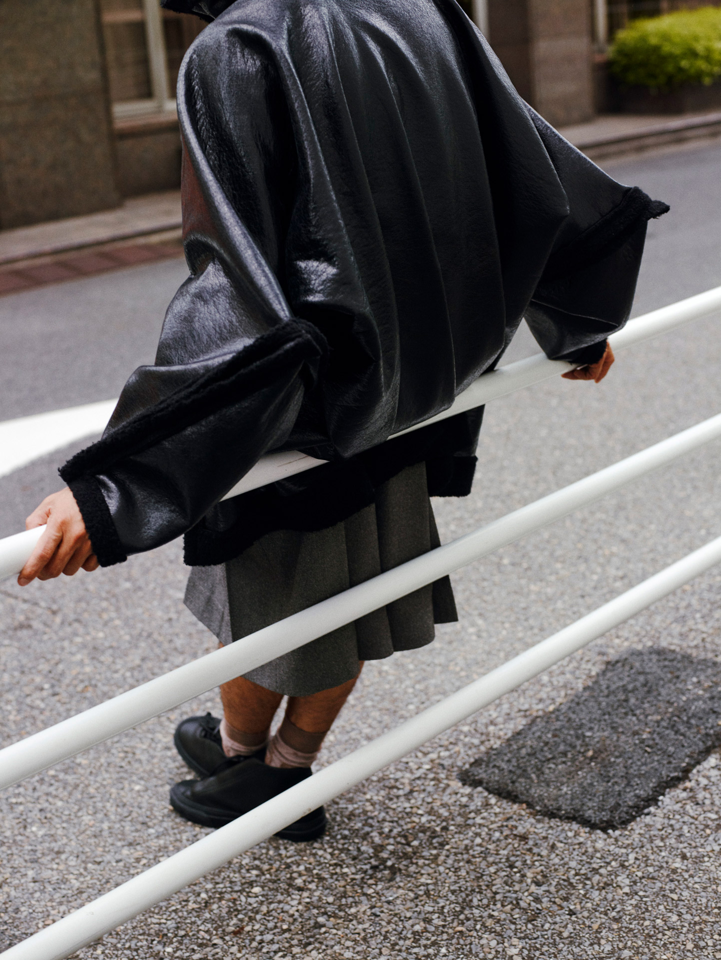 大胆なフォルムを描くブルゾン「METALLIC ULTRA BOA」は、今季の IM MEN の中でもひときわ目を引く存在。人工皮革スエード「Ultrasuede®」 に、リサイクルウールを含んだボアを貼り合わせた人工ムートンは、見た目以上の軽さを備え、表面に箔プリントを施すことで力強いメタリックな質感へと昇華した。左右の裾から袖口へと走るファスナーを捻るように閉じれば、肘まわりに建築的なラインが浮かび上がり、黒一色の表面に彫刻的な陰影を刻む。