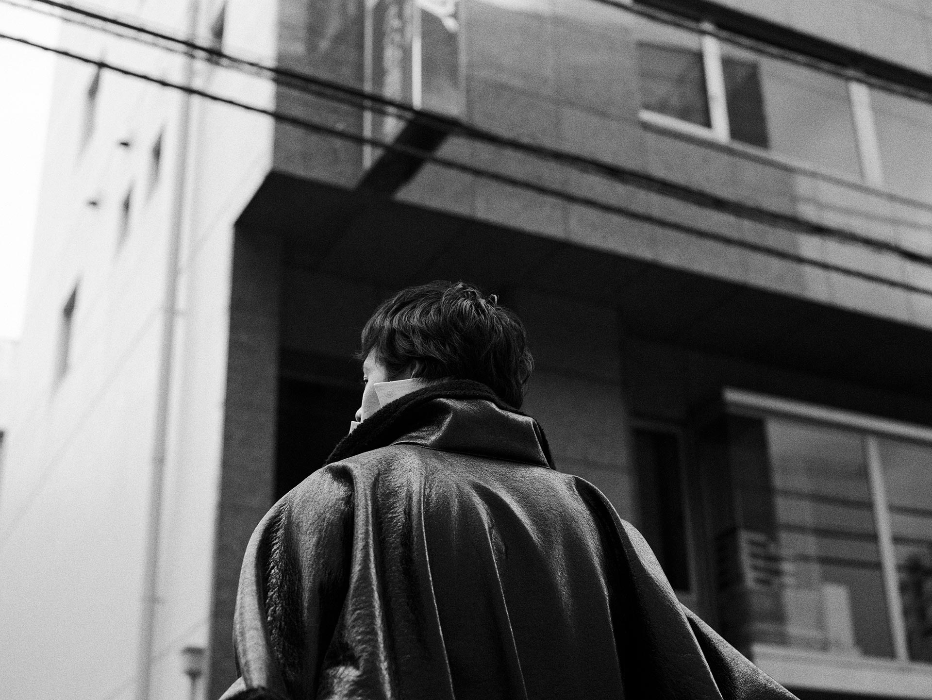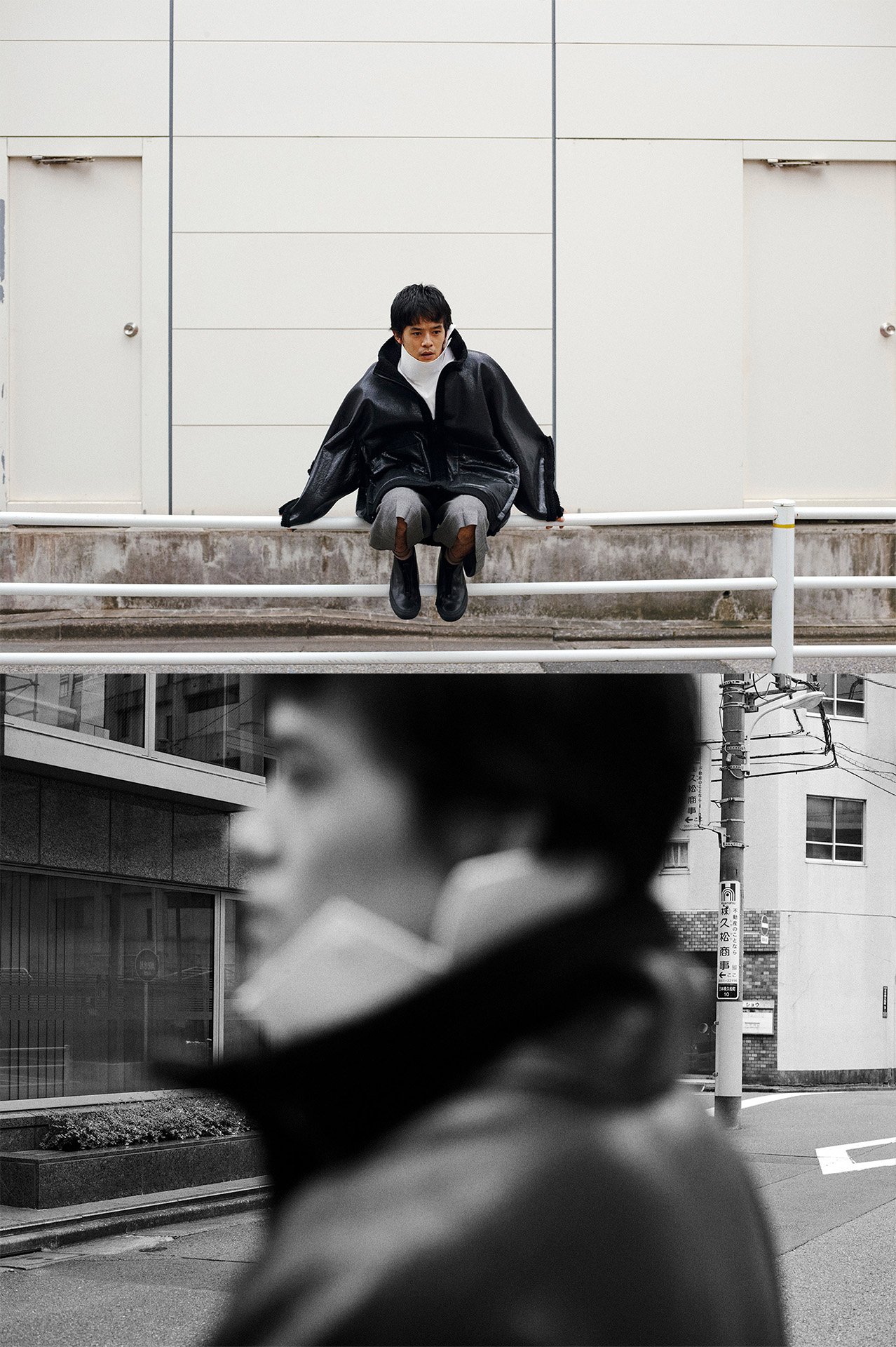 池松壮亮という俳優は、その “語らない強さ” を自然体のまま証明するような存在だ。役を演じるというより、その人物として呼吸をしているように映る。撮影当日も、カメラの前で、ただそこに在るという佇まいだけで、景色の意味を塗り替えてしまうような不思議な魅力があった。彼の歩幅や肩の傾きひとつが、服の表情を静かに変化させる。凛とした静けさを纏う池松壮亮の姿と、IM MEN の余白の美学が、都市の中でそっと交差する (第3回/全4回)。