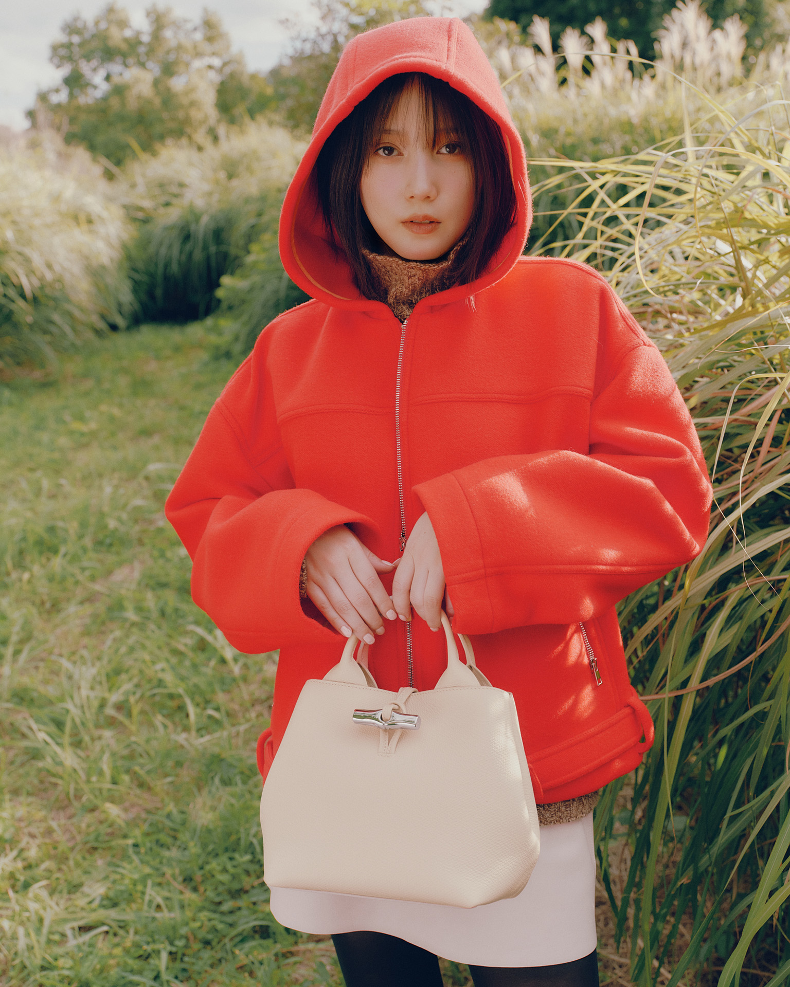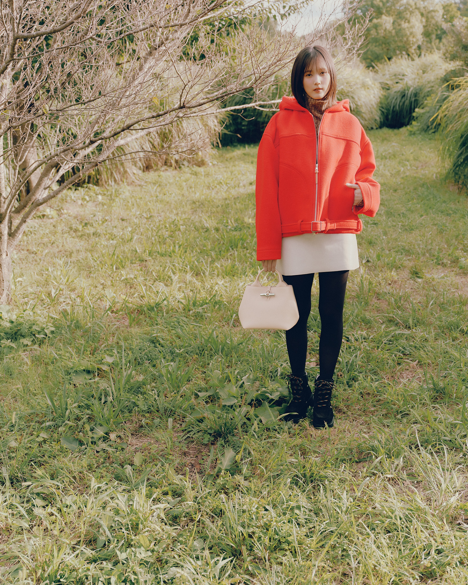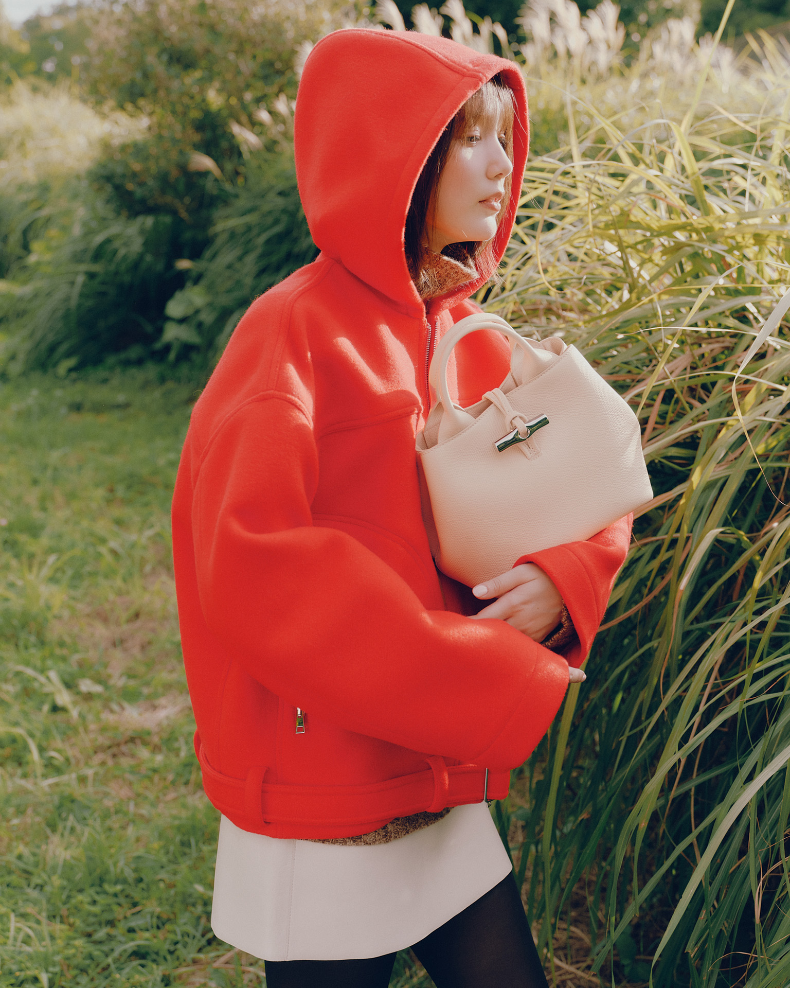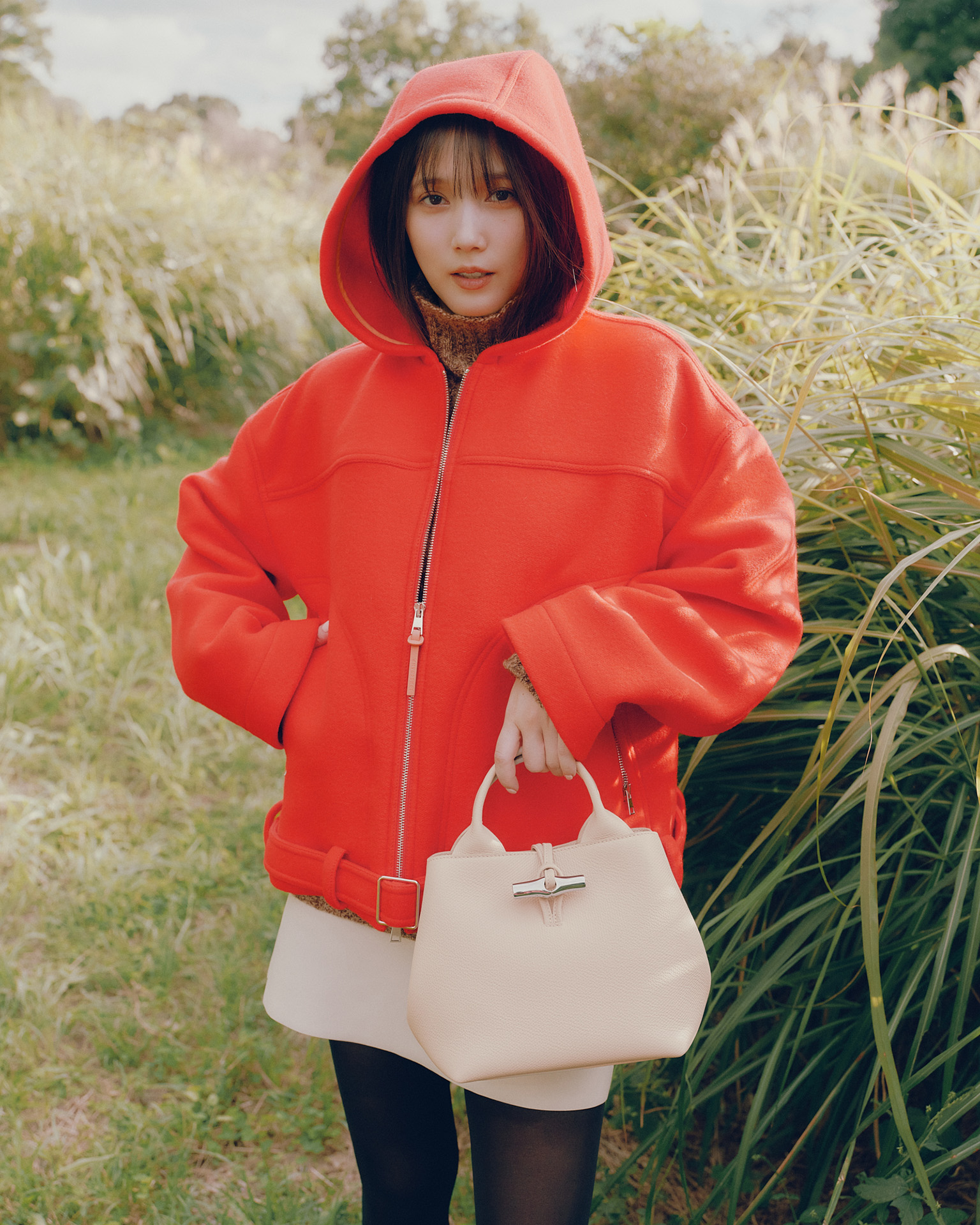 丸みを帯びたフォルムに心惹かれる「LE ROSEAU」トップハンドルバッグS。肌馴染みの良いカウハイドレザーを使用し、シルバーの“バンブー”トグルがジュエリーのようにアイテムを飾る。カラーバリエーションは本田が手にしたペーパーやブラック、ウォルナットの3色が定番。バッグと共にこの季節のムードを高めるのが、鮮やかなレッドのウール混ジャケット。グレーズドラムスキンで仕立てたエクリュホワイトのミニスカートの足元にボリュームのあるマウンテンブーツを合わせたら、 生きる歓びに満ちた現代のパリジェンヌスタイルの完成。