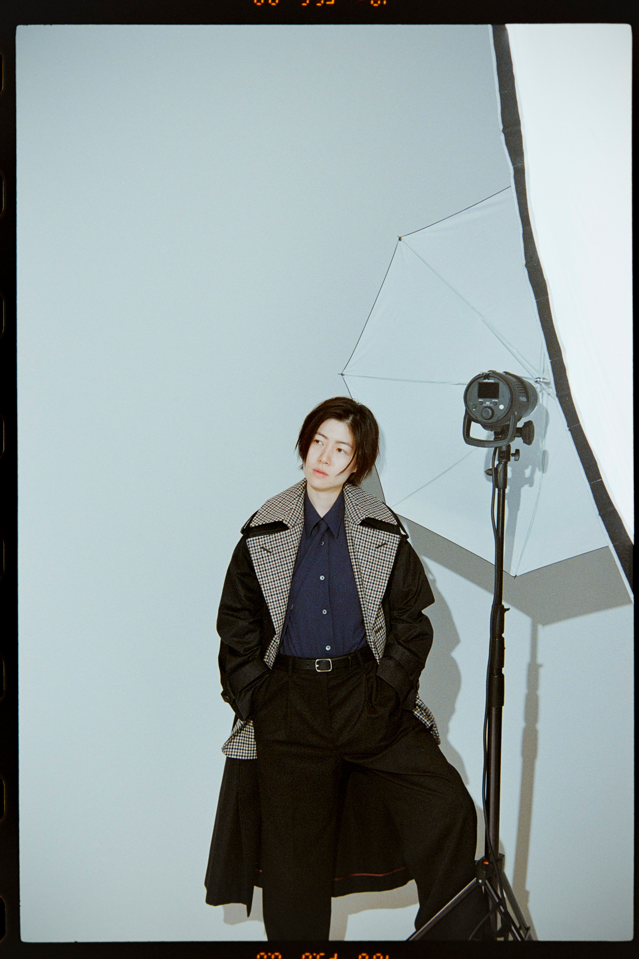 シムが選んだのは、衿元にのぞくチェック柄が印象的なブラックのトレンチコート。ドッキングされたビッグカラーとワイドシルエットが、クラシックなムードをモダンに引き寄せる。ネイビーのシャツとタイを合わせれば、現代版モッズスタイルの完成。