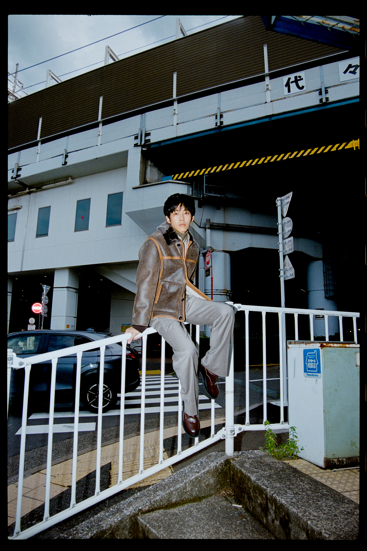 趣のあるムートンレザーブルゾンを纏った松坂。落ち着いたカラーと、随所にあしらわれたレザーテープとのコントラストがラグジュアリーな印象を演出する。ヴィンテージの風合いを感じつつも品を失わない佇まいは、技術とモダンな感性を兼ね備えた Paul Smith だから叶うバランスだ。