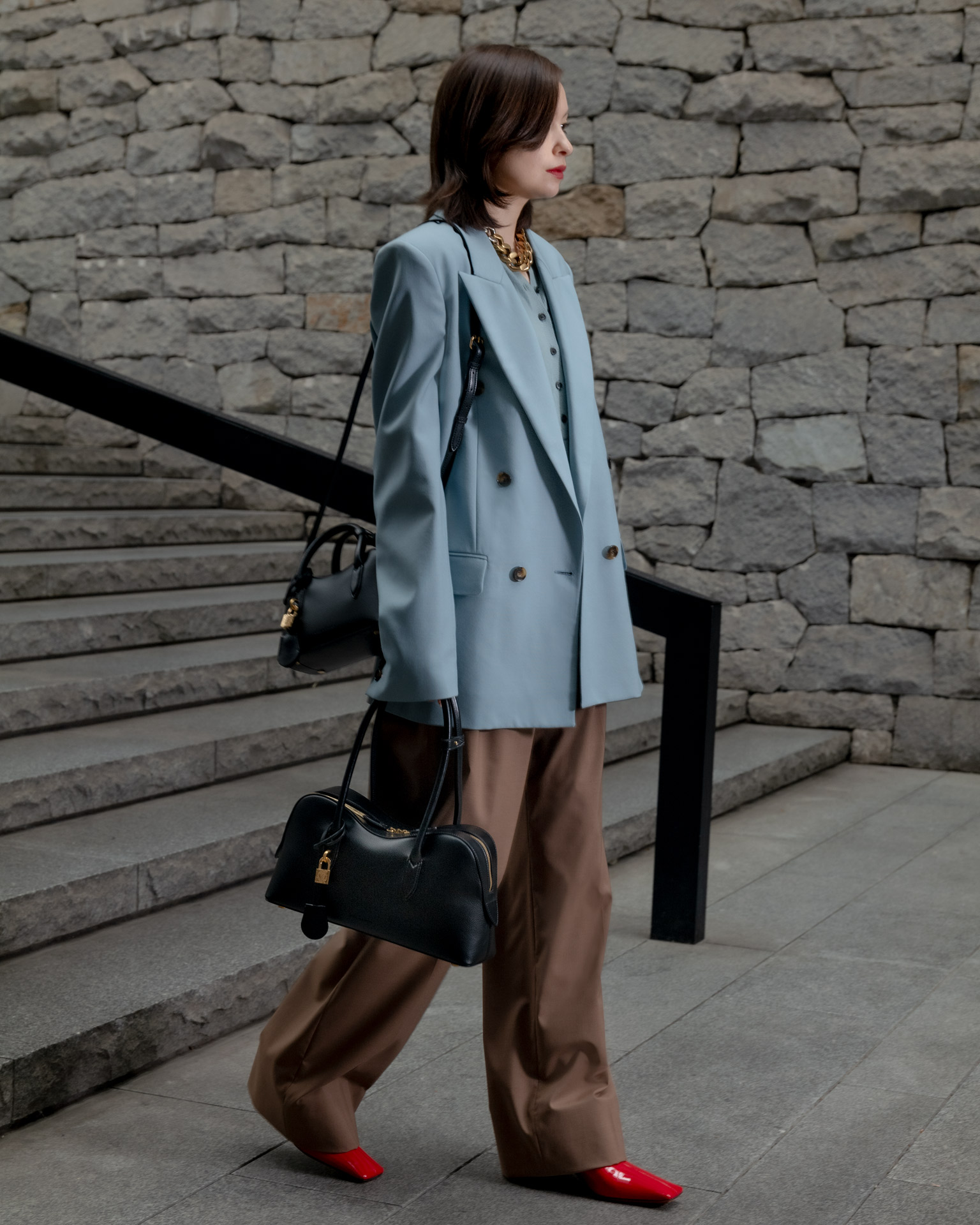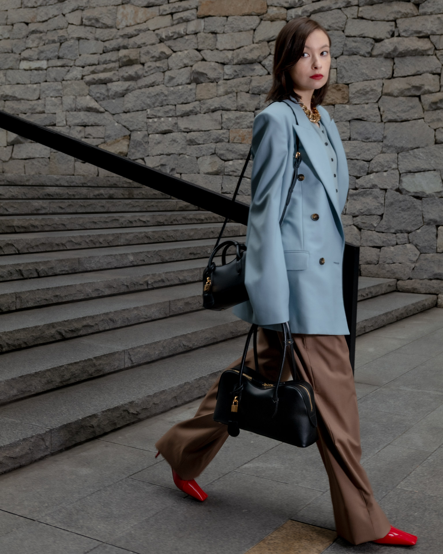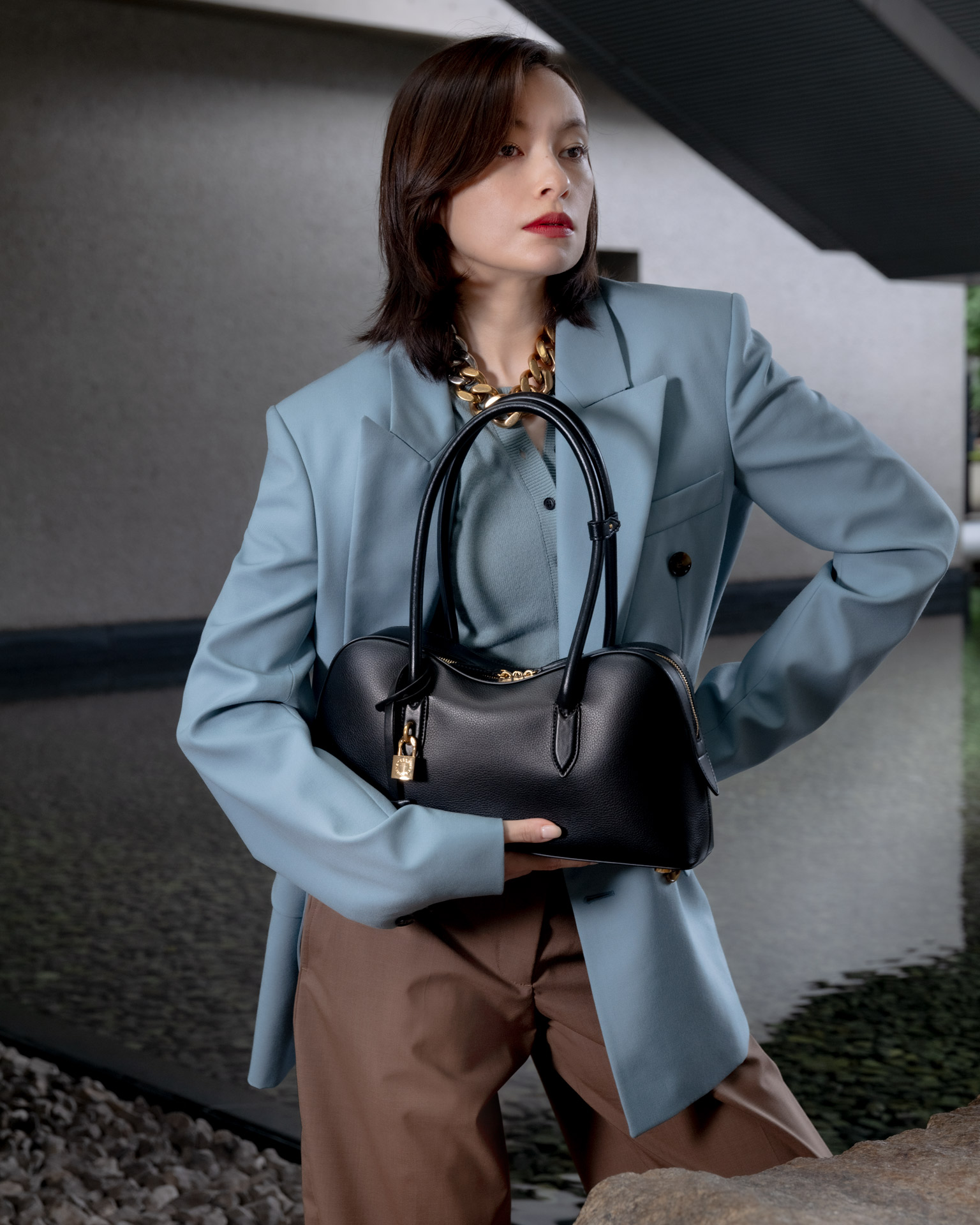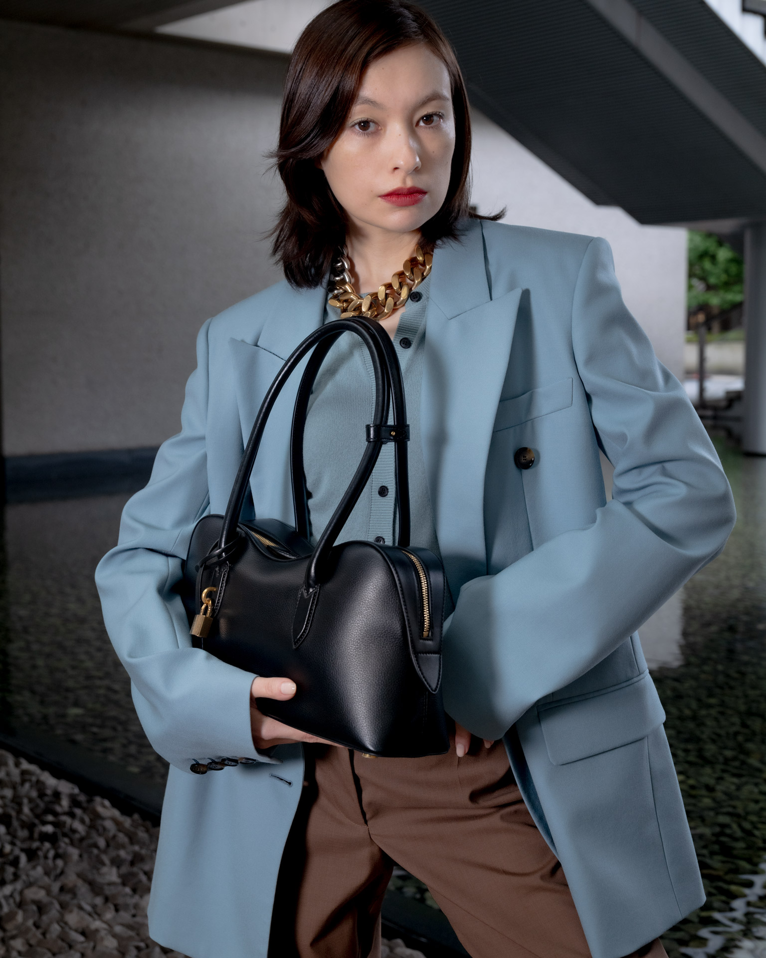 ミュートカラーのテーラードスタイルを引き締めるのは、最もクラシックなブラックの「Stella Ryder」。Stella McCartney 本人が愛する馬の背のラインから着想を得た、なだらかな曲線を描くシルエットが、装いに静かな強さを添える。洗練された佇まいでありながら、必要なものをきちんと収める容量と、佇まいを損なわないサイズバランスも魅力だ。リサイクルやブドウ由来の原料を用いたクルエルティフリーの革新的な素材使いにも、Stella McCartney ならではの美学が宿る。
