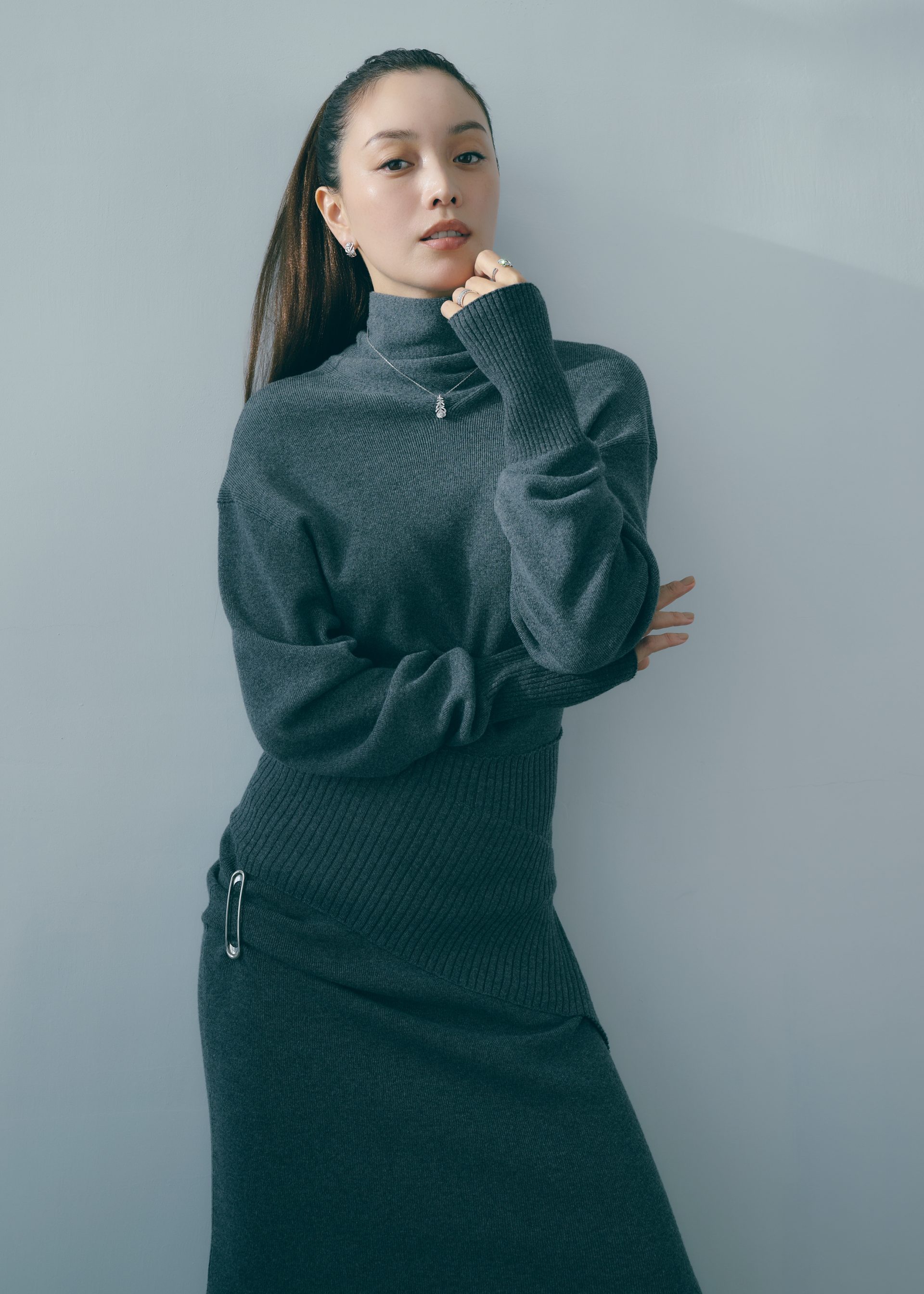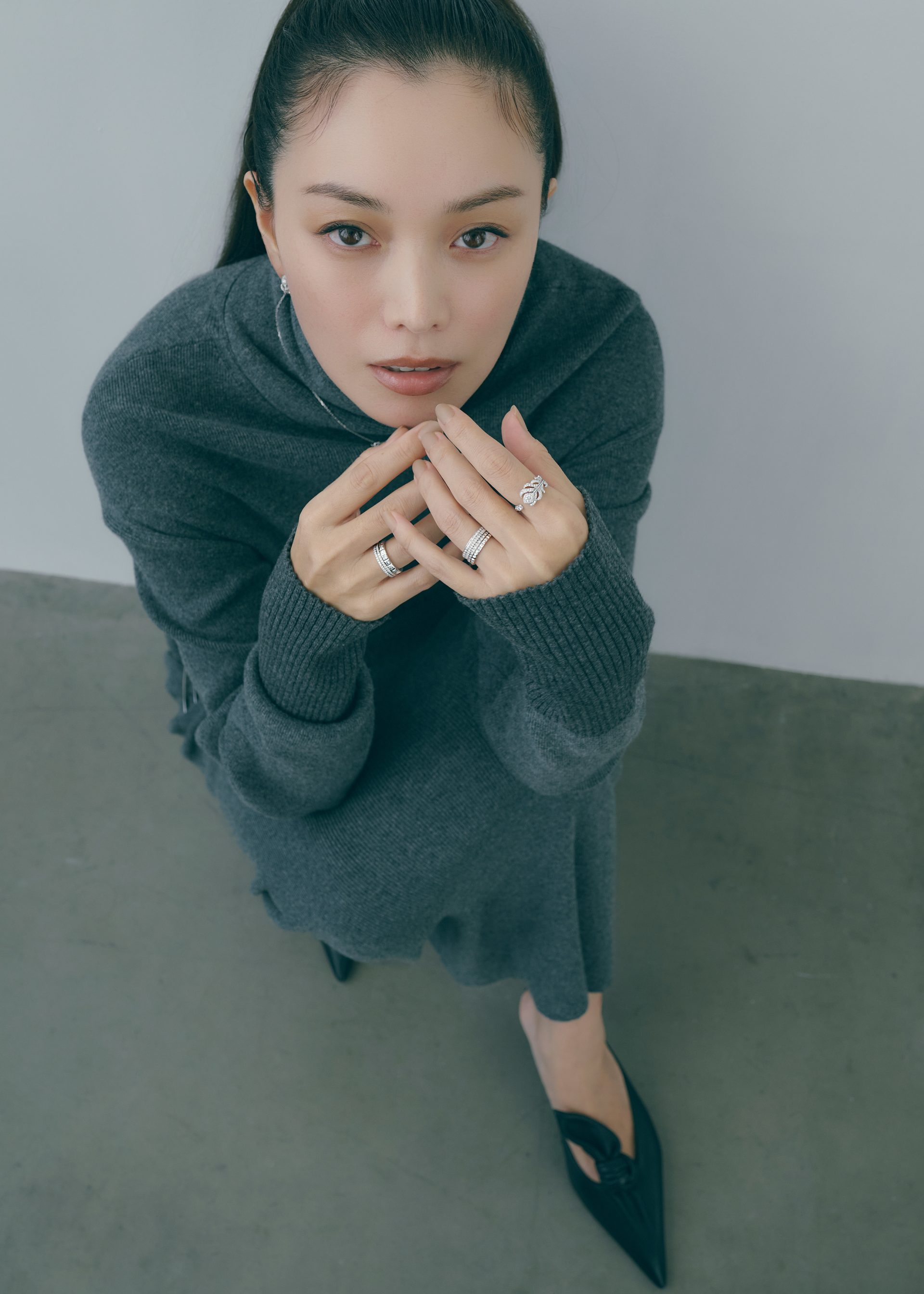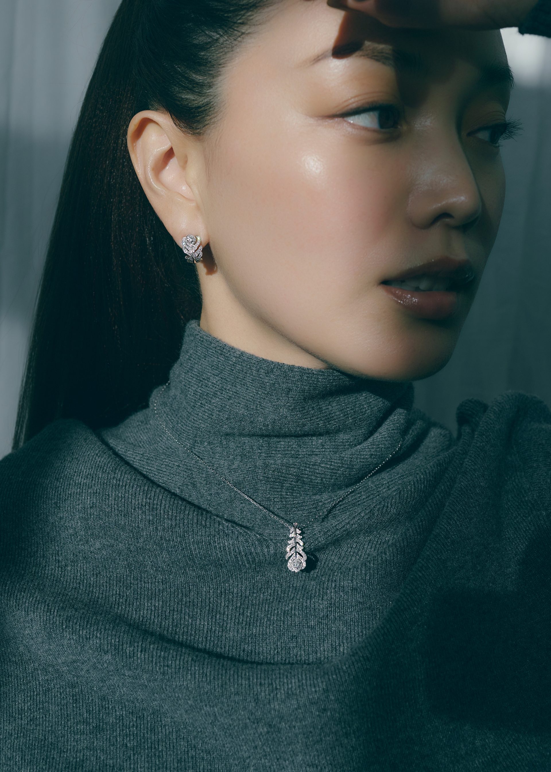 この冬の主役に「プリュム ドゥ パオン」ペンダントを迎えるなら、ホワイトゴールドのジュエリーたちで全体をシックにまとめて。顔まわりには、同コレクションのクリップイヤリングを。エクストラスモールのサイズ感は、ミニマルな装いにも自然に寄り添いながら、蛯原の端正な表情を一段とモダンに引き立てる。人差し指につけた「プリュム ドゥ パオン」リングのボリュームに合わせて、繊細なホワイトゴールドの「キャトル」をレイヤード。メゾンが継承する伝統的なデザインコードが、現代的な感性と溶け合い、より軽やかでコンテンポラリーな輝きを放つ。