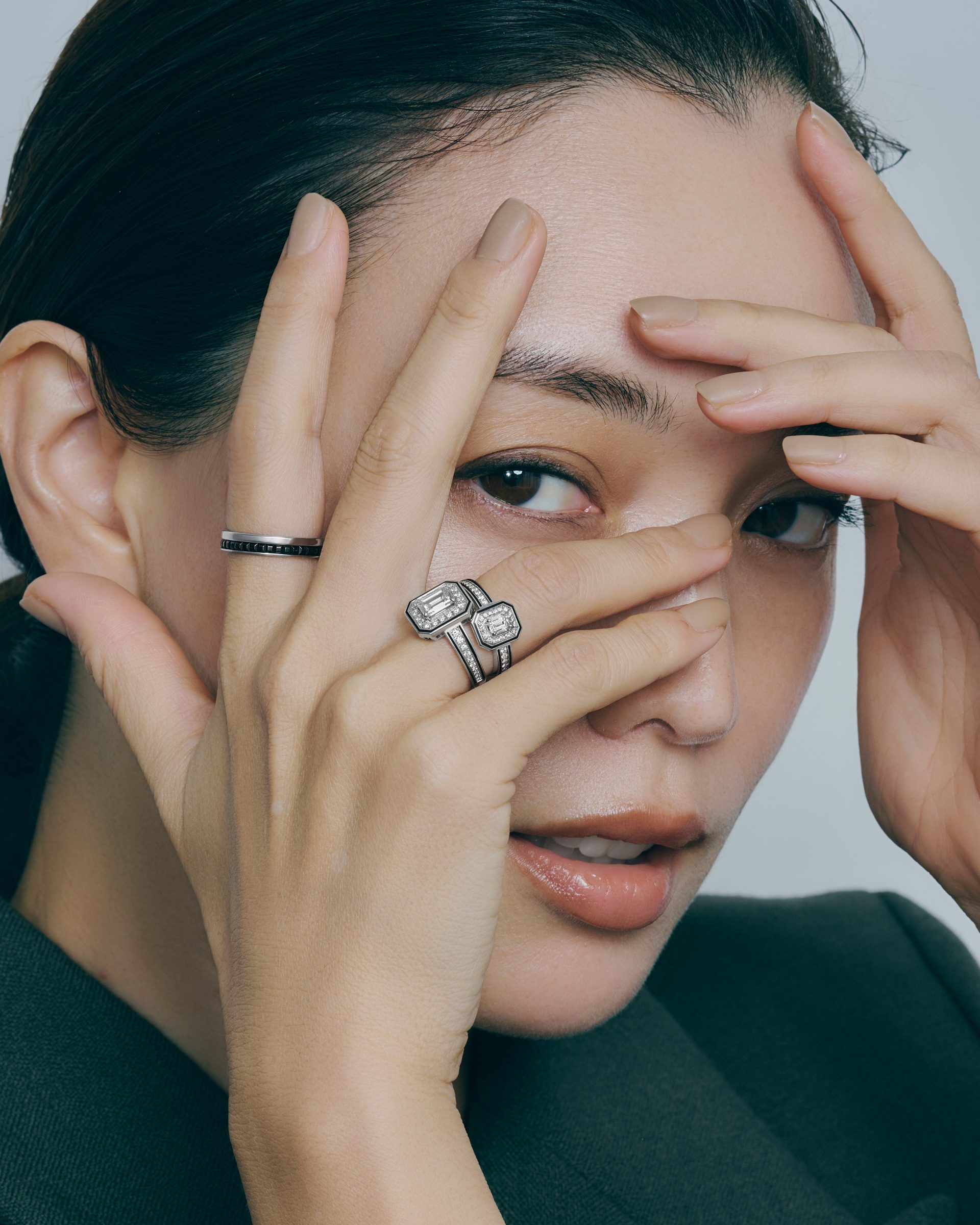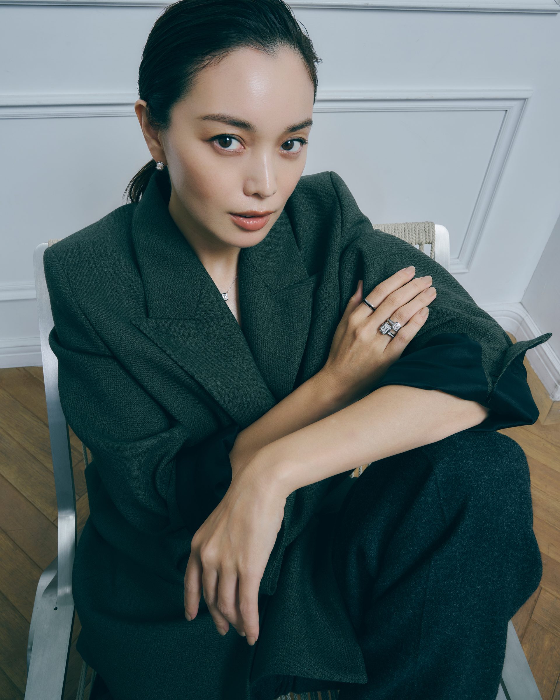 ダイヤモンドを縁取るブラックのラインが印象的な「ヴァンドーム リズレ」。ヴァンドーム広場を表現した八角形の幾何学的なフォルムに、繊細なディテールが重なり合い、アールデコの精神を現代の感性へと受け継いでいる。タイムレスな美を求める人に寄り添う、色褪せない輝きを放つジュエリーだ。蛯原は、「ヴァンドーム リズレ」リングを大胆にサイズ違いでレイヤードし、モダンなスタイリングに華を添える。さらに「キャトル」ブラックのリングを合わせて、知性あふれるハンサムな女性像に。1年の終わりの自分へのご褒美として。また、自信を与えてくれるタリスマンとして。タイムレスな美しさを味方に、自分らしい輝きを纏って。