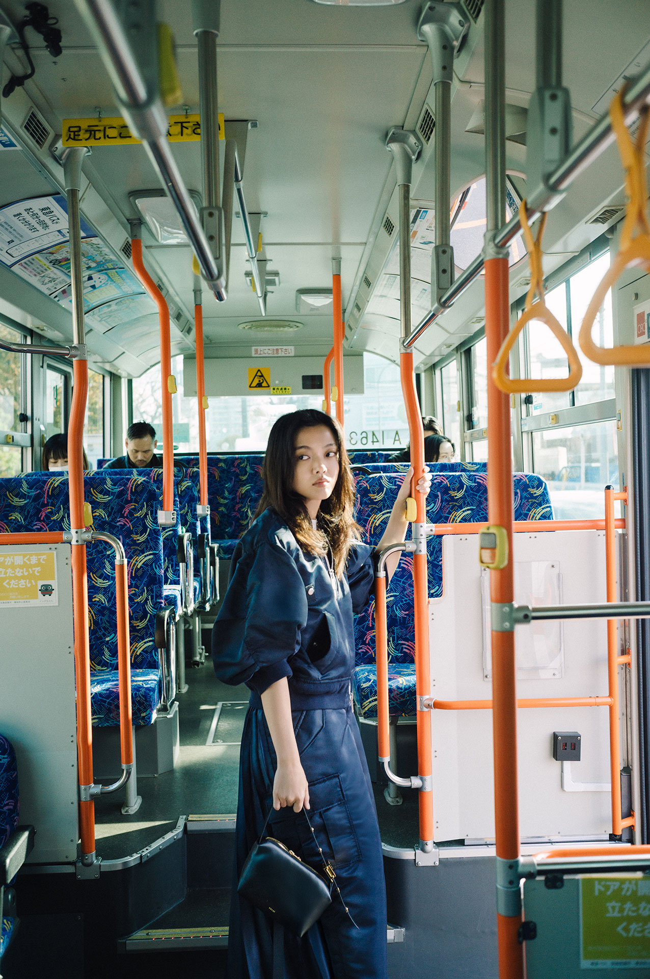 福島リラが纏うのは、ナイロンツイルのブルゾンとスカートのセットアップ。sacai を象徴する MA-1 ブルゾンの新色ネイビーは、パフスリーブやショート丈によって軽快な印象にアップデート。ミリタリーの要素を残しながら、スカートのバックに施されたプリーツが動きに合わせて揺れ、フェミニンな表情を添える。