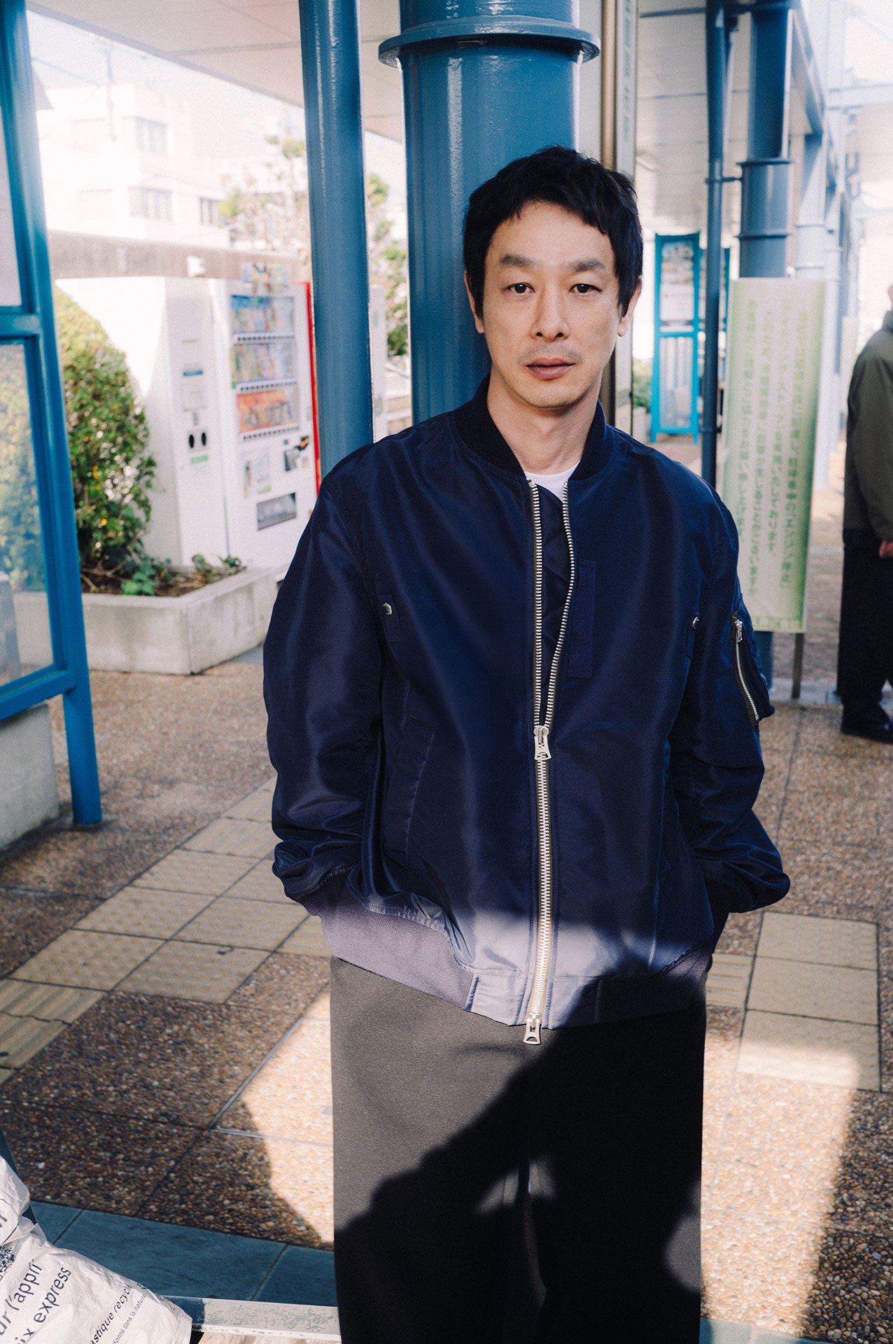 加瀬亮が袖を通したのは、sacai を象徴する MA-1 ブルゾンの新色ネイビー。肩や身頃のパターンや素材の厚みが生む立体的なシルエットが特徴で、端正なミリタリーラインにブランドならではの奥行きを添えている。
