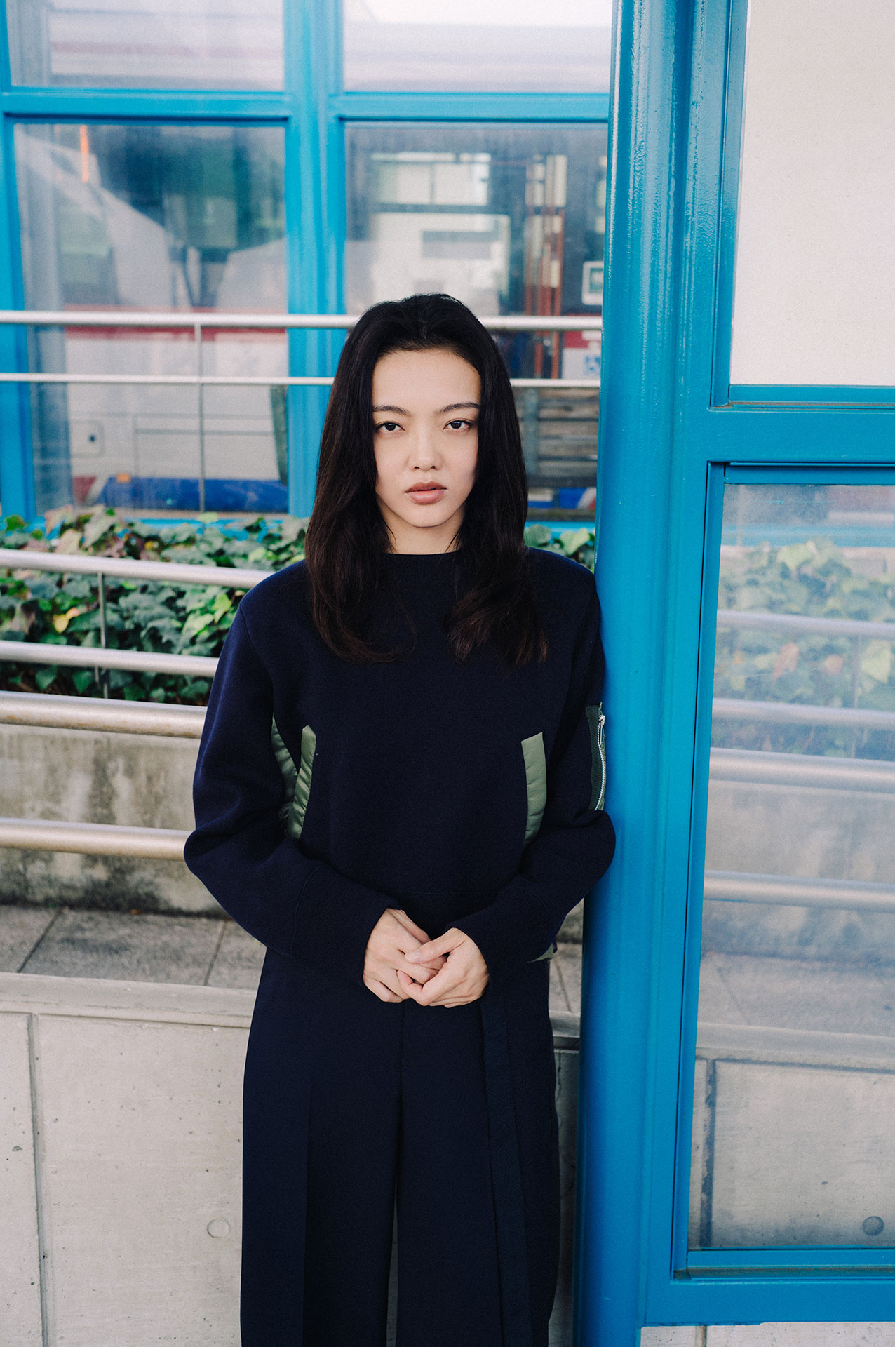 福島リラが纏うのは、加瀬のスタイリングでも使用されたスポンジスウェットのプルオーバー。スウェットのカジュアルな佇まいと、