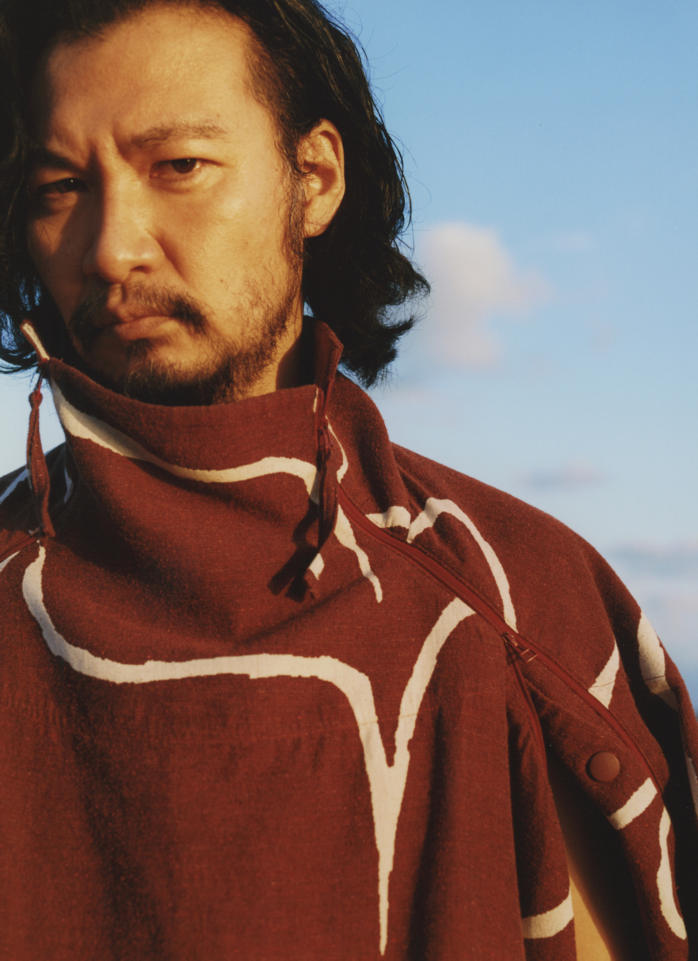 夕刻の風と光をはらみ、一枚の布が静かに立ち上がる。加守田章二の《彩色壺》から着想を得た「EARTH」は、白く立ち上がる波のような文様と、赤く彩色された土の層を織りによって描き出したシリーズだ。壺の表面を覆う波模様と、土のざらつき、さらに光を受けてきらめく粒子の表情までもを、テキスタイルとして丁寧に置き換えている。コートの衿元から走る切り込み線はフォルムを導き、動きに応じて、壺を思わせる構築的なシルエットへと姿を変える。