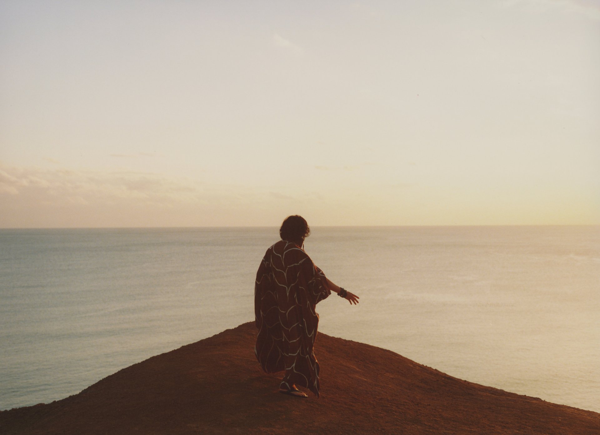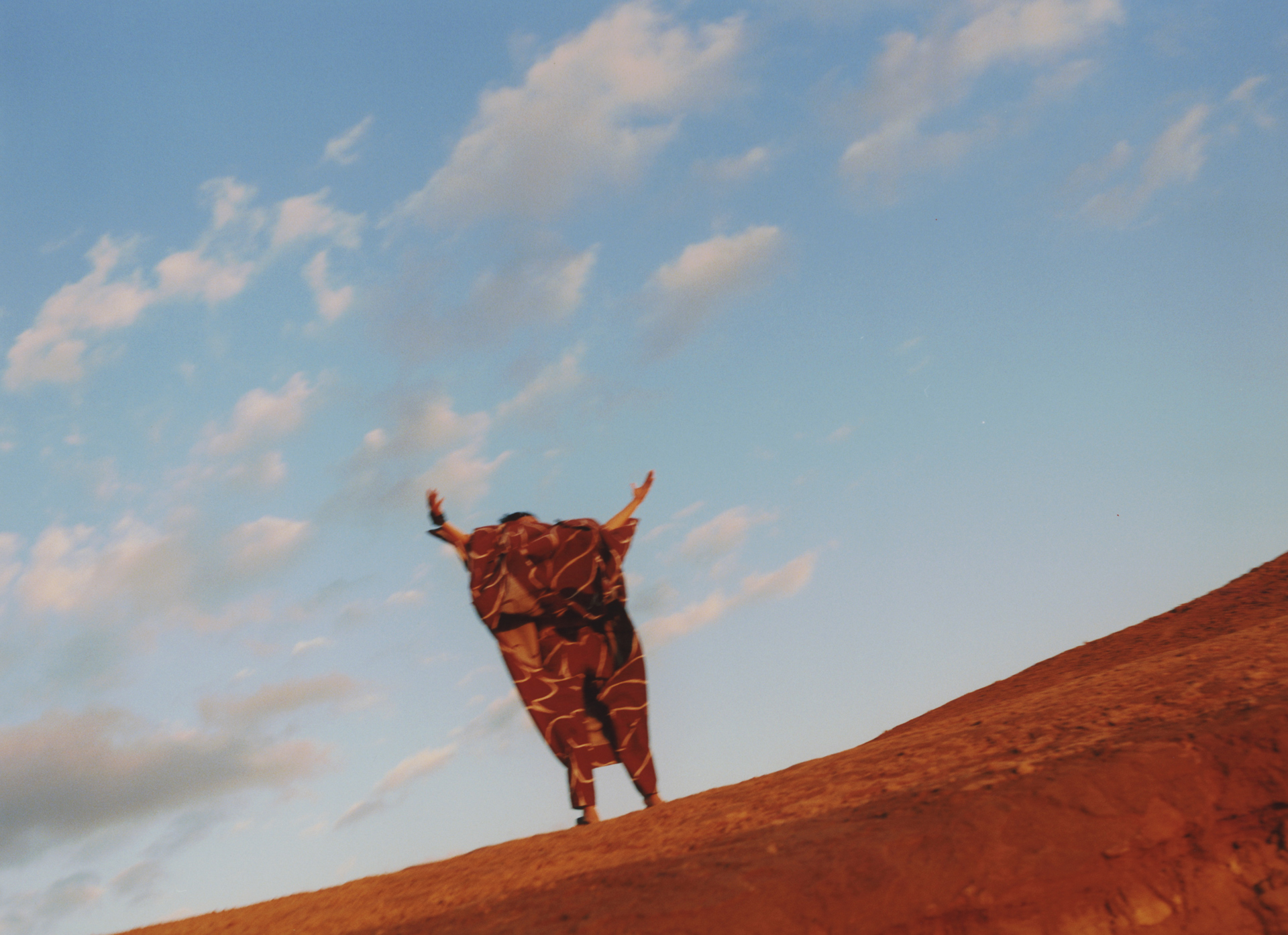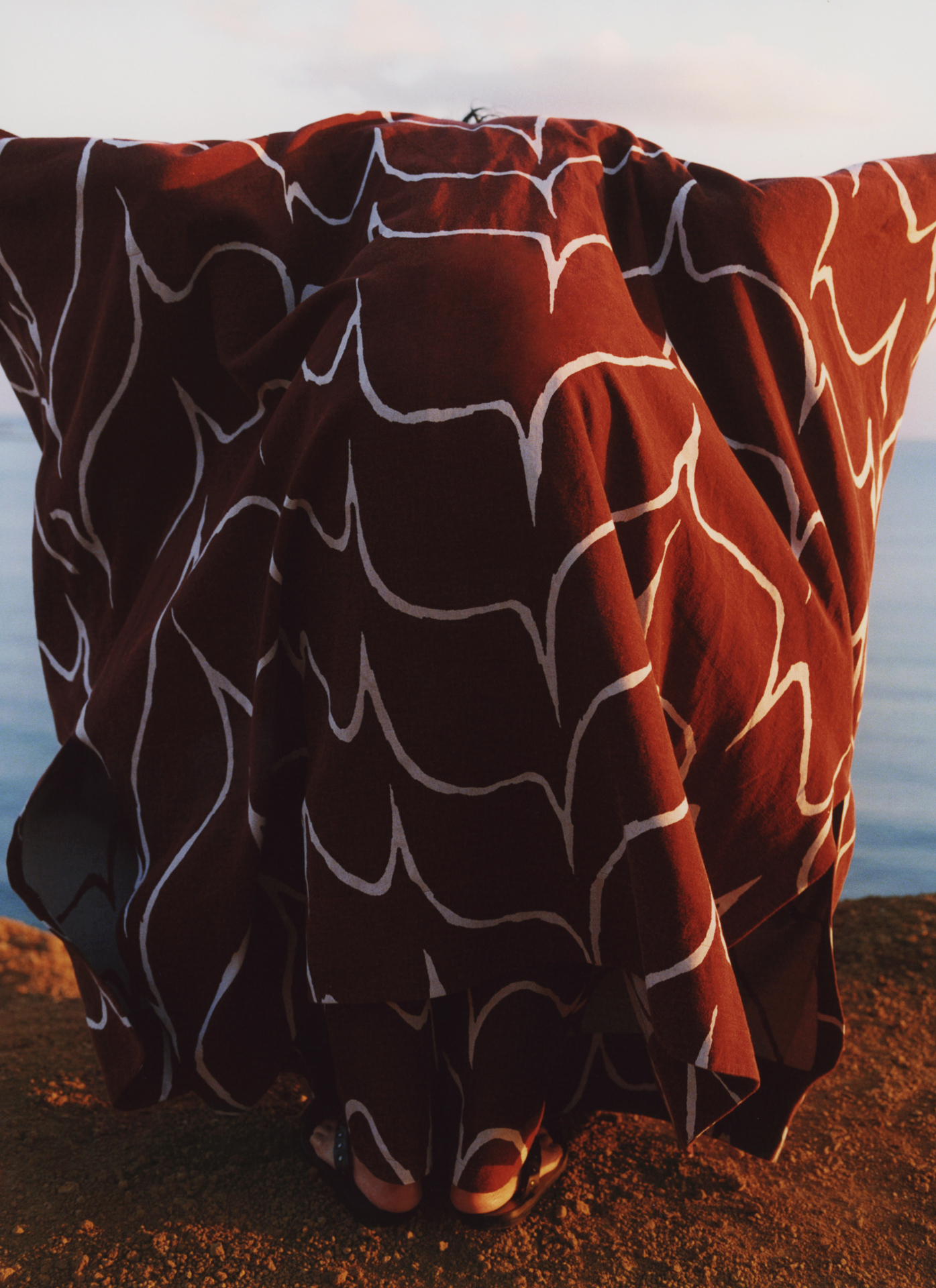 大地の上、静謐な風景のなかで、布が大きく呼吸する。無造作な風が通り抜けるたび、身体の輪郭は揺らぎ、自由な線を描きはじめる。
