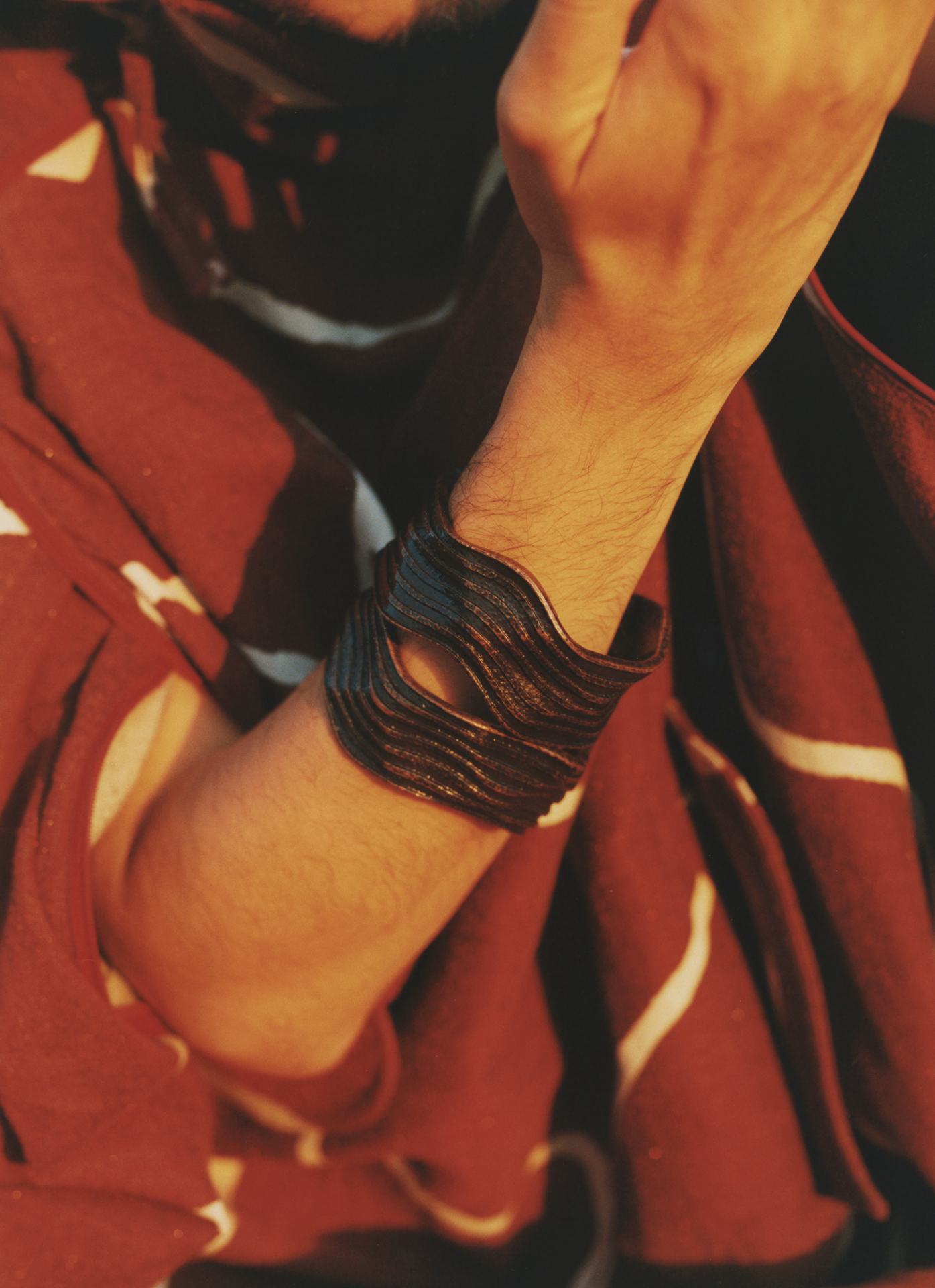 手元には、《曲線彫文》の佇まいを宿した「ENGRAVE」のバングルを重ねて。緻密に設計された有機的なラインと、あえて仕上げを剥がした表面には焼き物のような余韻が浮かび上がる。素材と向き合い、そこから輪郭を導き出す—— IM MEN と加守田章二、ふたつの創造性が、装いのなかで重なり合う。