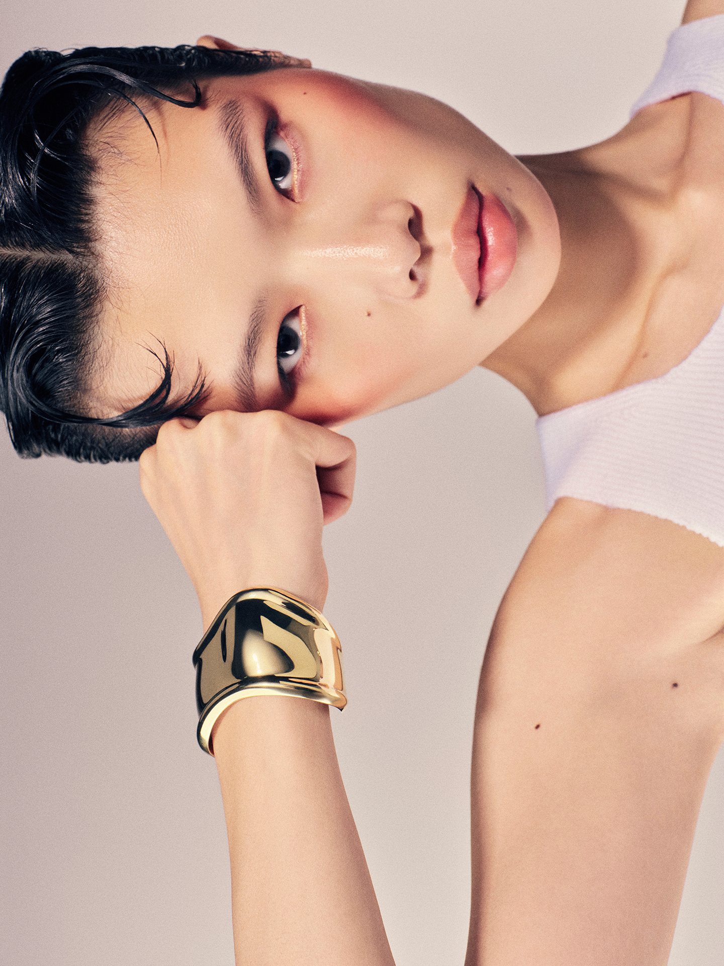 スポーティなリブのタンクトップと、彫刻のようなシルエットのトラウザーズは、Pieter Mulier (ピーター・ミュリエ) による ALAÏA (アライア) のルック。手もとに合わせたのは、Tiffany & Co. の「ボーン カフ」。伝説のデザイナー Elsa Peretti (エルサ・ペレッティ) によって1970年にデザインされた不朽の名作だ。目を見張るようなミラーポリッシュの仕上げ、そして手首に寄り添う有機的なシルエットが鮮烈な印象を放つステートメントピースは、タイガーアイを組み合わせた個性的なバリエーションとペアで合わせて。