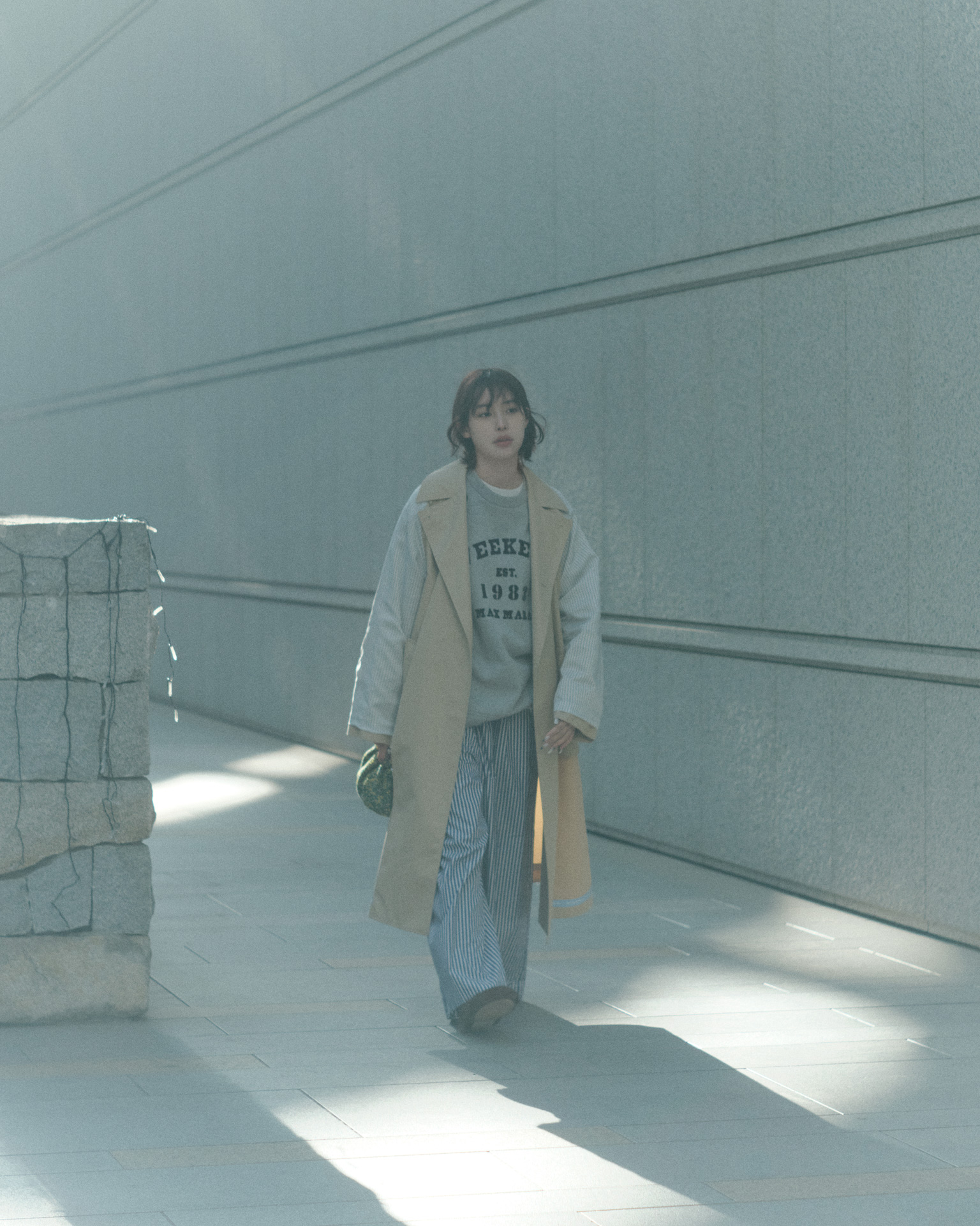 Weekend Max Maraを象徴するトラディショナルな気品をまとったトレンチコートは、近づくほどに違う表情を見せる。端正なベージュの奥にのぞくのは、ストライプのスリーブにロゴとカラーラインが走る、もうひとつの顔だ。リバーシブル仕様となっており、ブランドの遊び心を随所に散りばめた一着。クラシックな佇まいに潜んでいた、思いがけないときめき。その日のTPOや気分に合わせて表情を切り替えられる、まさに「これさえあれば」と思わせる存在。オフの日のトレンチコートは、スウェットやパジャマパンツと思いっきり肩の力が抜けたアイテムで、バランス感を楽しみたい。