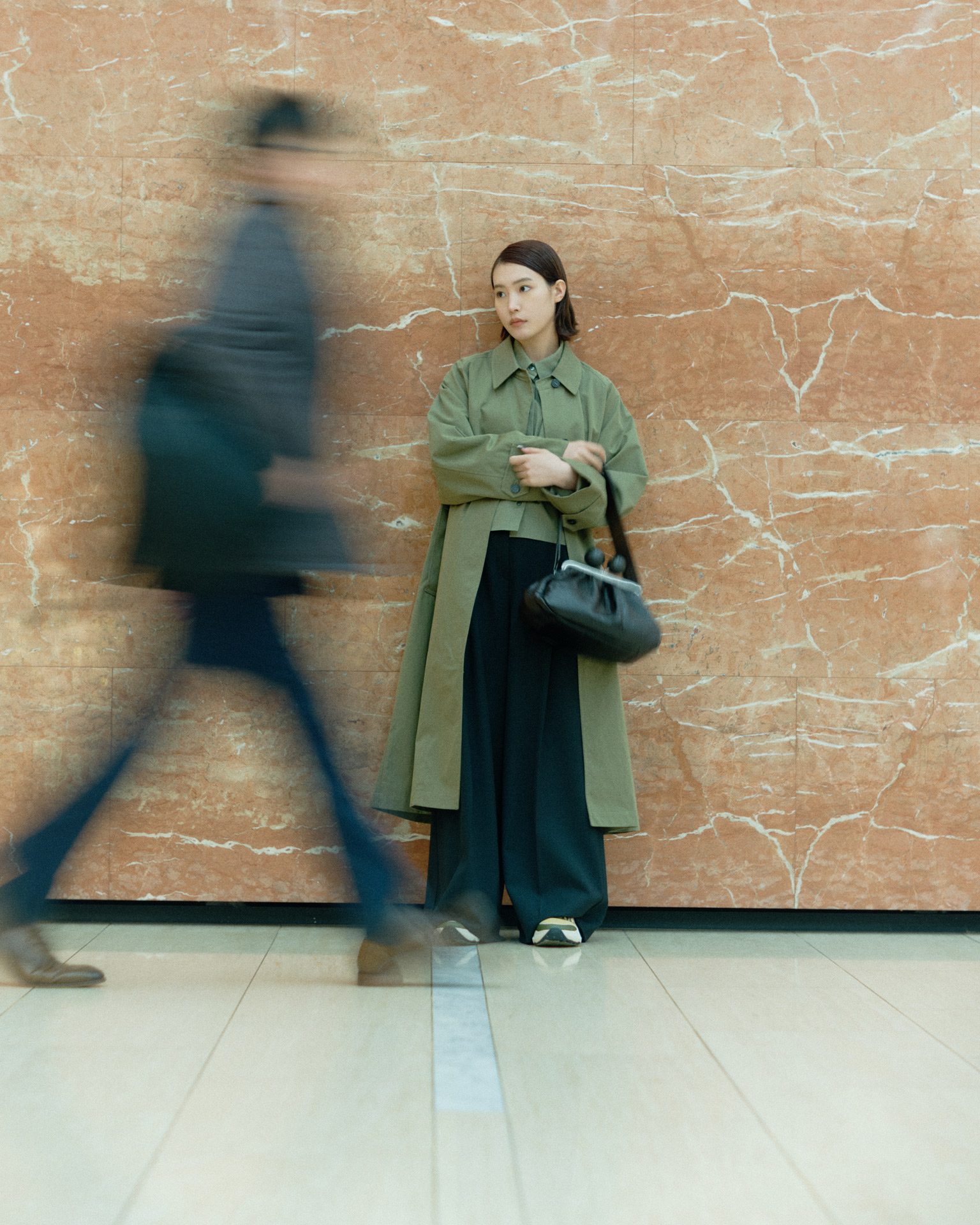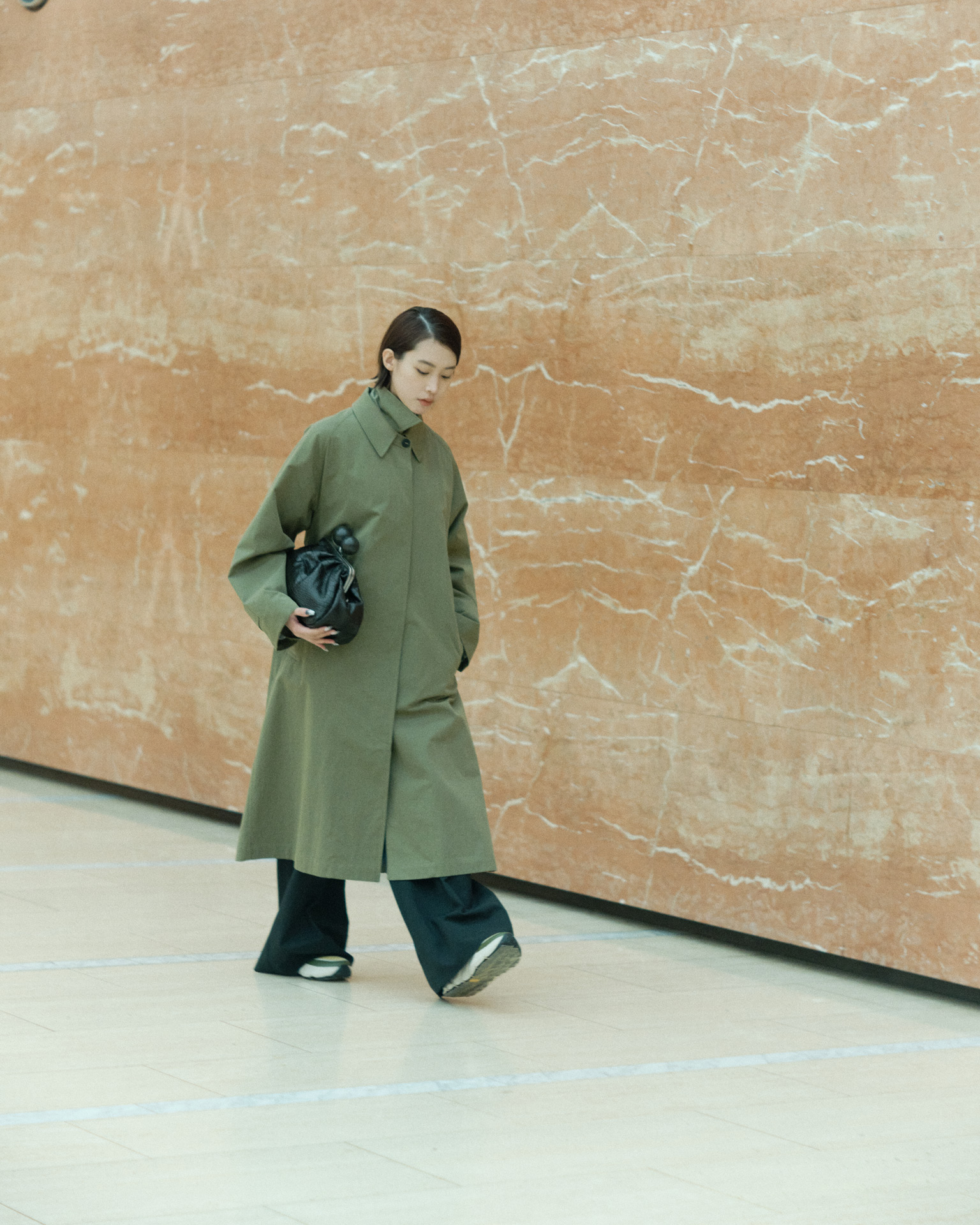 ミニマルでありながら、ひときわ存在感を放つカーキのコート。Aラインに広がるフォルムとドロップショルダーが、美しいシルエットを描き、ステンカラーの端正な表情が、都会的で知的な佇まいを添える。さらに、撥水加工が施されているため、突然の雨にも気負わず羽織れるのも魅力。アイコニックなパスティチーノバッグが、スタイリングにアクセントを。シックなアイテムに遊び心を掛け合わせて、他と差をつける上級者の大人な休日スタイルを楽しんで。