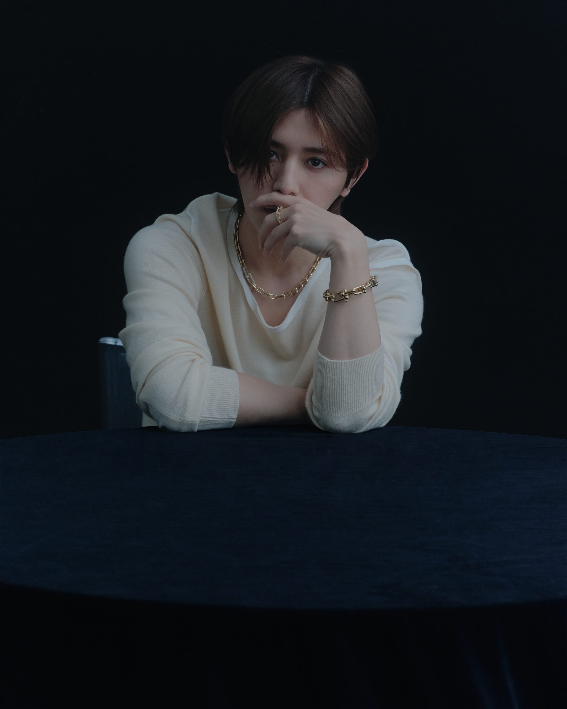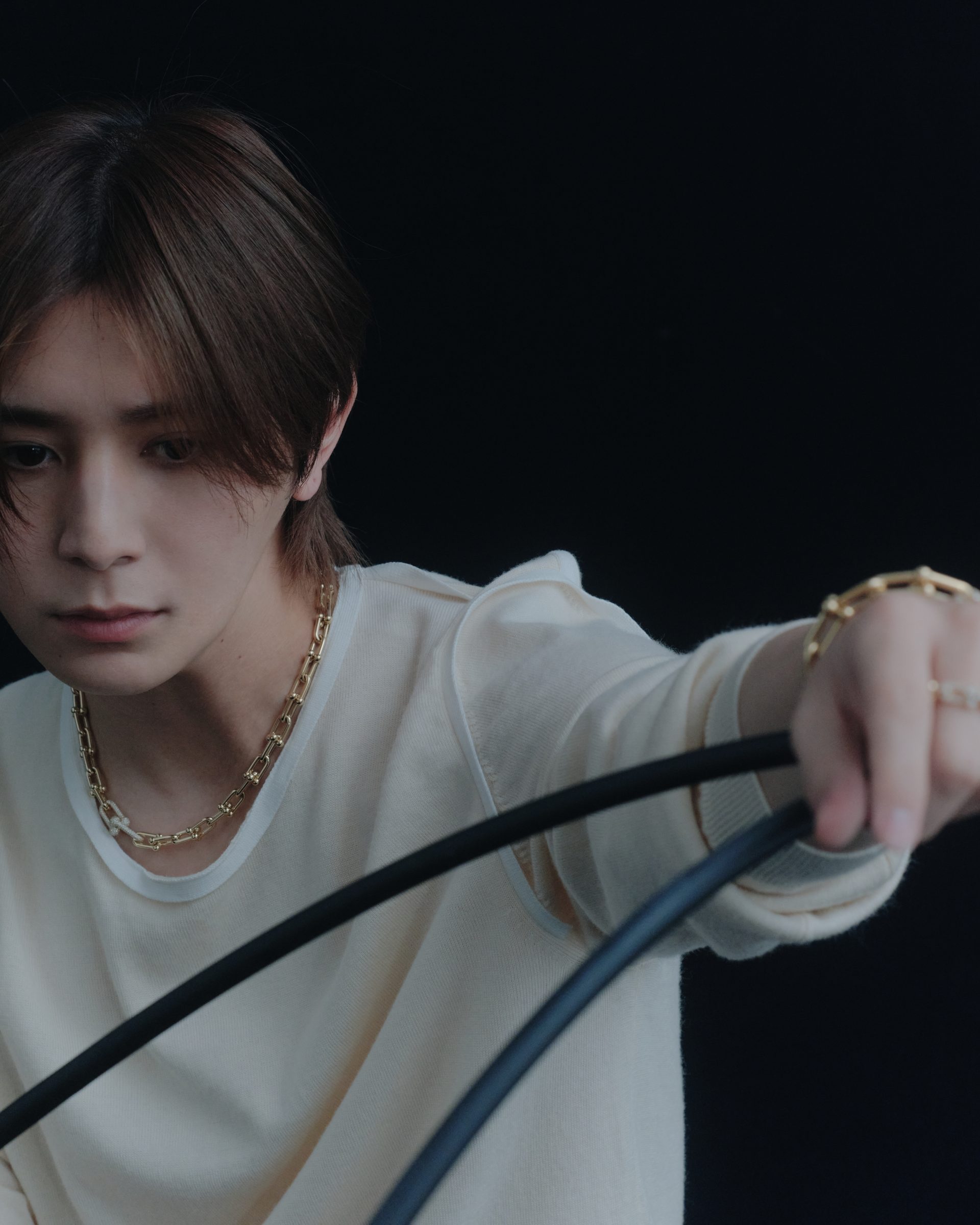 最後に山田が身につけたのは、黄金に煌めく「Tiffany HardWear (ティファニー ハードウェア)」。18Kのイエローゴールドの輝きは、表現者としてさらに成熟していく彼に、いまだかつてないほど似合う。圧倒的な存在感を放ちながらも、驚くほどしなやかな肌馴染み。ネックレスやブレスレットを大胆にレイヤードし、指もとにリングを重ねてもなお、Tiffany & Co. の美学は品を損わず、魅力を遺憾なく発揮する。組み合わせは、自分次第。自己に向き合い、選び抜いたジュエリーを重ねるたびに、装いは意志へと変わる。積み重ねられた輝きは、やがてその人のスタイルとなり、誰にも真似できないアイデンティティをかたちづくる。
