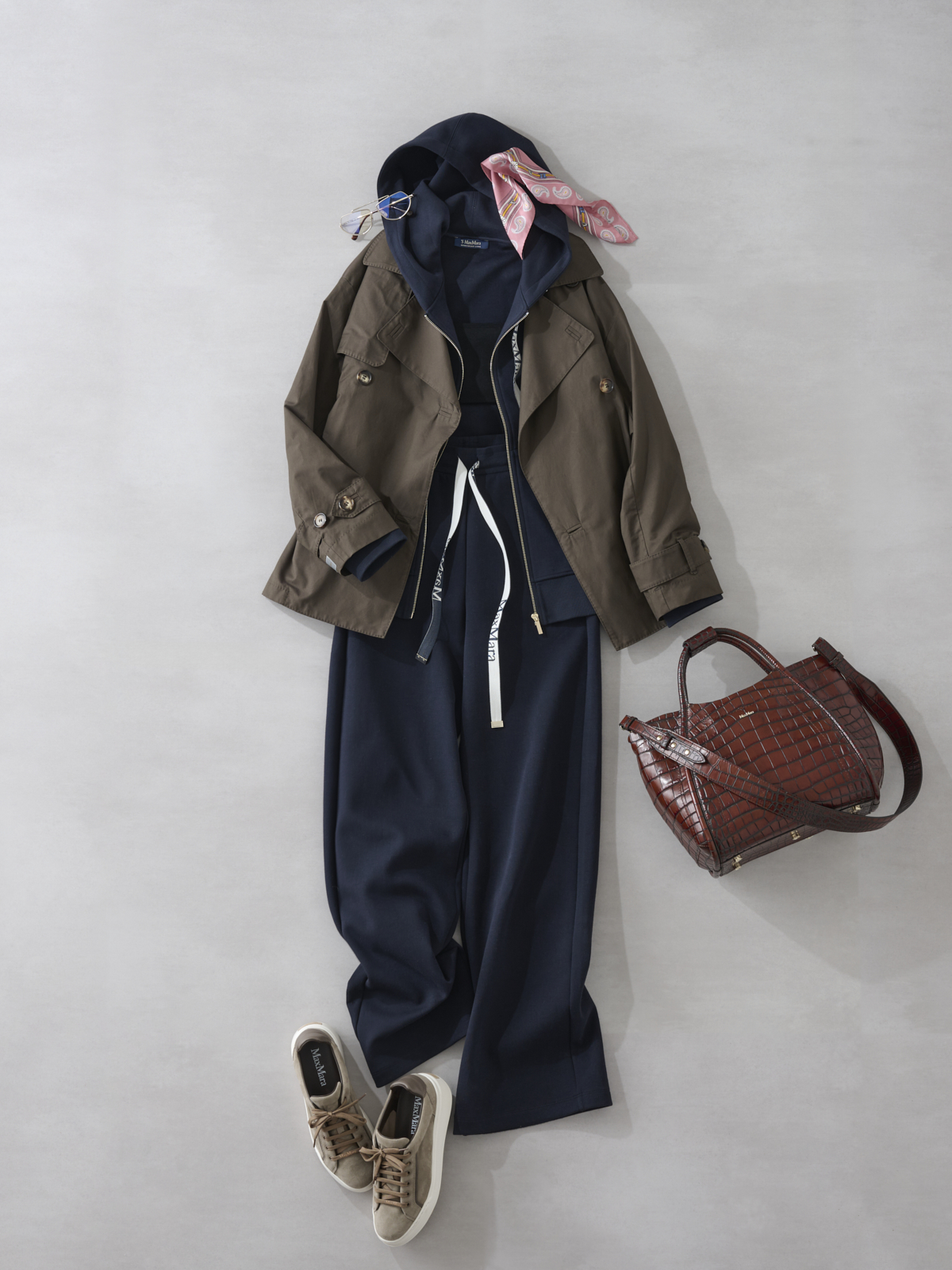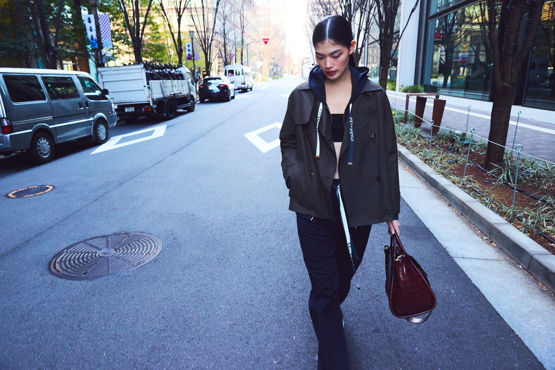 トレンチコートの内側にフーディを差し込み、アウターにスポーティな要素を重ねたルック。ブラトップの抜けとロゴディテールが軽やかなリズムを生み、クラシックなアウターに新しい表情をもたらす。