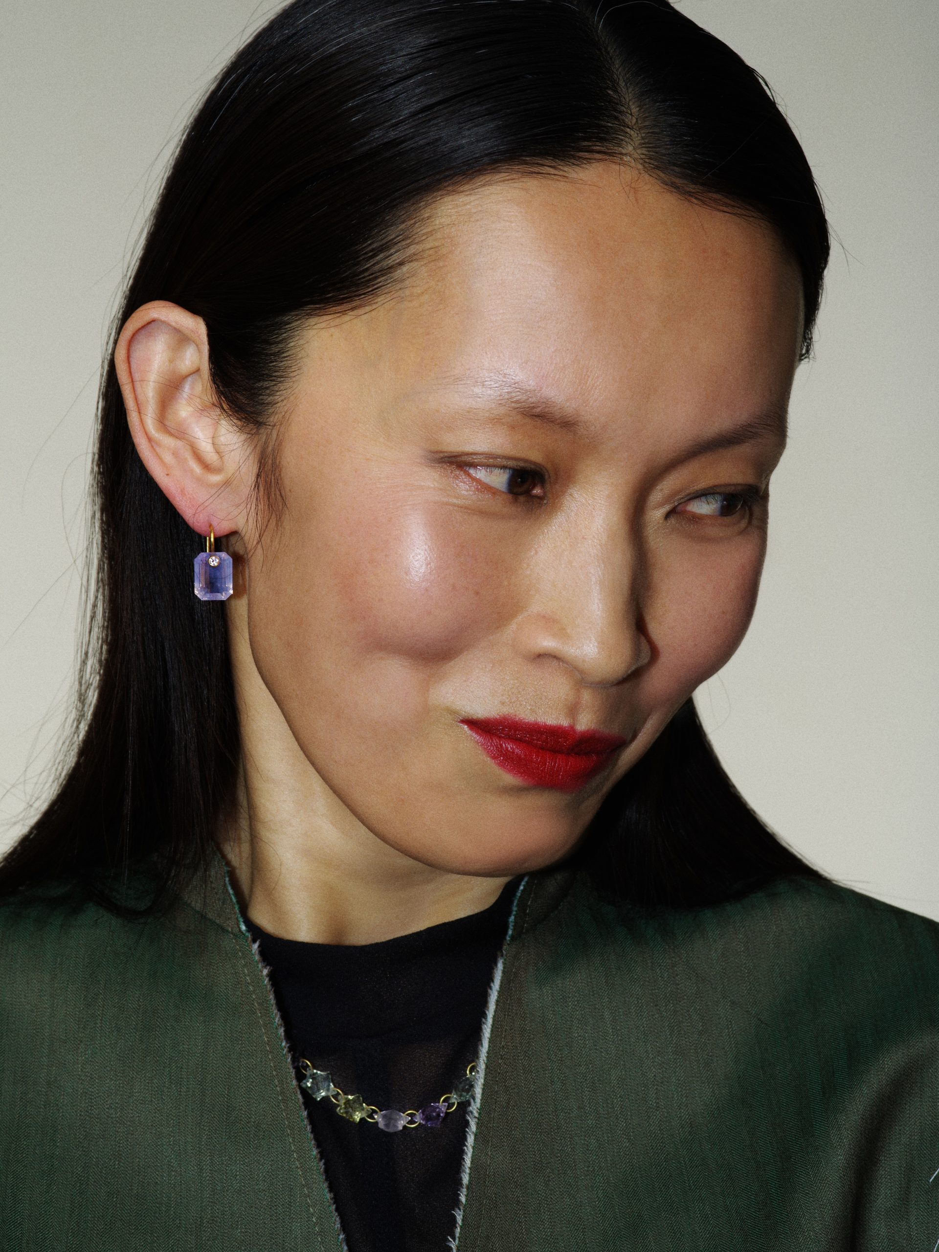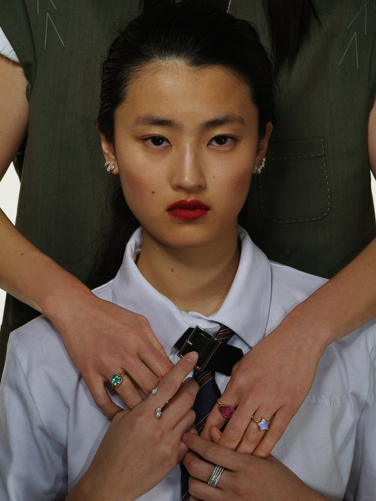 クリーンなポロシャツにタイ、ダメージ加工を施したデニムでまとめたスクールガール風のスタイルに合わせるのは、コンテンポラリーアートのような独創的なデザインでジュエリートレンドを牽引する REPOSSI (レポシ)。まるで肌の上にダイヤモンドが浮遊したような「セルティ・シュール・ヴィド」のイヤリングや、ダイヤモンドのラインが連なる「アンティフェール」のリングが清廉な輝きを添える。アップサイクルしたスリーブレスジャケットと、美しいテーラリングのデニムがマチュアなエレガンスを漂わせるスタイルには、 Marie-Hélène de Taillac (マリーエレーヌ ドゥ タイヤック) の遊び心溢れるカラーストーンをミックス。トルマリンやクオーツ、ムーンストーンなど、個性溢れるジェムストーンが大人の遊び心を演出する。