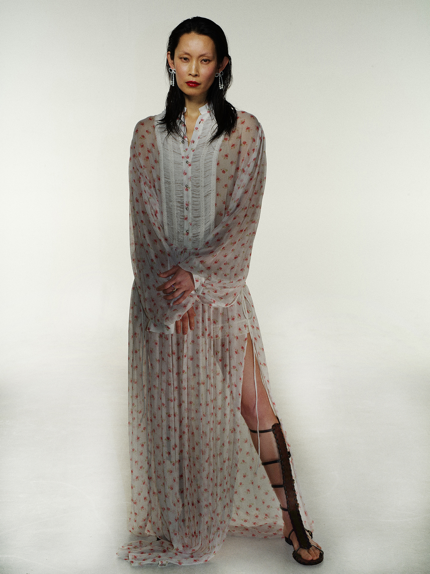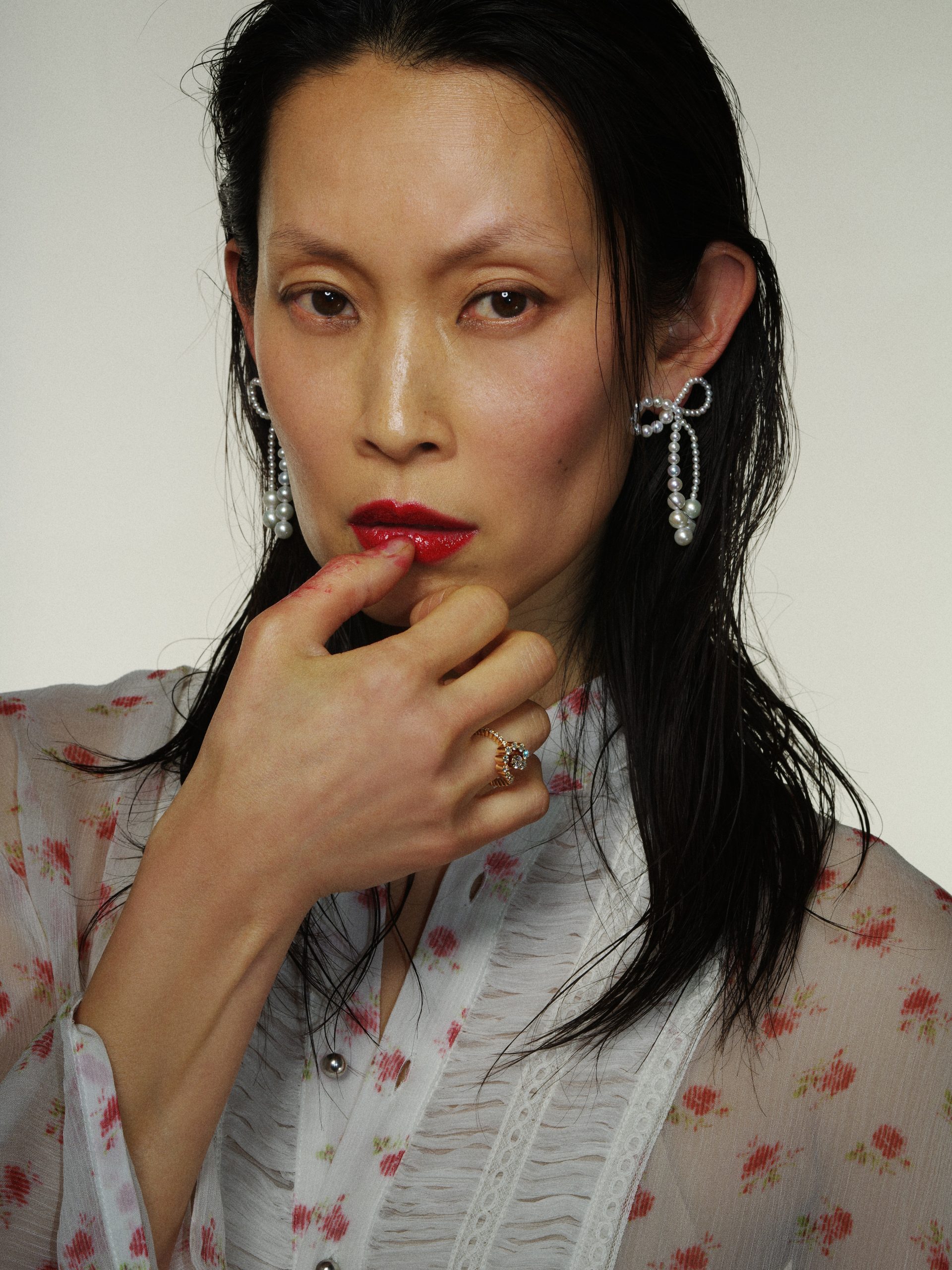 フローラルプリントを取り入れたシフォンのドレスは、 Stefano Gallici (ステファノ・ガリーチ) による Ann Demeulemeester (アン ドゥムルメステール)。 Sophie Bille Brahe (ソフィ ビル ブラーエ) のボウモチーフのパールイヤリングに、指に沿ってグラデーションを描くダイヤモンドのエタニティリングを合わせ、ノーブルな佇まいを引き立てて。