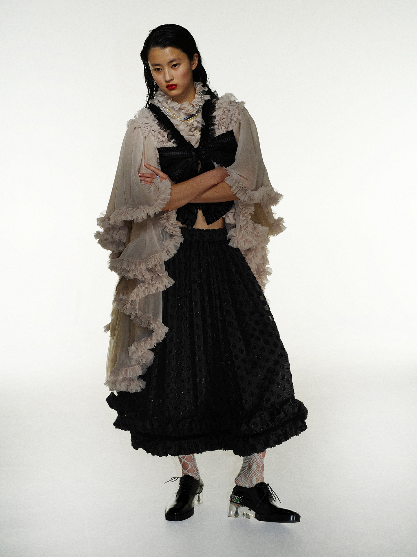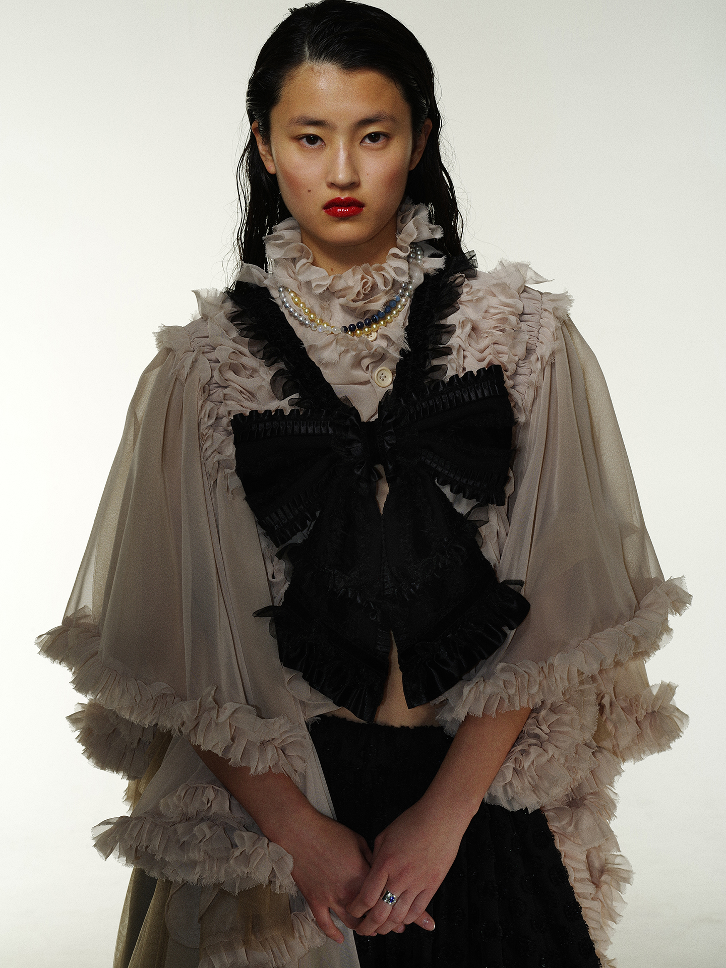 大ぶりのボウモチーフを取り入れたハーネスや大胆なラッフルが、ダークロマンティシズムを体現する noir kei ninomiya (ノワール ケイ ニノミヤ) のクリエイション。合わせるのは、デザイナー石原勇太が手がける YUTAI (ユタイ) ジュエリー。あこや真珠とカラーストーンを、繋ぎ目に気づかないほど精巧に貼り合わせた個性派パールネックレスは、エレガントでありながら型破りなスピリットを覗かせる。