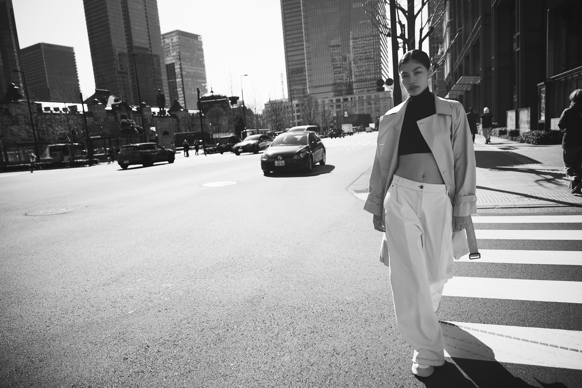ロングトレンチにクロップドニットを合わせた、ミニマルでアクティブなバランス。しなやかに揺れるコートの長さと、コンパクトなトップスのコントラストがヘルシーな抜けを生む。都市に溶け込む、クリーンな佇まい。