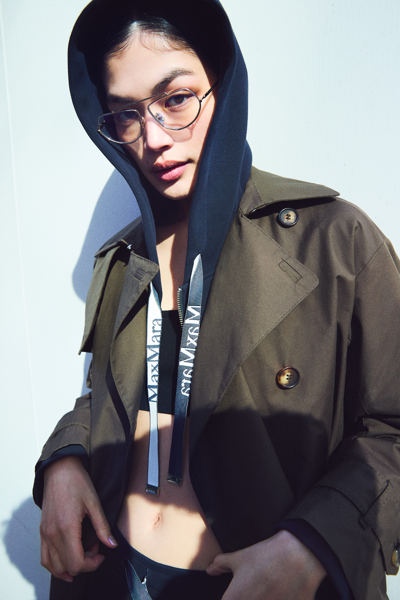 トレンチコートの内側にフーディを差し込み、アウターにスポーティな要素を重ねたルック。ブラトップの抜けとロゴディテールが軽やかなリズムを生み、クラシックなアウターに新しい表情をもたらす。