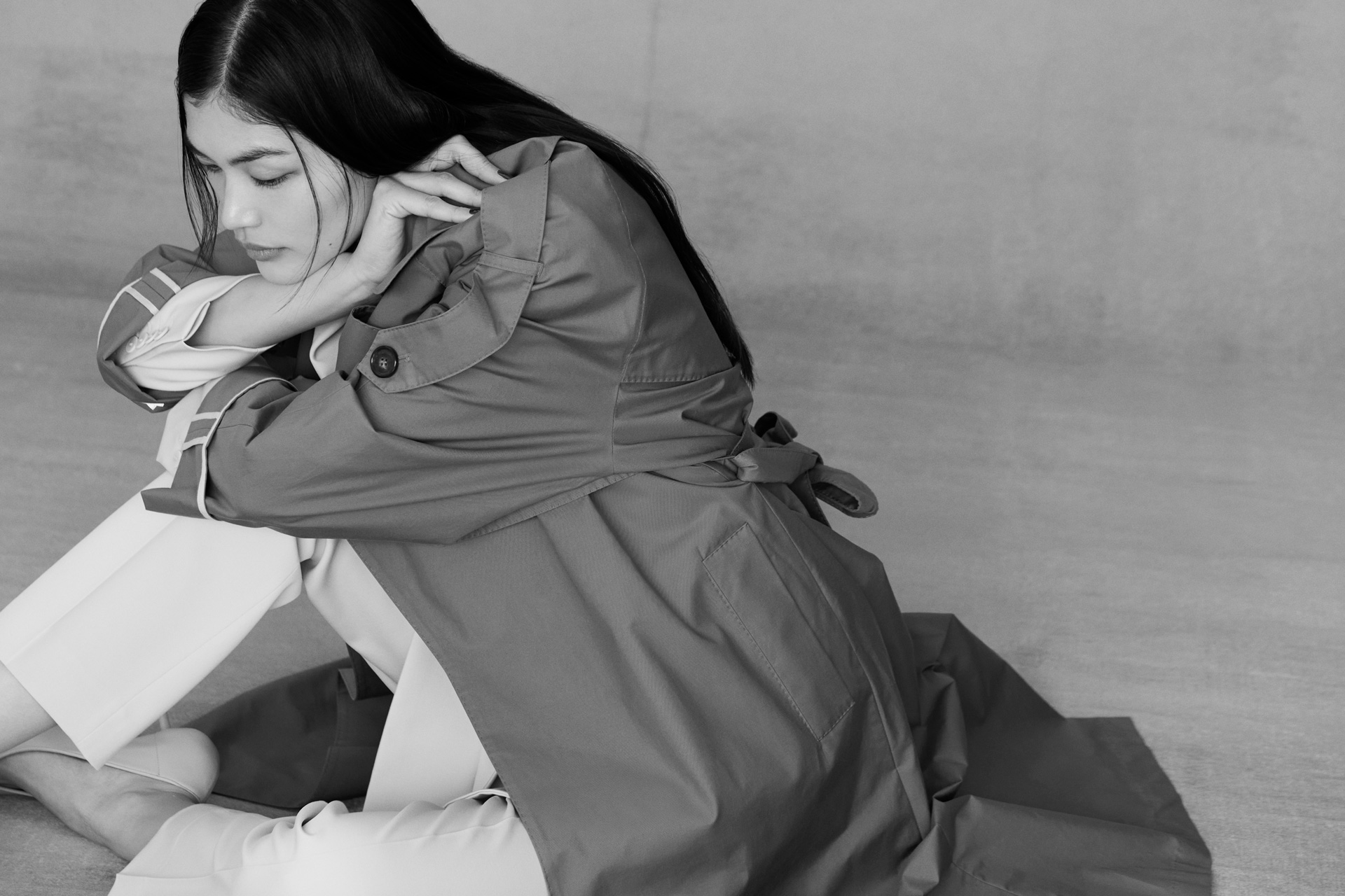 トレンチコートを主役に据え、Max Mara、Sportmax (スポーツマックス) と ’S Max Mara (エス マックスマーラ) を自由にミックスすることで、一枚のアウターでも多彩な表情を引き出す。モデルの福士リナが纏い、レイヤードによって印象を塗り替え、トレンチコートの奥深さを伝える。