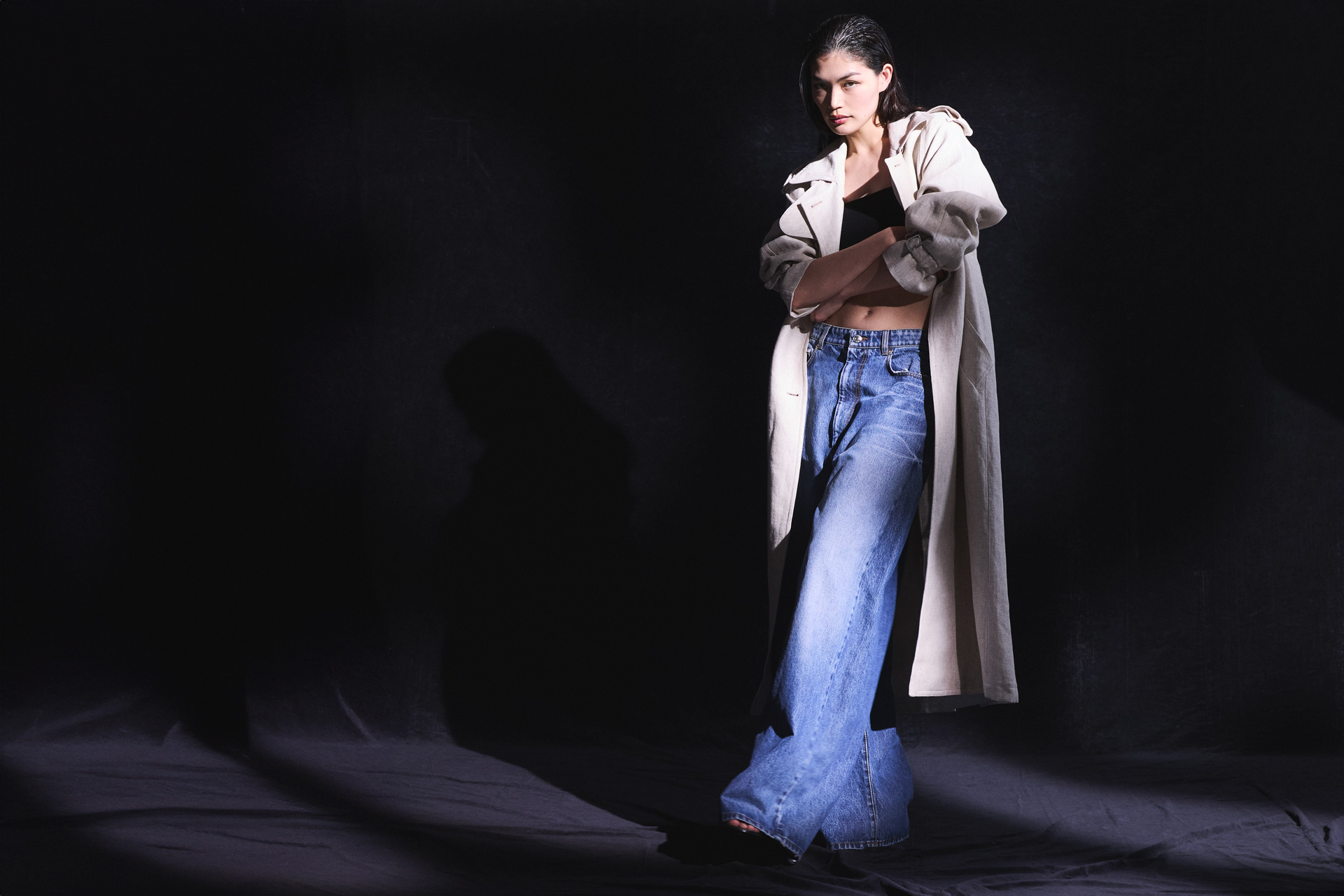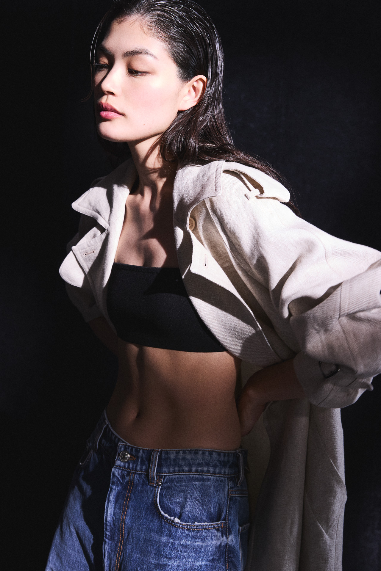 ランジェリーライクなブラトップにデニムを合わせ、トレンチコートを無造作に羽織る。あえてリラックスしたバランスをつくることで、クラシックなアウターに抜け感を。どこか彼のコートを借りたようなサイズ感が、女性らしさと力の抜けた色気を同時に引き出し、夜に映える艶やかなムードを立ち昇らせる。