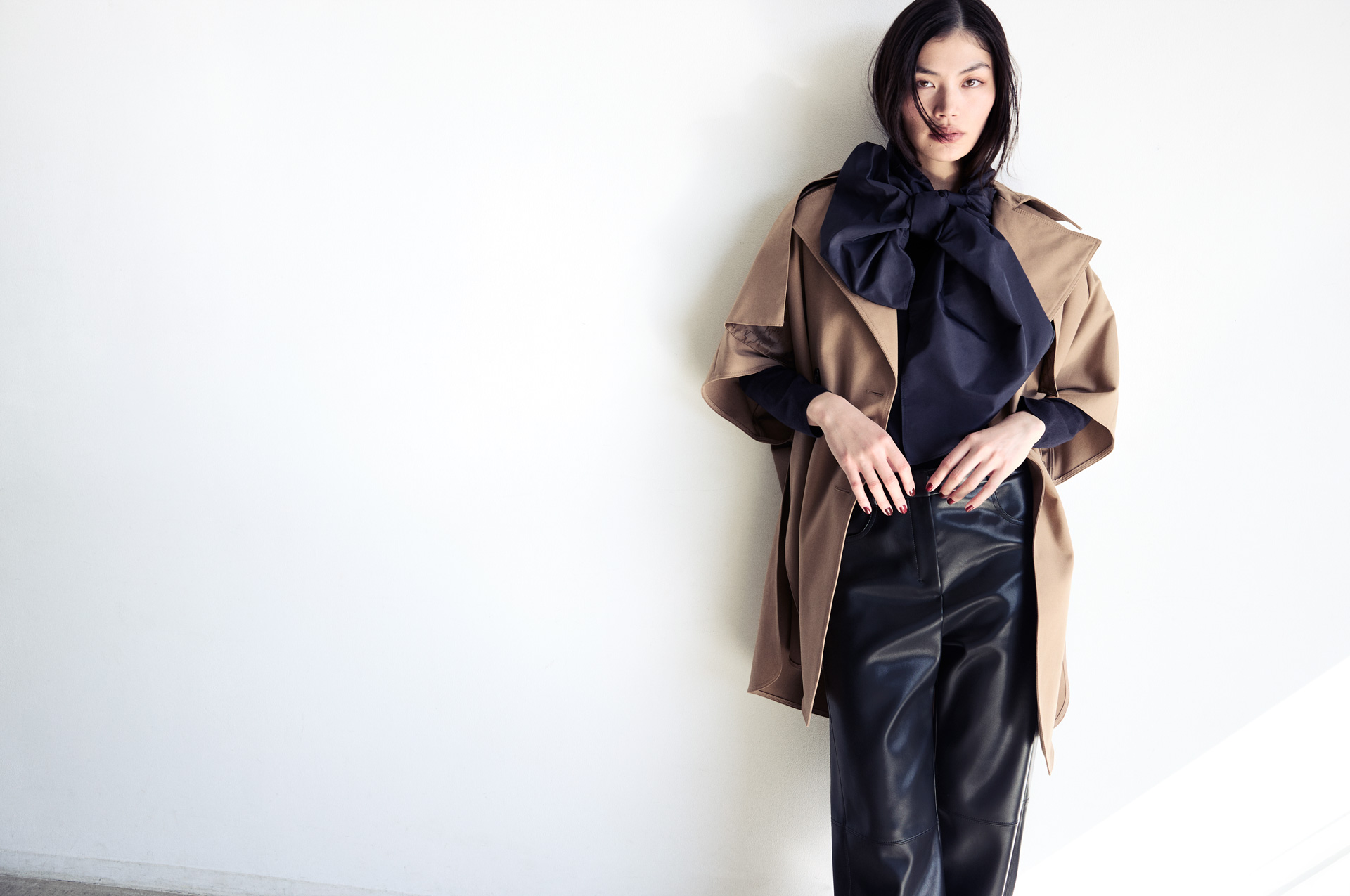 ポンチョ型のアウターに大きく結んだリボンが印象づけ、クラシックなフォルムに柔らかなニュアンスを添える。エコレザーパンツの艶やかな質感が全体を引き締め、シックなカラーパレットの中で意志のある女性像を引き立てる。