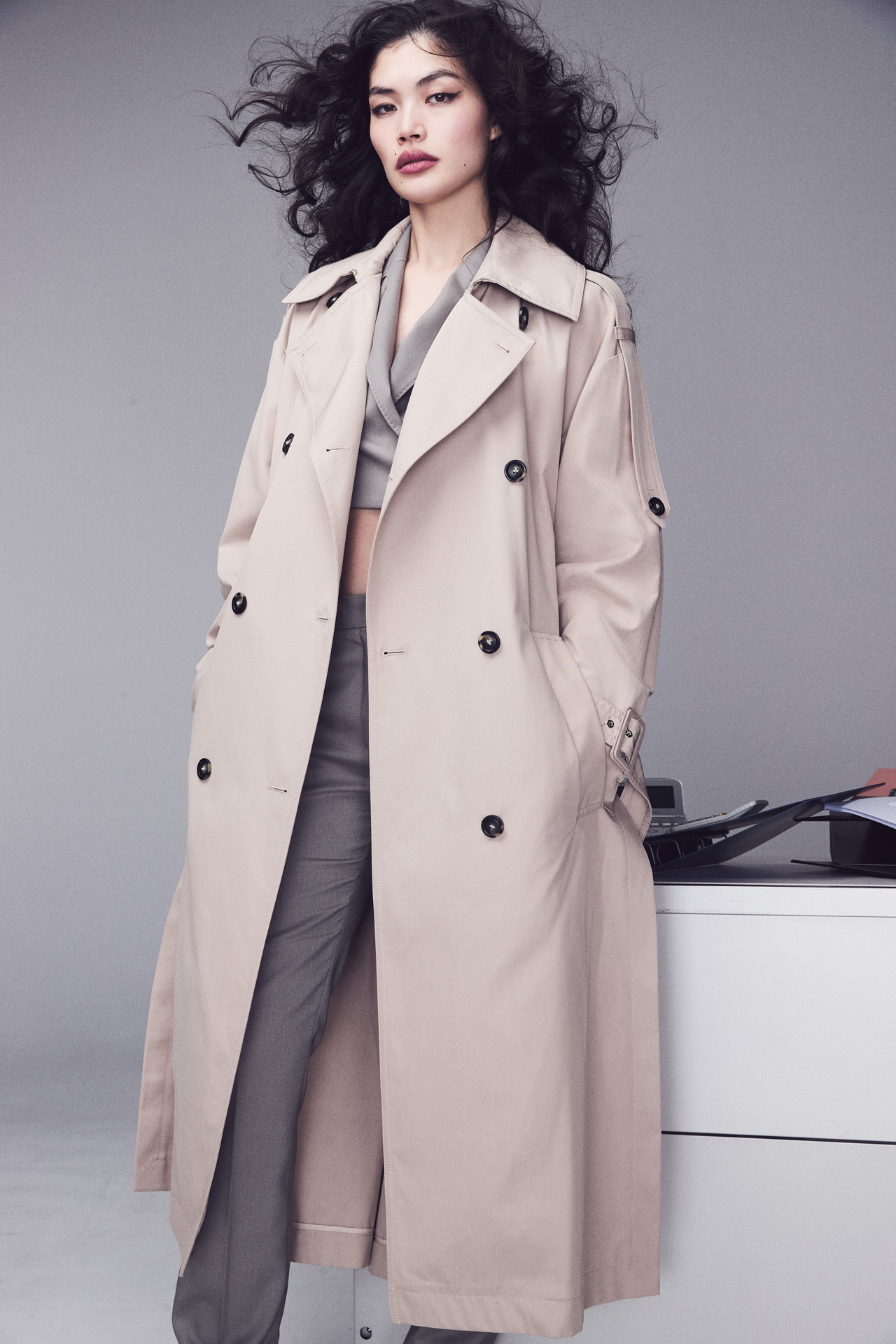 フルレングスに近いロングトレンチをあえて選び、そのシルエットが着る人に余裕と存在感をもたらす。インナーにグレーのジャケットを合わせ、ベージュとのニュートラルトーンでモードな印象へと導く。クラシックに傾きすぎないバランスが、意志をにじませる女性像を描き出す。