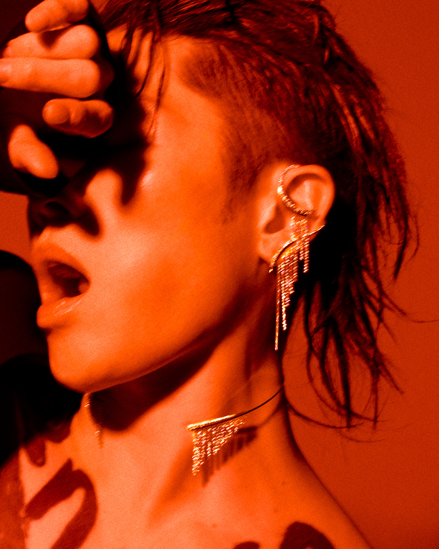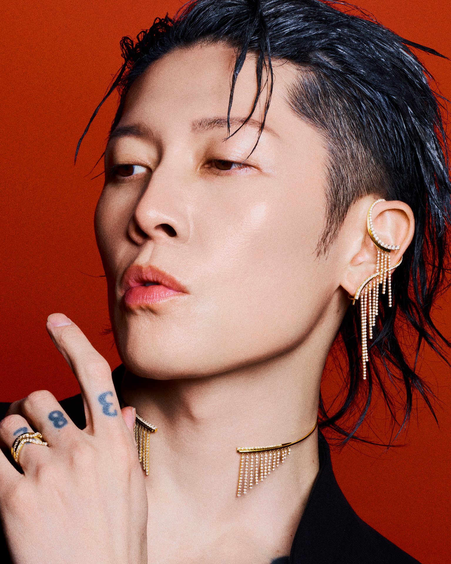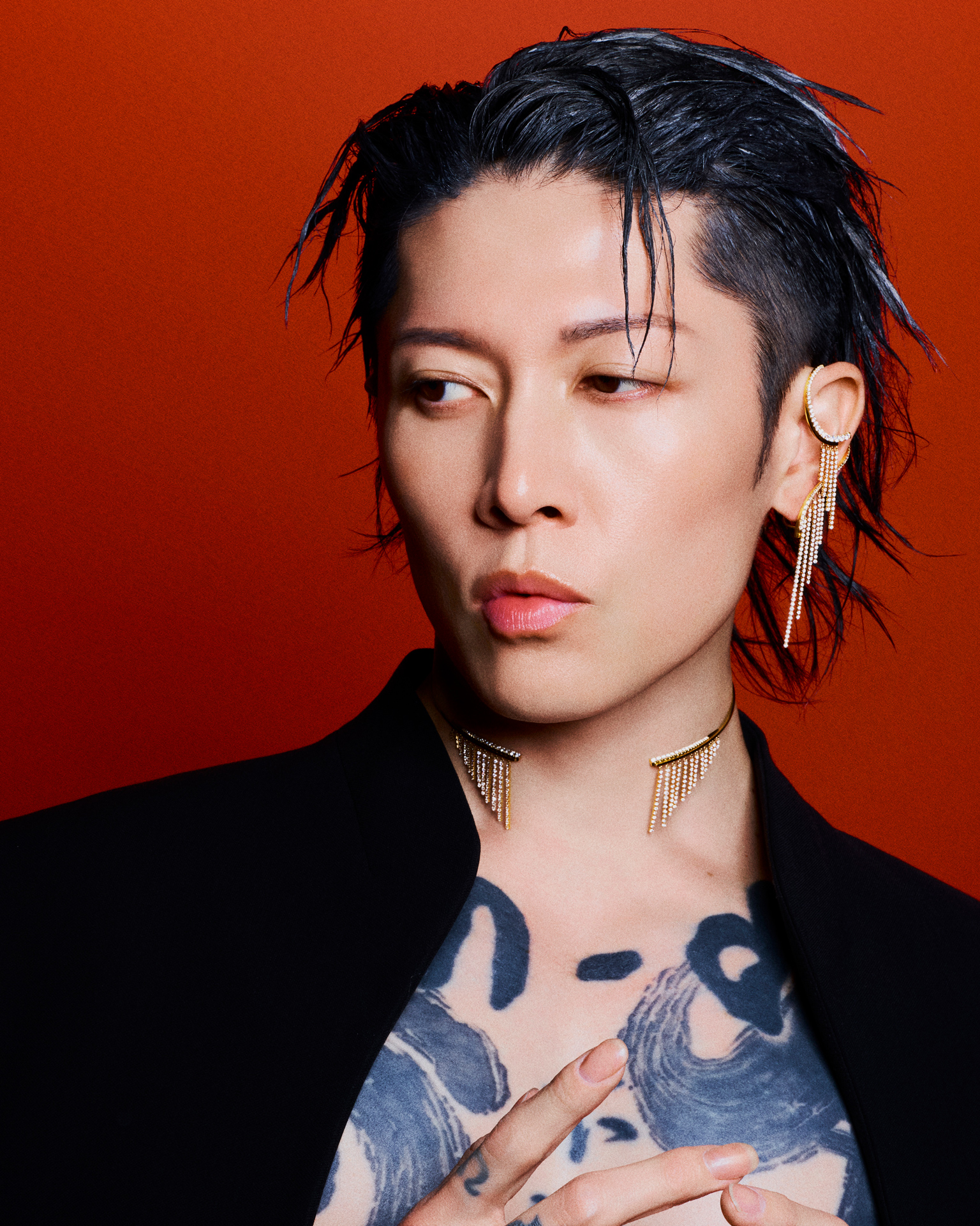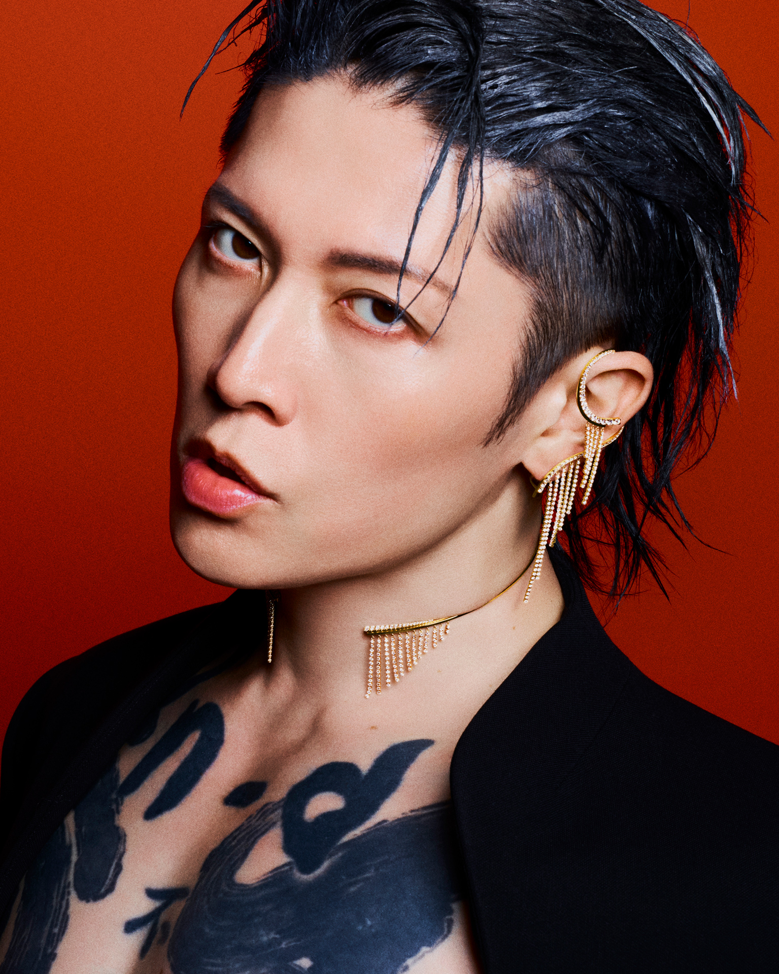 スパイキーにセットしたヘアを振り乱す。かと思えば、ふいに静止し、レンズを一点に見つめる。世界を股にかける“サムライギタリスト”こと、MIYAVI の一挙手一投足から目が離せない。鍛え上げられた身体を引き立てるのは、構築的なショルダーラインを描くジャケットと、大胆な造形が目を惹く AHKAH のアイコン「シャンデリア」のダイヤモンドジュエリー。シャンデリアに着想を得たダイヤモンドのスレッドが、動くたびに揺らめき、デカダンな輝きを放つ。