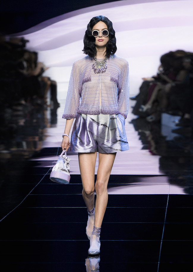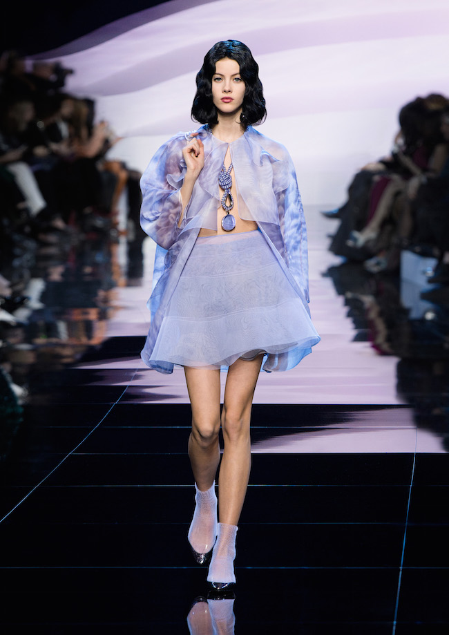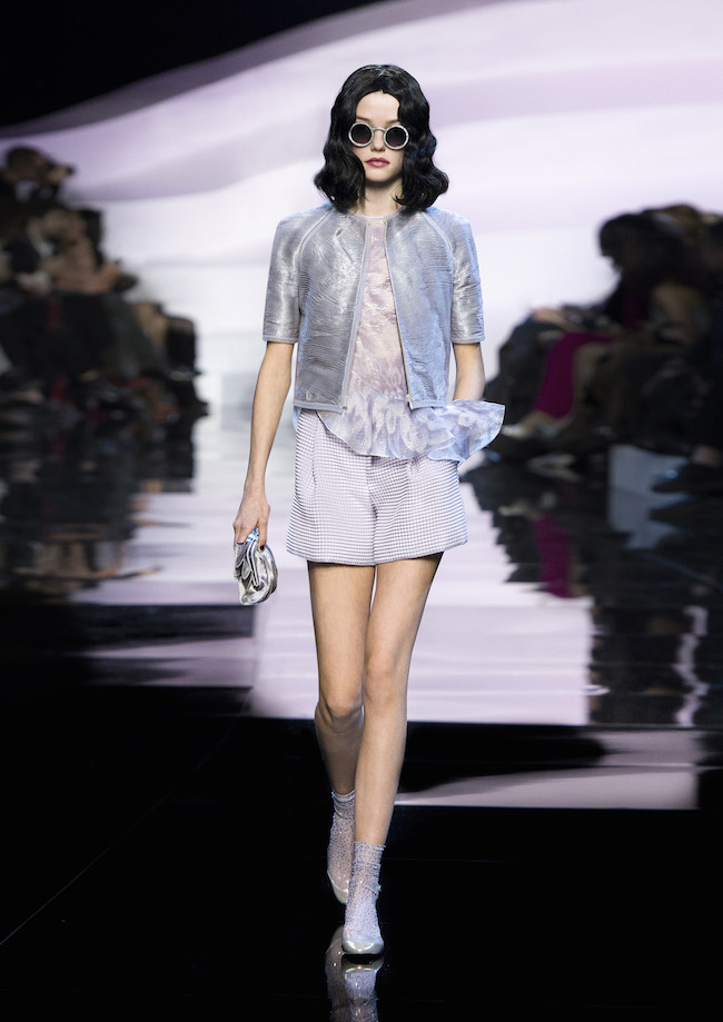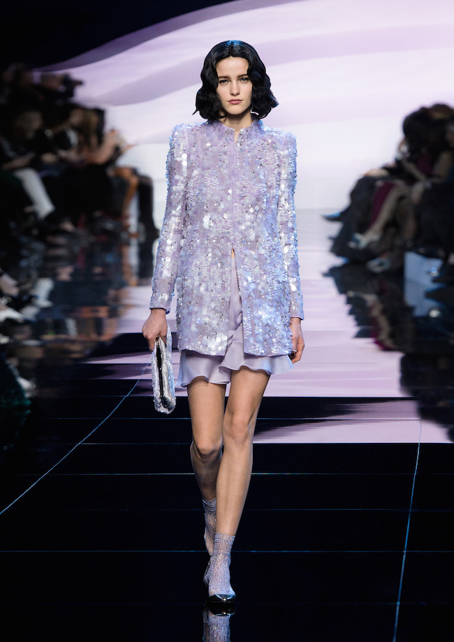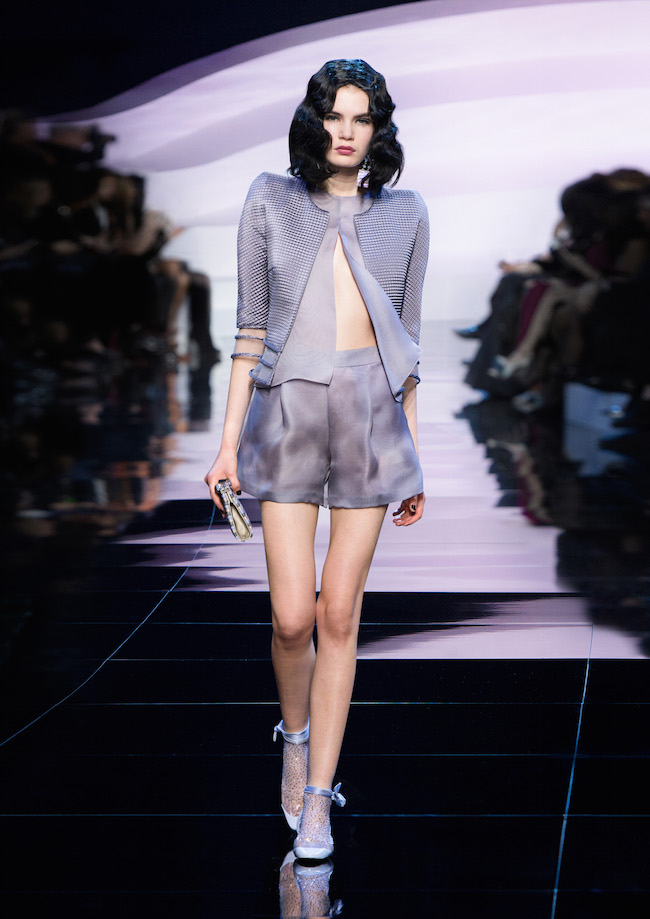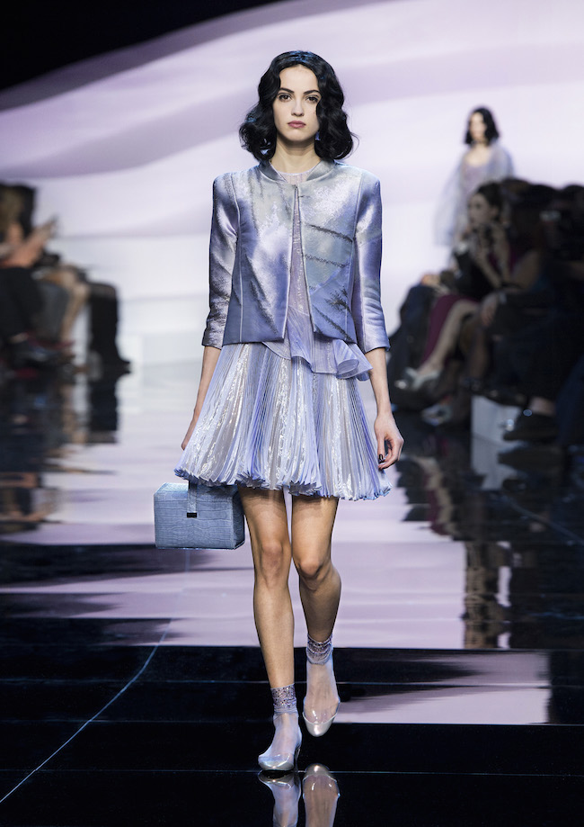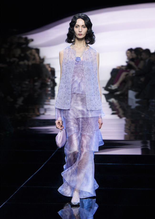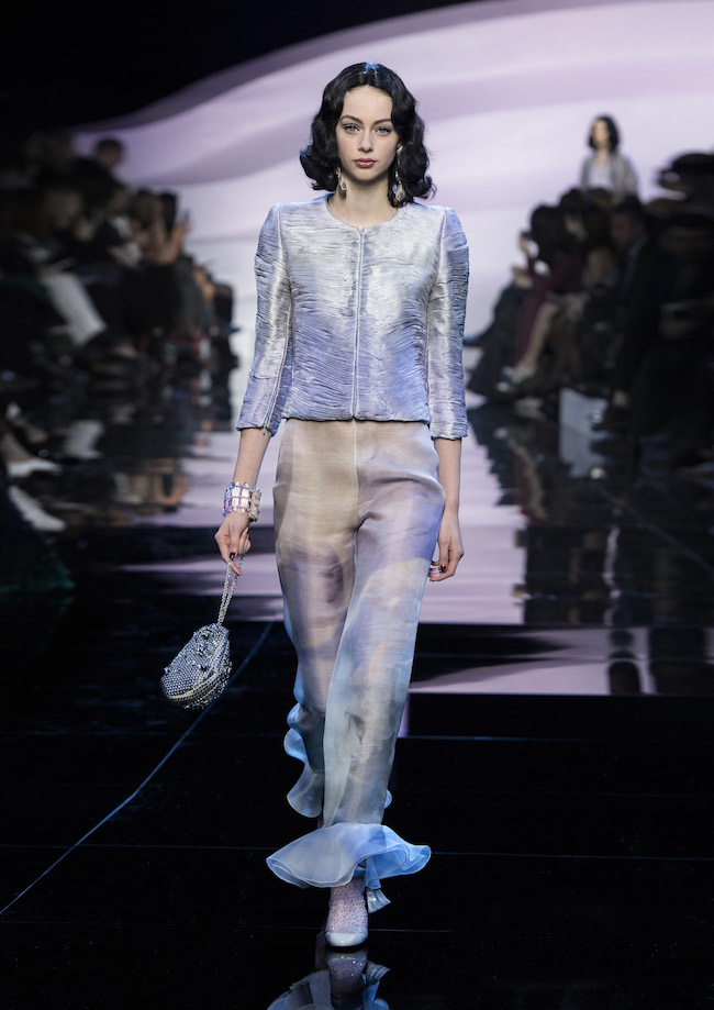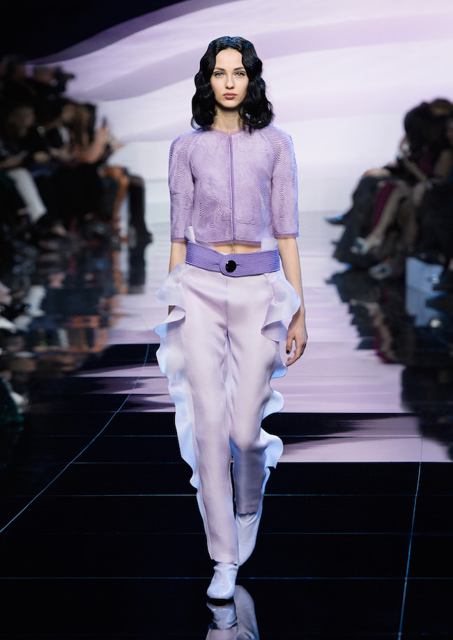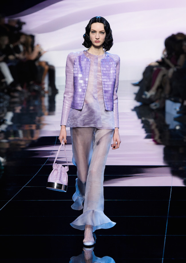 オーガンザを用いたジャケットは、風を孕んだようなラウンドシルエットに仕上げられ、またスクエアショルダーのノーカラージャケットは対比的に柔らかなラッフルを取り入れることにより優美かつ軽やかな印象へとシフト。春夏ならではのシアーな素材使いは、幾多にも重ねたプリーツに仕上げることで風によって白く波を立てた海のようなテクスチャーを表現している。また足元にはクリスタルが縫い付けられたソックスが合わせられ、エレガントな中にフレッシュなあスタイリングが冴えるコレクションとなっている今回のコレクションでモーブをテーマに選んだ理由について Giorgio Armani は「優しい女性的な色を使いたかったので、モーブ色を選びました。モーブは品のある若々しくエレガントな色だと思います。」と語っている。