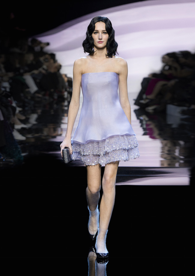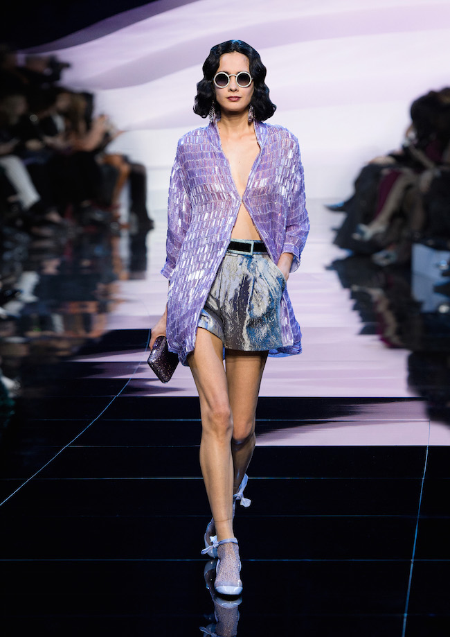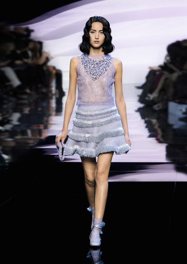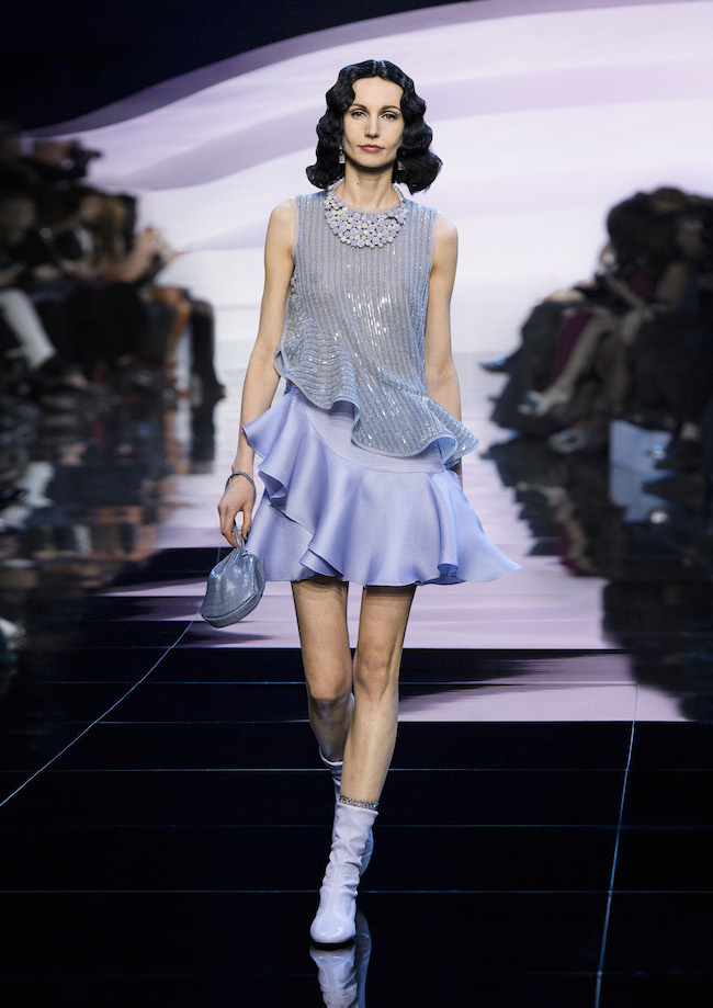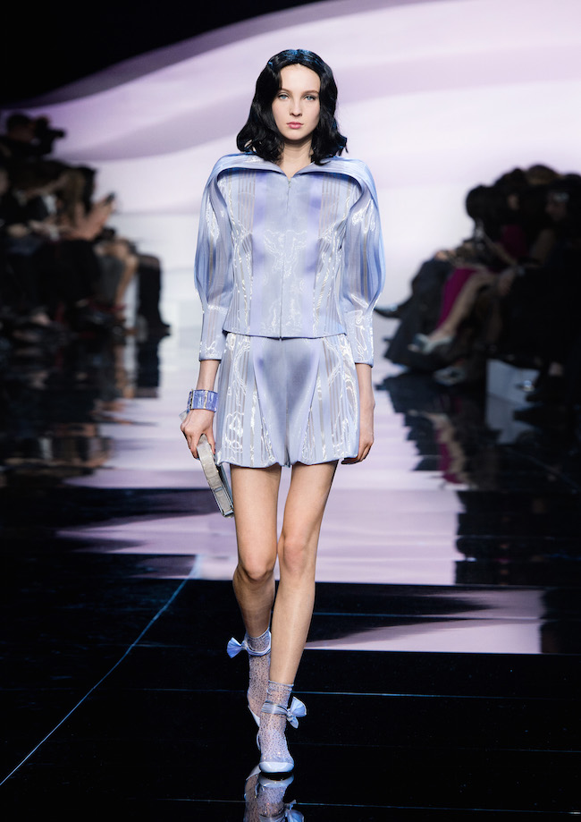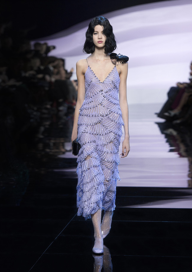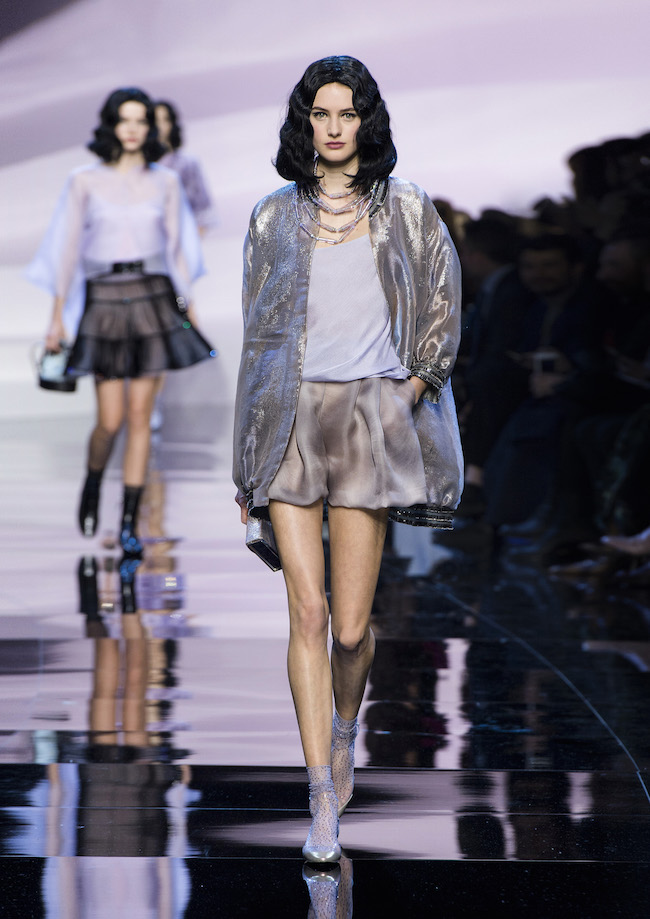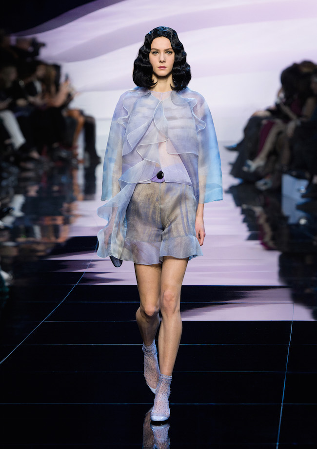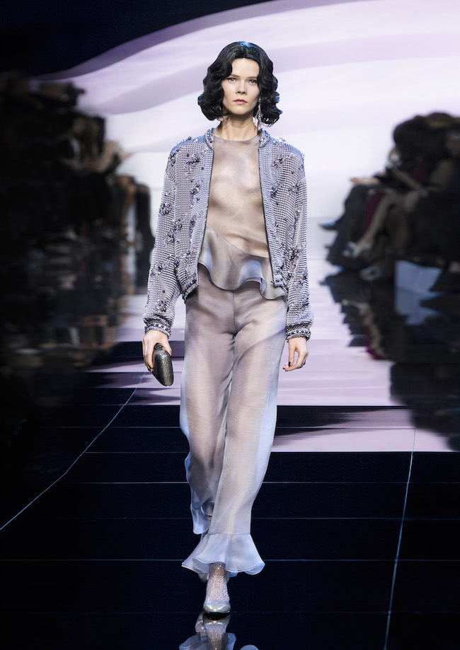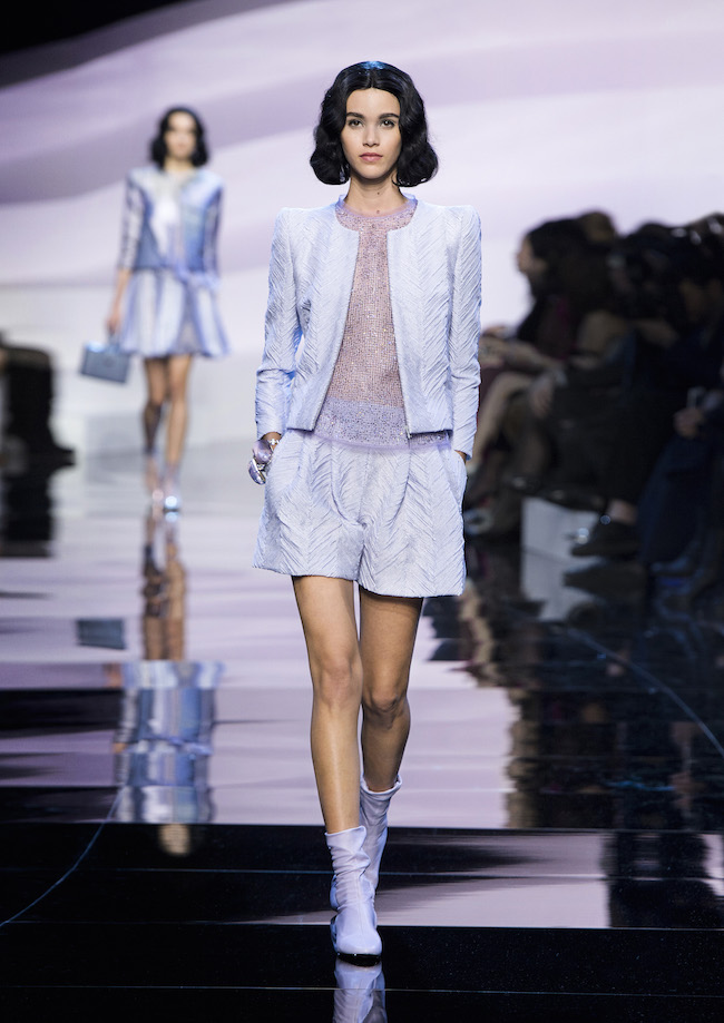 オーガンザを用いたジャケットは、風を孕んだようなラウンドシルエットに仕上げられ、またスクエアショルダーのノーカラージャケットは対比的に柔らかなラッフルを取り入れることにより優美かつ軽やかな印象へとシフト。春夏ならではのシアーな素材使いは、幾多にも重ねたプリーツに仕上げることで風によって白く波を立てた海のようなテクスチャーを表現している。また足元にはクリスタルが縫い付けられたソックスが合わせられ、エレガントな中にフレッシュなあスタイリングが冴えるコレクションとなっている今回のコレクションでモーブをテーマに選んだ理由について Giorgio Armani は「優しい女性的な色を使いたかったので、モーブ色を選びました。モーブは品のある若々しくエレガントな色だと思います。」と語っている。