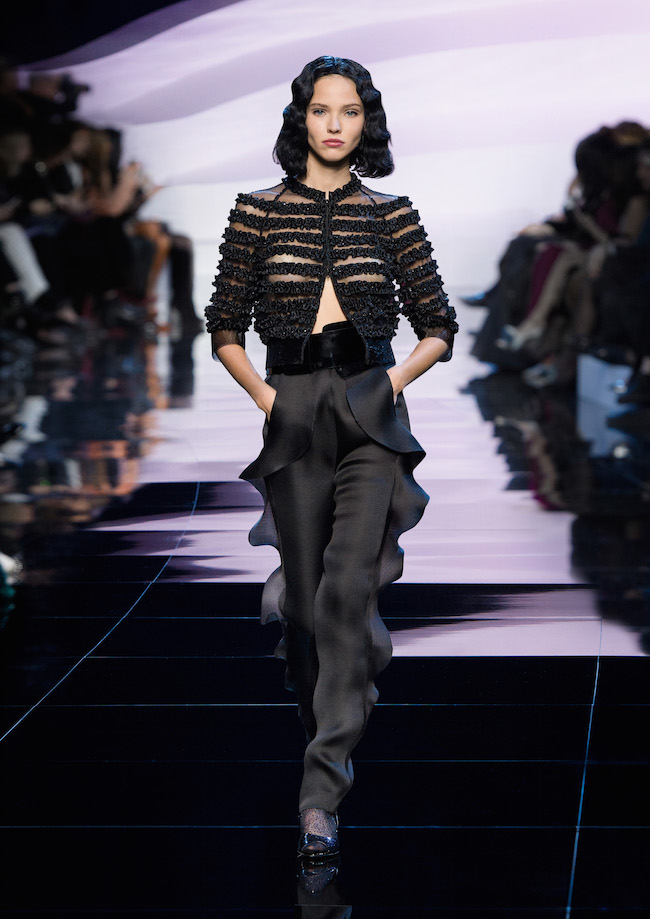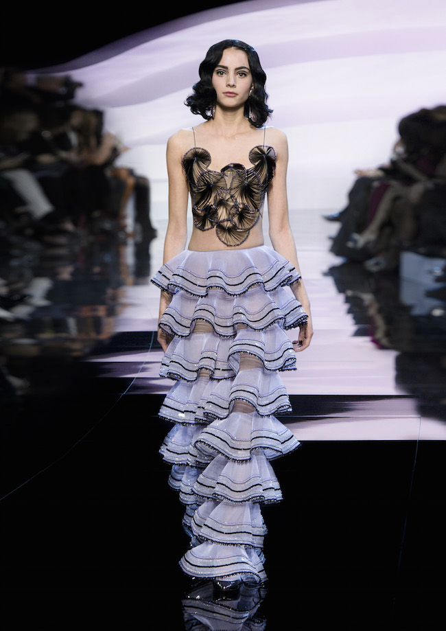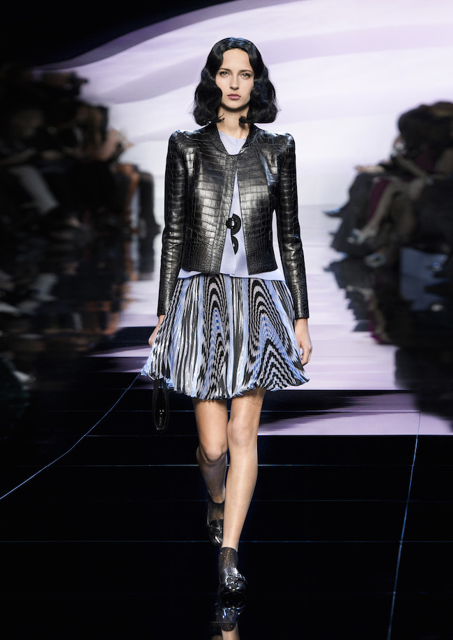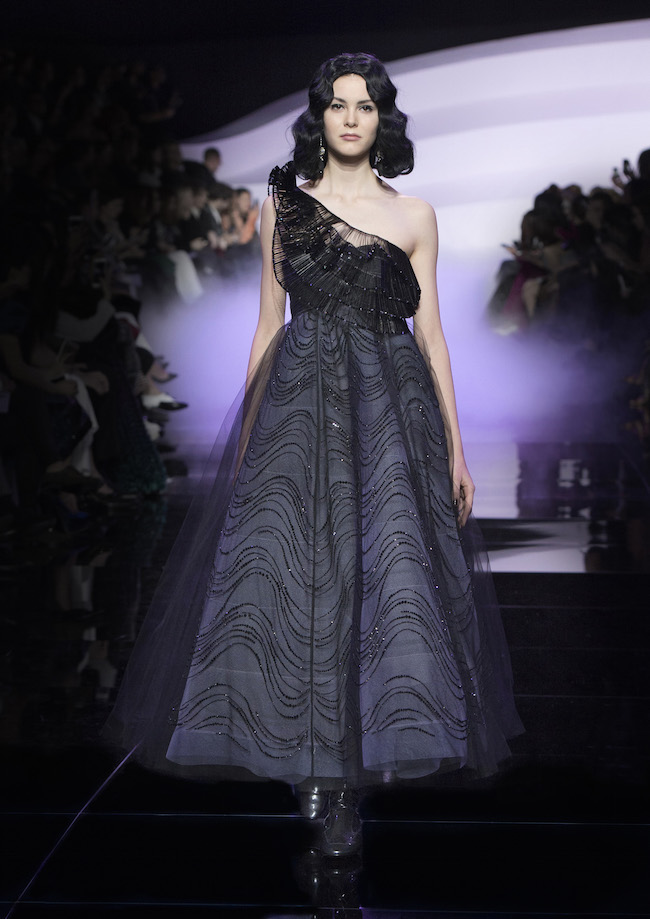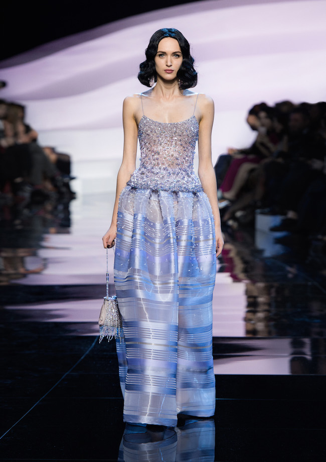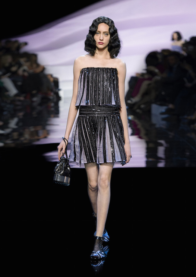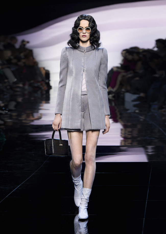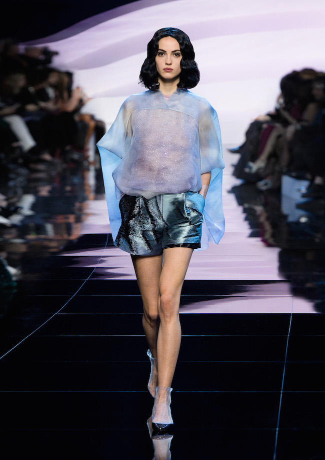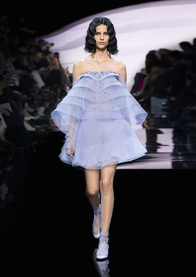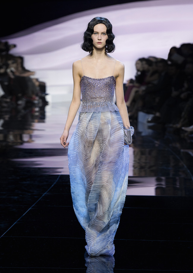 オーガンザを用いたジャケットは、風を孕んだようなラウンドシルエットに仕上げられ、またスクエアショルダーのノーカラージャケットは対比的に柔らかなラッフルを取り入れることにより優美かつ軽やかな印象へとシフト。春夏ならではのシアーな素材使いは、幾多にも重ねたプリーツに仕上げることで風によって白く波を立てた海のようなテクスチャーを表現している。また足元にはクリスタルが縫い付けられたソックスが合わせられ、エレガントな中にフレッシュなあスタイリングが冴えるコレクションとなっている今回のコレクションでモーブをテーマに選んだ理由について Giorgio Armani は「優しい女性的な色を使いたかったので、モーブ色を選びました。モーブは品のある若々しくエレガントな色だと思います。」と語っている。
