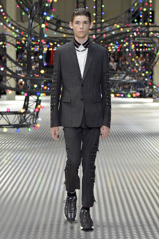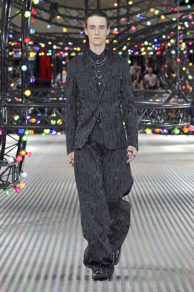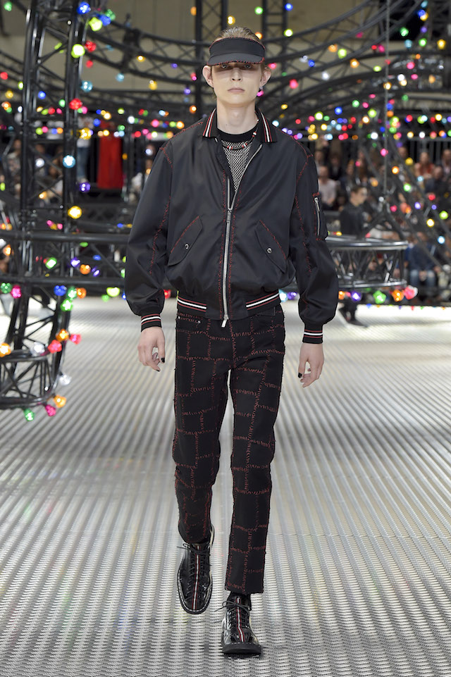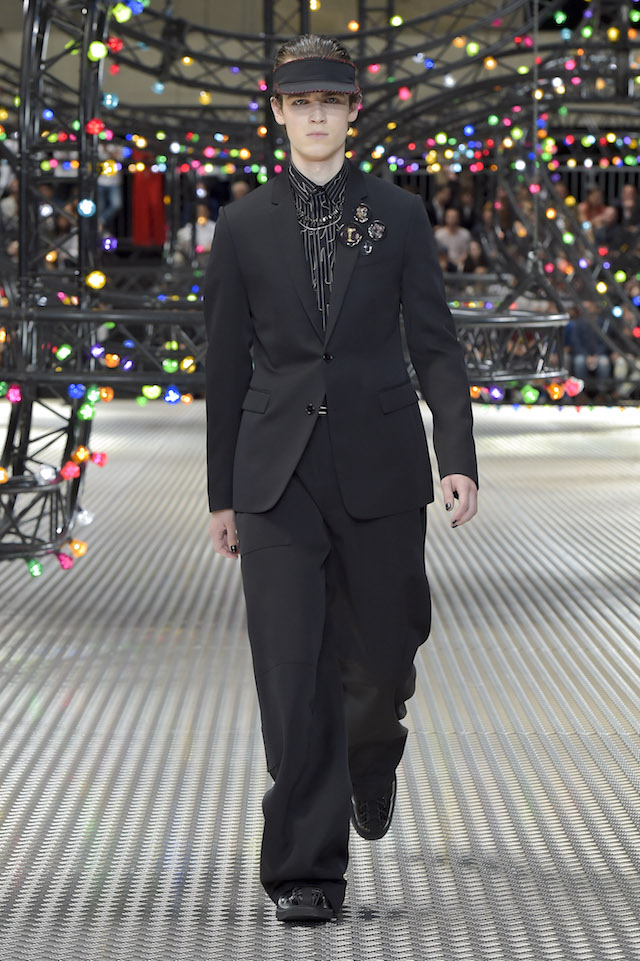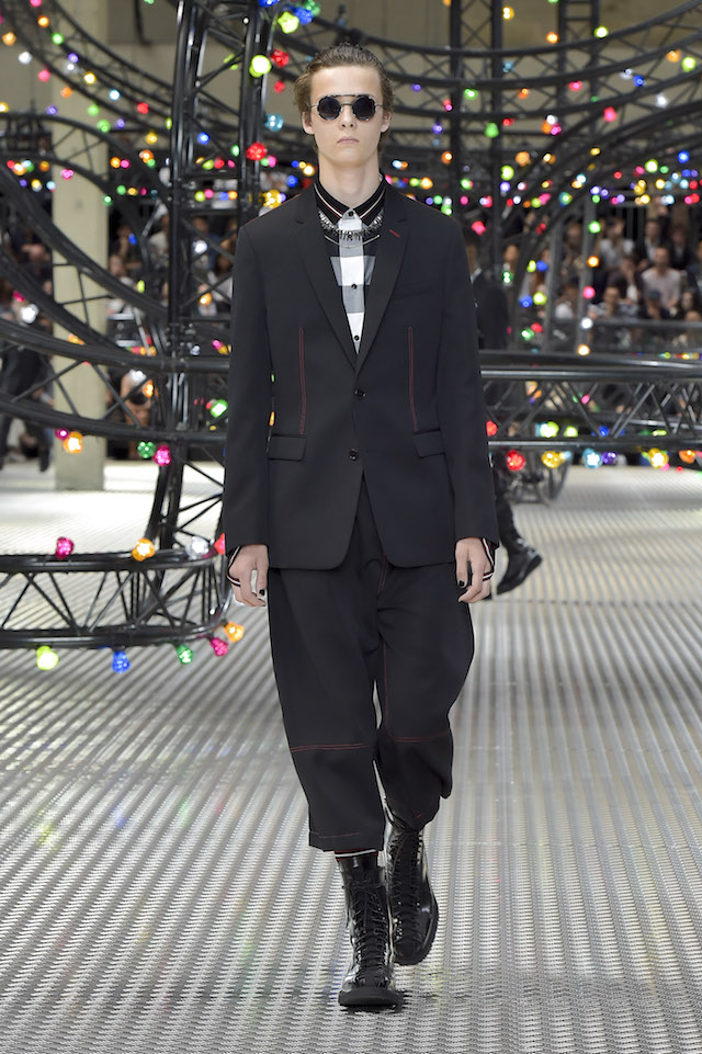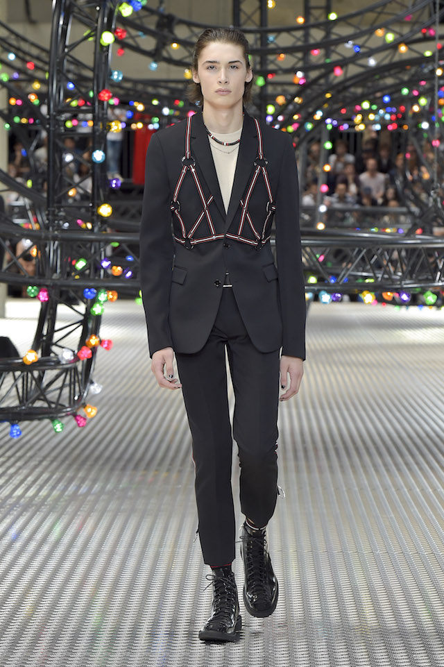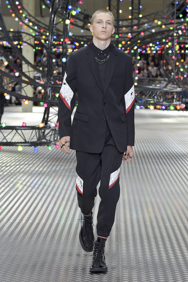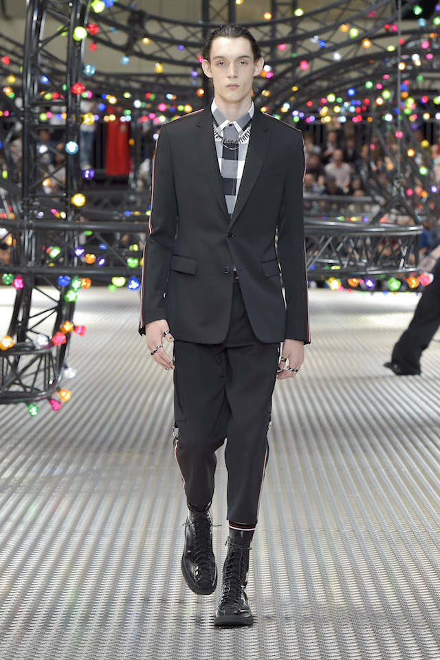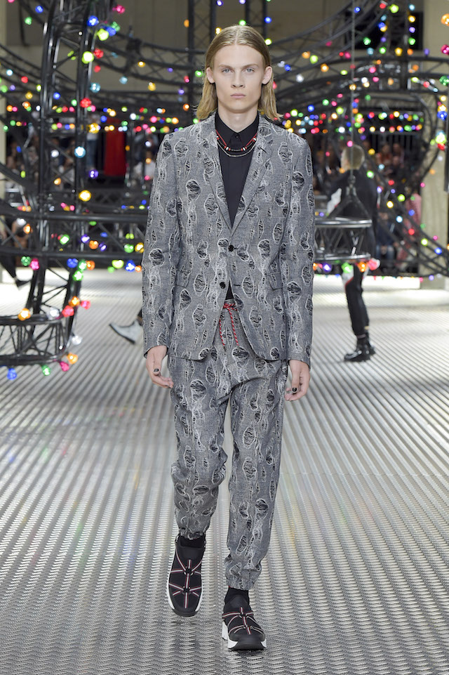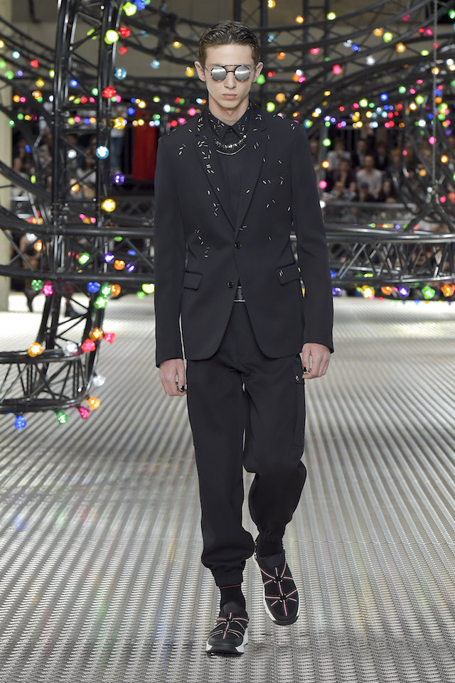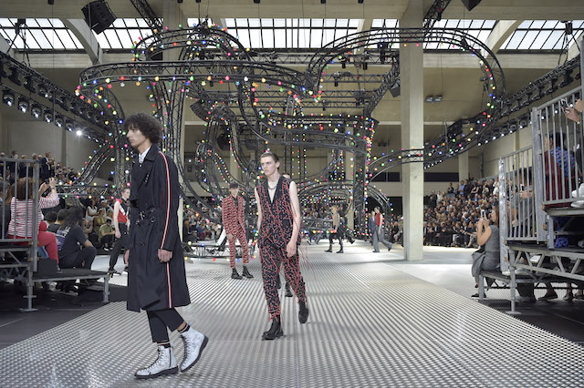 DIOR HOMME (ディオール オム) による2017年サマーコレクションが25日、パリにて発表された。Tennis Club de Paris (テニス・クラブ・ド・パリ) を会場にした今季、クリエイティブ・ディレクターの Kris Van Assche (クリス・ヴァン・アッシュ) がテーマに掲げたのは「Fan Fare (ファンフェア)」。祝祭の開幕を告げる華やかな “ファンファーレ” の如く色とりどりの電飾で彩られた会場は、それと同時にどこか無秩序かつインダストリアルなミザンセーヌを作り上げた。