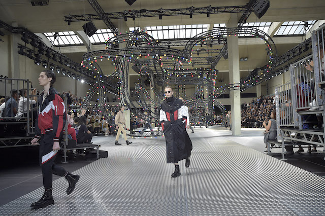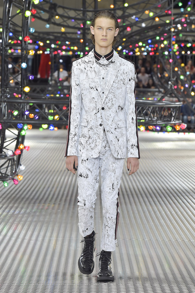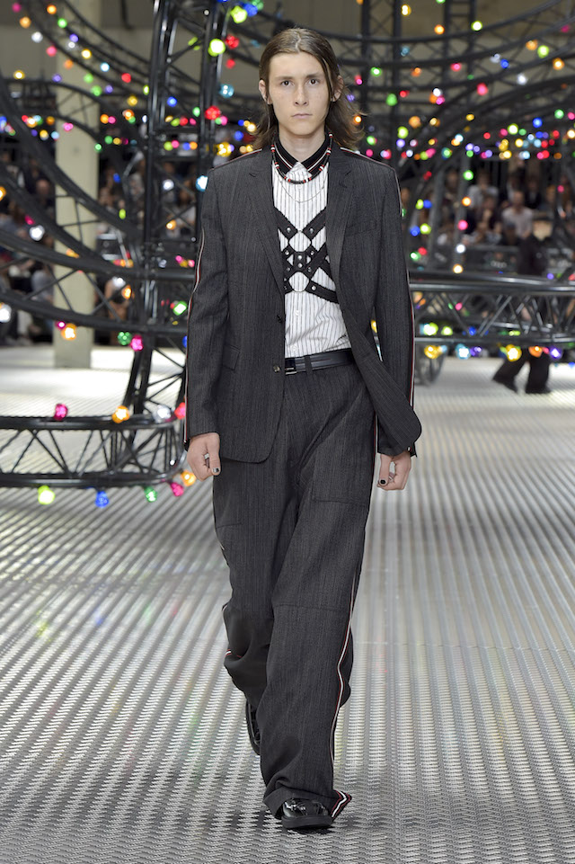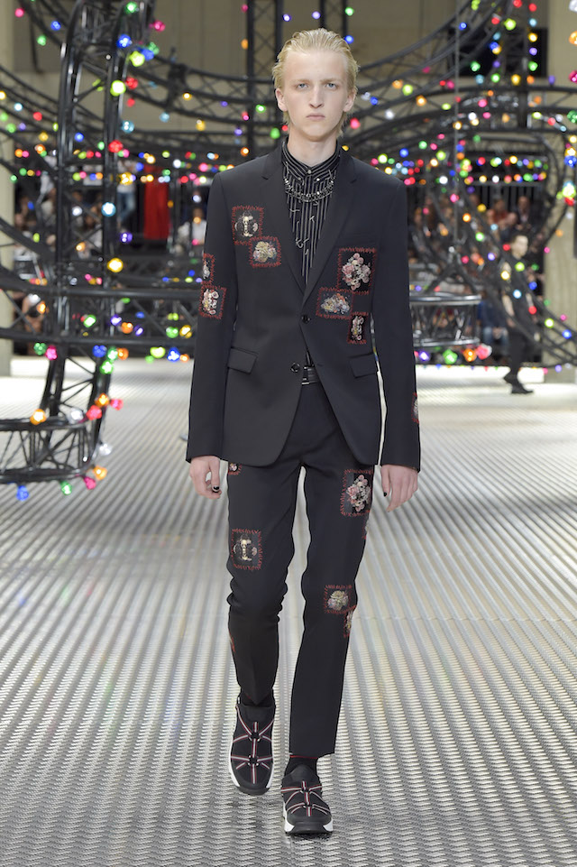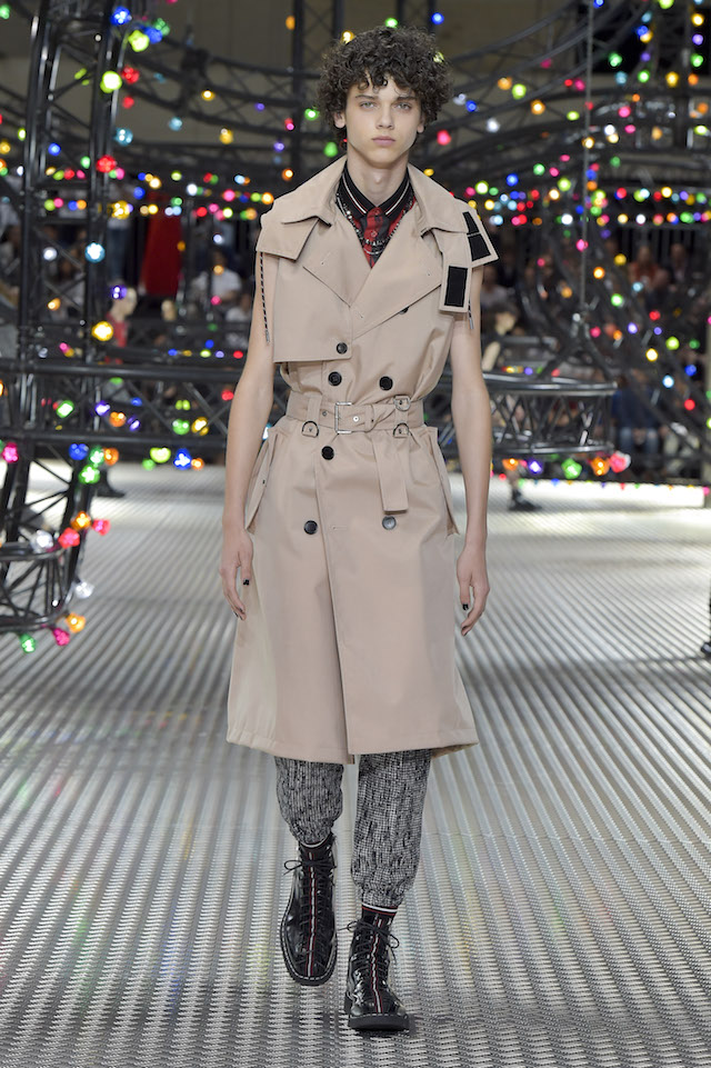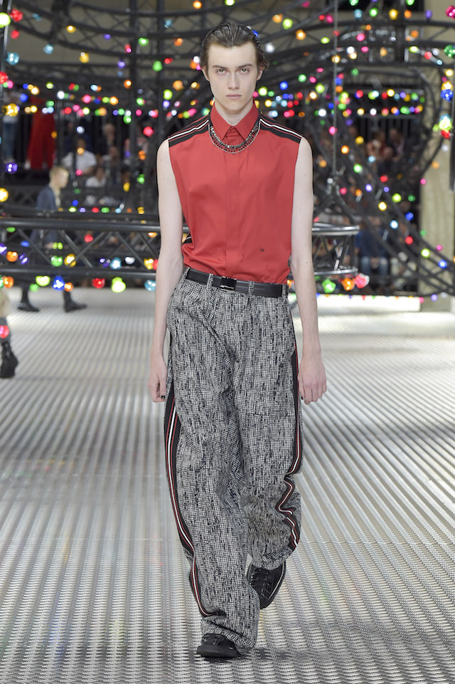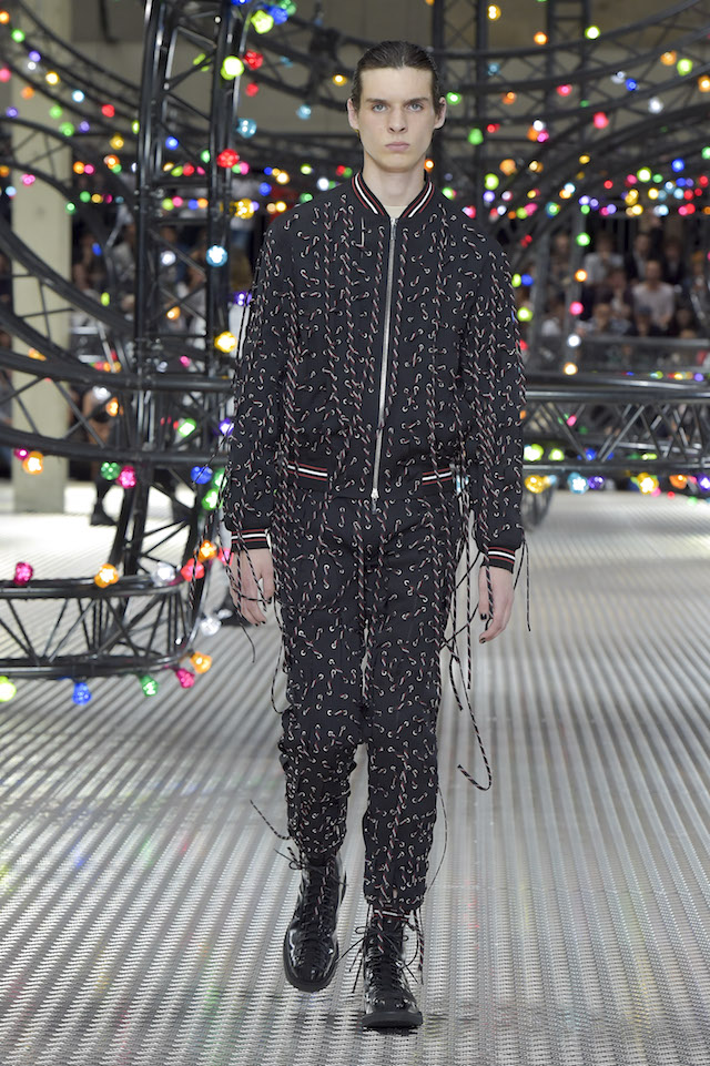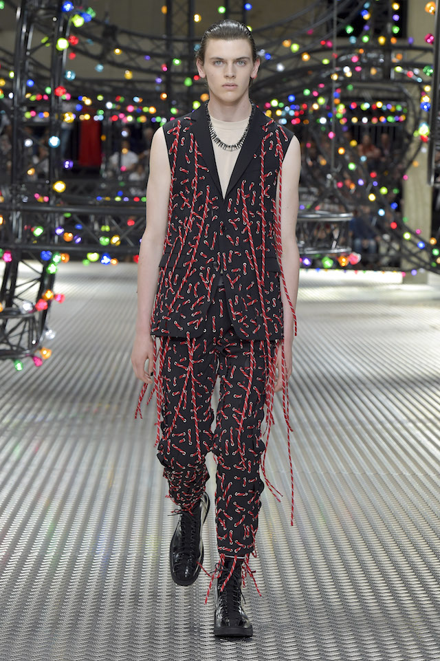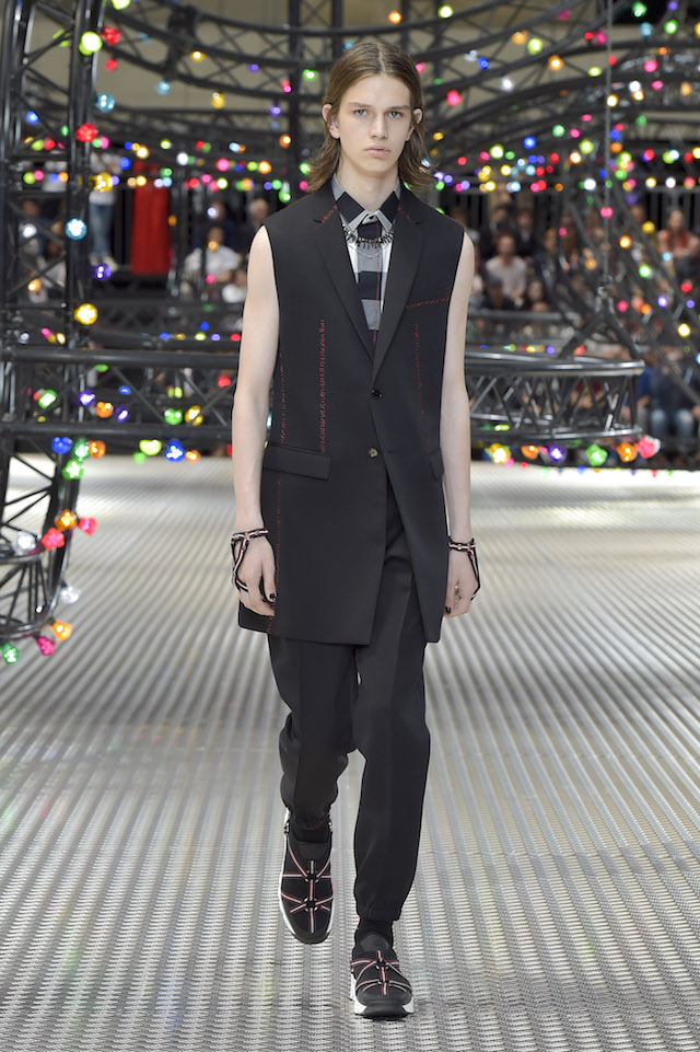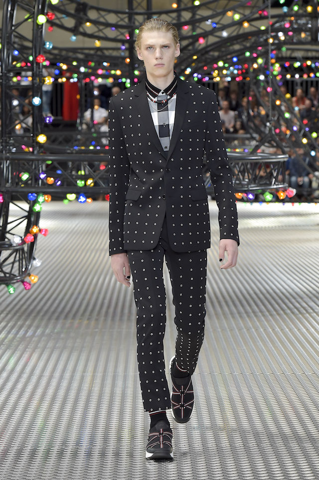 DIOR HOMME (ディオール オム) による2017年サマーコレクションが25日、パリにて発表された。Tennis Club de Paris (テニス・クラブ・ド・パリ) を会場にした今季、クリエイティブ・ディレクターの Kris Van Assche (クリス・ヴァン・アッシュ) がテーマに掲げたのは「Fan Fare (ファンフェア)」。祝祭の開幕を告げる華やかな “ファンファーレ” の如く色とりどりの電飾で彩られた会場は、それと同時にどこか無秩序かつインダストリアルなミザンセーヌを作り上げた。